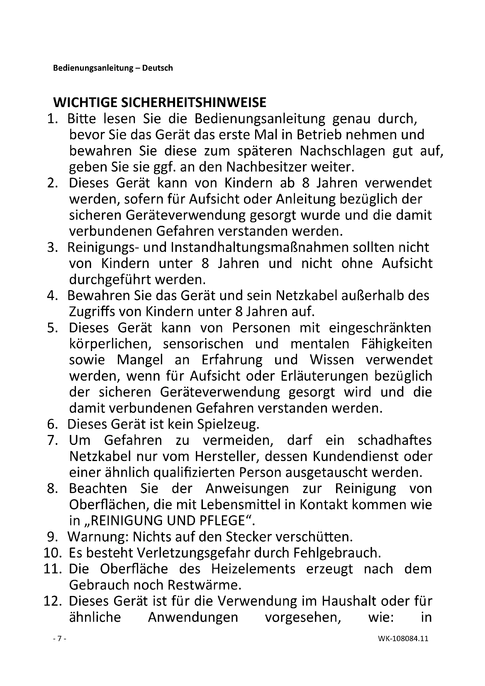 Verletzungen dürfen das Kabel, der Netzstecker und der Wasserkocher nicht in Wasser oder andere Flüssigkeiten getaucht werden.- 9 - WK-108084.11