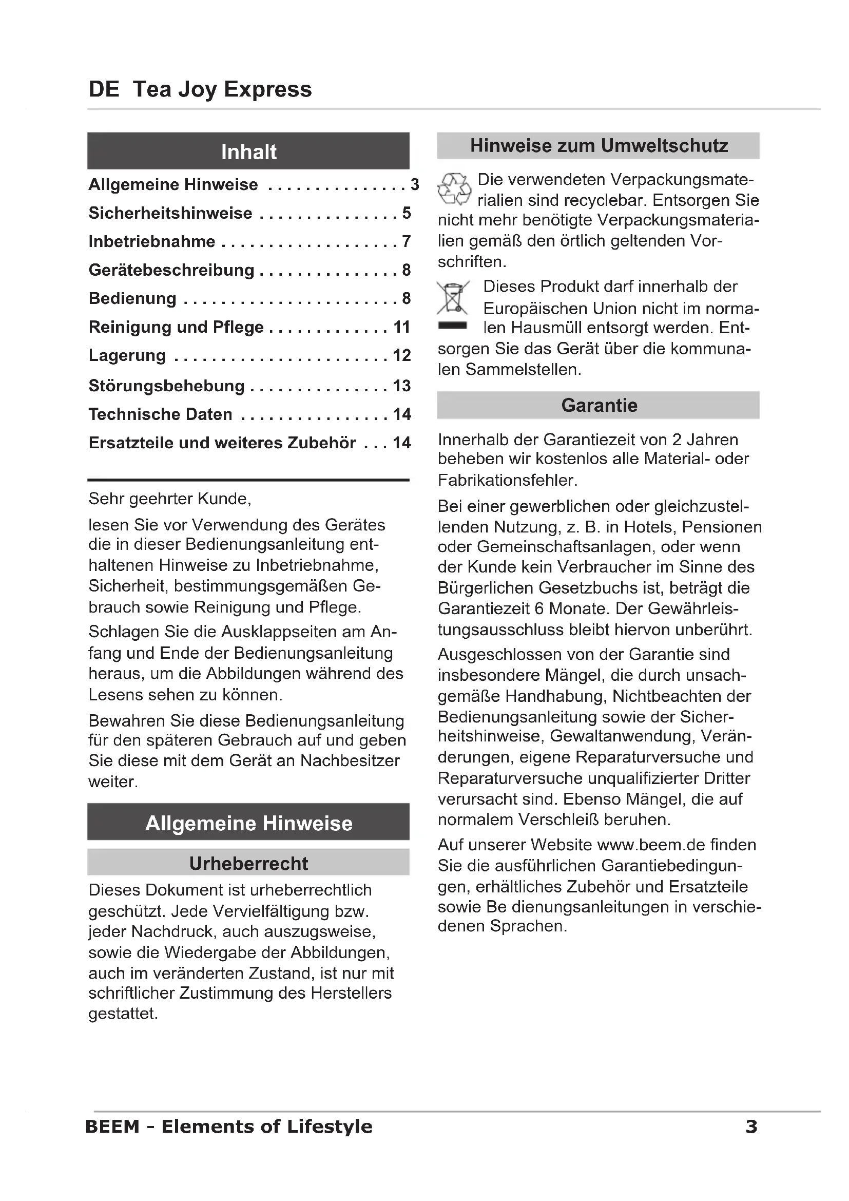 - DE Tea Joy Express BEEM - Elements of Lifestyle Sehr geehrter Kunde, lesen Sie vor Verwendung des Gerätes die in dieser Bedienungsanleitung ent- haltenen Hinweise zu Inbetriebnahme, Sicherheit, bestimmungsgemäßen Ge- brauch sowie Reinigung und Pege. Schlagen Sie die Ausklappseiten am An- fang und Ende der Bedienungsanleitung heraus, um die Abbildungen während des Lesens sehen zu können. Bewahren Sie diese Bedienungsanleitung für den späteren Gebrauch auf und geben Sie diese mit dem Gerät an Nachbesitzer weiter. Allgemeine Hinweise Urheberrecht Dieses Dokument ist urheberrechtlich geschützt. Jede Vervielfältigung bzw. jeder Nachdruck, auch auszugsweise, sowie die Wiedergabe der Abbildungen, auch im veränderten Zustand, ist nur mit schriftlicher Zustimmung des Herstellers gestattet. Hinweise zum Umweltschutz Die verwendeten Verpackungsmate- rialien sind recyclebar. Entsorgen Sie nicht mehr benötigte Verpackungsmateria- lien gemäß den örtlich geltenden Vor- schriften. Dieses Produkt darf innerhalb der Europäischen Union nicht im norma- len Hausmüll entsorgt werden. Ent- sorgen Sie das Gerät über die kommuna- len Sammelstellen. Garantie Innerhalb der Garantiezeit von 2 Jahren beheben wir kostenlos alle Material- oder Fabrikationsfehler. Bei einer gewerblichen oder gleichzustel- lenden Nutzung, z. B. in Hotels, Pensionen oder Gemeinschaftsanlagen, oder wenn der Kunde kein Verbraucher im Sinne des Bürgerlichen Gesetzbuchs ist, beträgt die Garantiezeit 6 Monate. Der Gewährleis- tungsausschluss bleibt hiervon unberührt. Ausgeschlossen von der Garantie sind insbesondere Mängel, die durch unsach- gemäße Handhabung, Nichtbeachten der Bedienungsanleitung sowie der Sicher- heitshinweise, Gewaltanwendung, Verän- derungen, eigene Reparaturversuche und Reparaturversuche unqualizierter Dritter verursacht sind. Ebenso Mängel, die auf normalem Verschleiß beruhen. Auf unserer Website www.beem.de nden Sie die ausführlichen Garantiebedingun- gen, erhältliches Zubehör und Ersatzteile sowie Be dienungsanleitungen in verschie- denen Sprachen. Allgemeine Hinweise p. 3