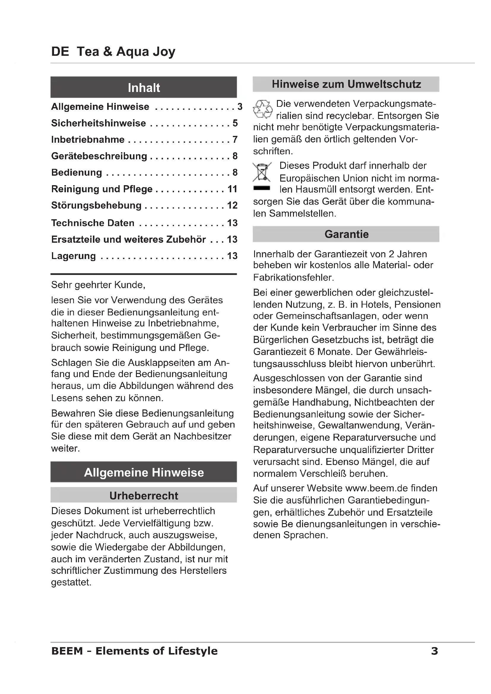 - DE Tea & Aqua Joy BEEM - Elements of Lifestyle Sehr geehrter Kunde, lesen Sie vor Verwendung des Gerätes die in dieser Bedienungsanleitung ent- haltenen Hinweise zu Inbetriebnahme, Sicherheit, bestimmungsgemäßen Ge- brauch sowie Reinigung und Pege. Schlagen Sie die Ausklappseiten am An- fang und Ende der Bedienungsanleitung heraus, um die Abbildungen während des Lesens sehen zu können. Bewahren Sie diese Bedienungsanleitung für den späteren Gebrauch auf und geben Sie diese mit dem Gerät an Nachbesitzer weiter. Allgemeine Hinweise Urheberrecht Dieses Dokument ist urheberrechtlich geschützt. Jede Vervielfältigung bzw. jeder Nachdruck, auch auszugsweise, sowie die Wiedergabe der Abbildungen, auch im veränderten Zustand, ist nur mit schriftlicher Zustimmung des Herstellers gestattet. Hinweise zum Umweltschutz Die verwendeten Verpackungsmate- rialien sind recyclebar. Entsorgen Sie nicht mehr benötigte Verpackungsmateria- lien gemäß den örtlich geltenden Vor- schriften. Dieses Produkt darf innerhalb der Europäischen Union nicht im norma- len Hausmüll entsorgt werden. Ent- sorgen Sie das Gerät über die kommuna- len Sammelstellen. Garantie Innerhalb der Garantiezeit von 2 Jahren beheben wir kostenlos alle Material- oder Fabrikationsfehler. Bei einer gewerblichen oder gleichzustel- lenden Nutzung, z. B. in Hotels, Pensionen oder Gemeinschaftsanlagen, oder wenn der Kunde kein Verbraucher im Sinne des Bürgerlichen Gesetzbuchs ist, beträgt die Garantiezeit 6 Monate. Der Gewährleis- tungsausschluss bleibt hiervon unberührt. Ausgeschlossen von der Garantie sind insbesondere Mängel, die durch unsach- gemäße Handhabung, Nichtbeachten der Bedienungsanleitung sowie der Sicher- heitshinweise, Gewaltanwendung, Verän- derungen, eigene Reparaturversuche und Reparaturversuche unqualizierter Dritter verursacht sind. Ebenso Mängel, die auf normalem Verschleiß beruhen. Auf unserer Website www.beem.de nden Sie die ausführlichen Garantiebedingun- gen, erhältliches Zubehör und Ersatzteile sowie Be dienungsanleitungen in verschie- denen Sprachen. Allgemeine Hinweise p. 3