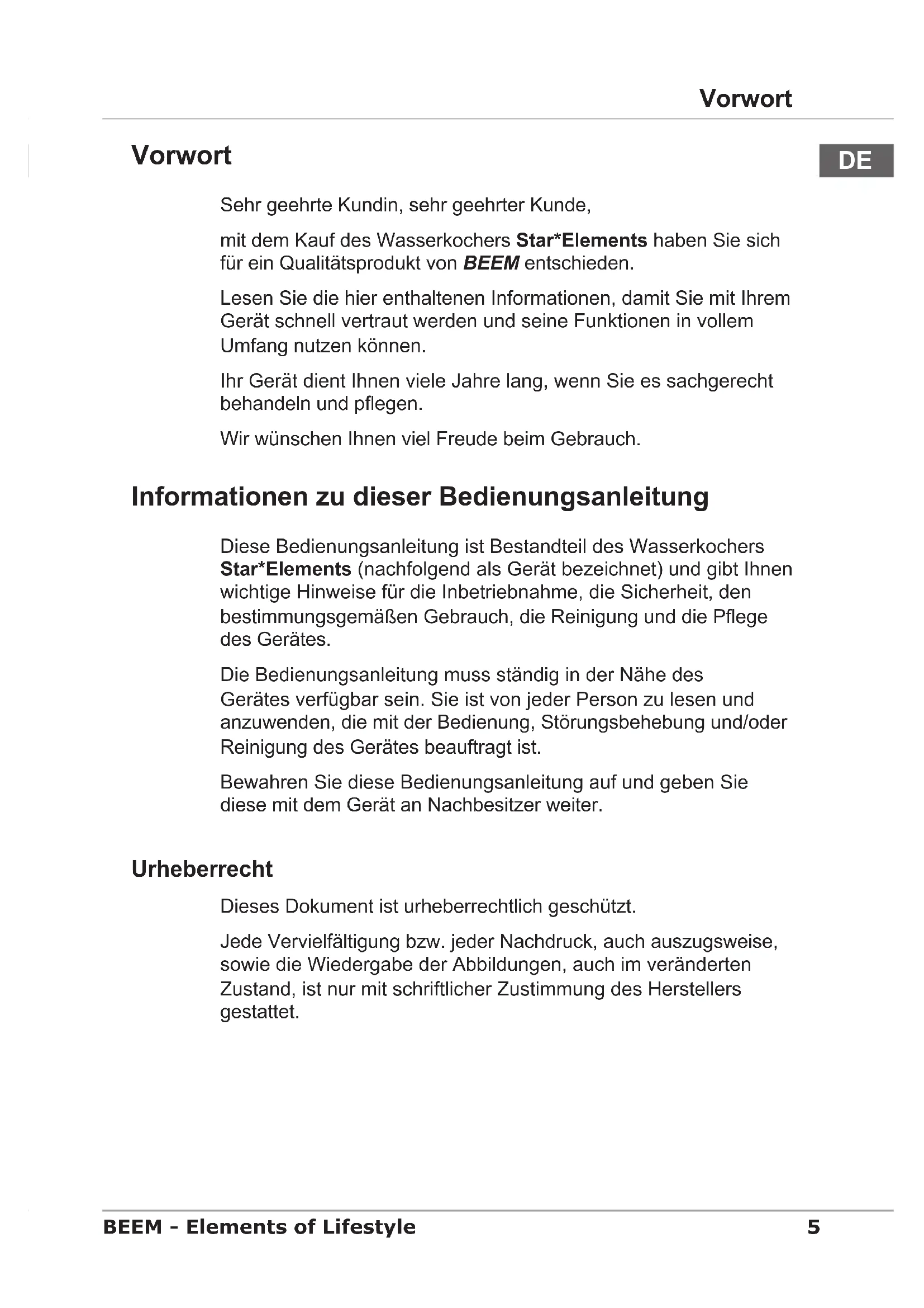 Vorwort Sehr geehrte Kundin, sehr geehrter Kunde, mit dem Kauf des Wasserkochers Star*Elements haben Sie sich für ein Qualitätsprodukt von BEEM entschieden. Lesen Sie die hier enthaltenen Informationen, damit Sie mit Ihrem Gerät schnell vertraut werden und seine Funktionen in vollem Umfang nutzen können. Ihr Gerät dient Ihnen viele Jahre lang, wenn Sie es sachgerecht behandeln und pegen. Wir wünschen Ihnen viel Freude beim Gebrauch. Informationen zu dieser Bedienungsanleitung Diese Bedienungsanleitung ist Bestandteil des Wasserkochers Star*Elements (nachfolgend als Gerät bezeichnet) und gibt Ihnen wichtige Hinweise für die Inbetriebnahme, die Sicherheit, den bestimmungsgemäßen Gebrauch, die Reinigung und die Pege des Gerätes. Die Bedienungsanleitung muss ständig in der Nähe des Gerätes verfügbar sein. Sie ist von jeder Person zu lesen und anzuwenden, die mit der Bedienung, Störungsbehebung und/oder Reinigung des Gerätes beauftragt ist. Bewahren Sie diese Bedienungsanleitung auf und geben Sie diese mit dem Gerät an Nachbesitzer weiter. Urheberrecht Dieses Dokument ist urheberrechtlich geschützt. Jede Vervielfältigung bzw. jeder Nachdruck, auch auszugsweise, sowie die Wiedergabe der Abbildungen, auch im veränderten Zustand, ist nur mit schriftlicher Zustimmung des Herstellers gestattet.6 Informationen zu dieser Bedienungsanleitung BEEM - Elements of Lifestyle