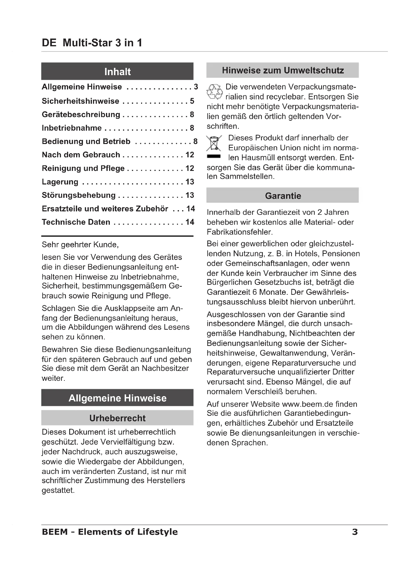 BEDIENUNGSANLEITUNG MultiStar 3 in 1 B16.001 BEEM