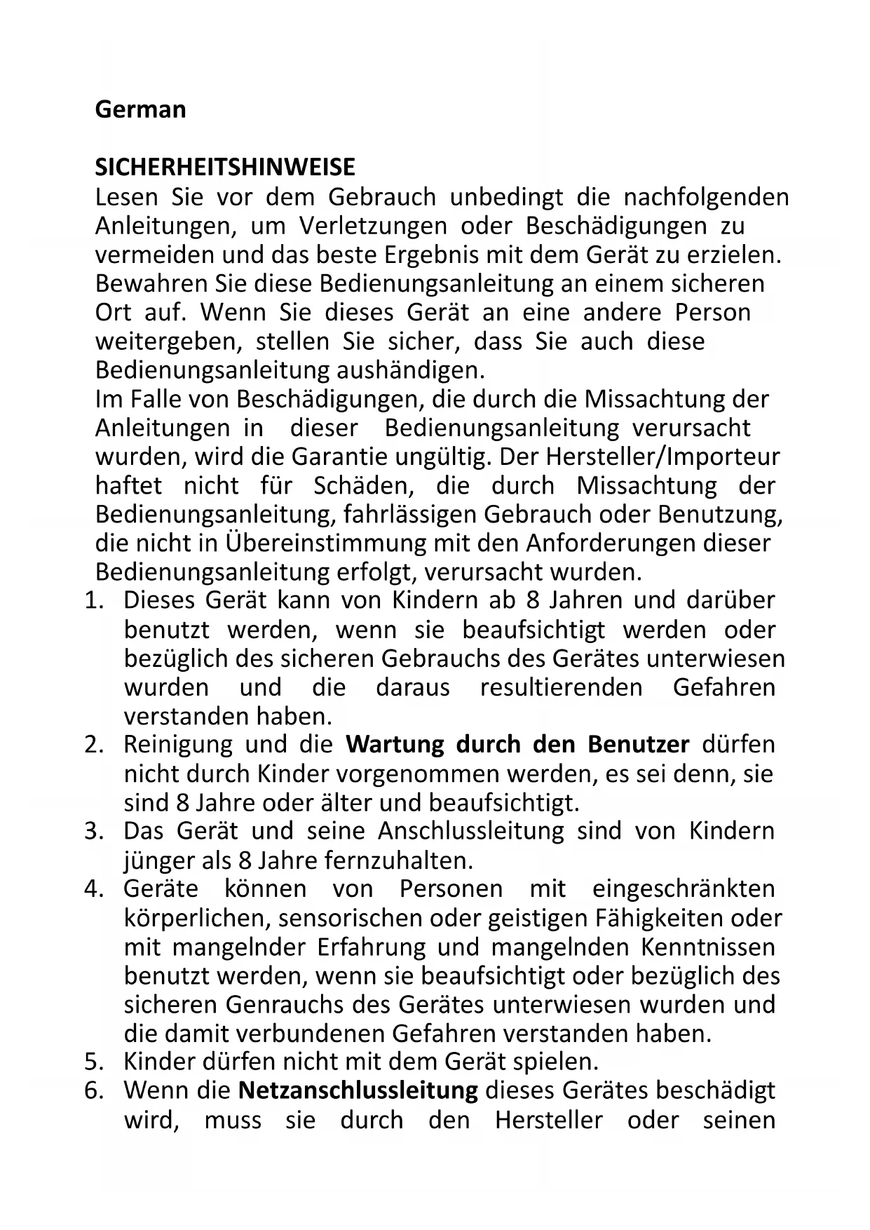 below paragraph of the manual.German SICHERHEITSHINWEISE Lesen Sie vor dem Gebrauch unbedingt die nachfolgenden Anleitungen, um Verletzungen oder Beschädigungen zu vermeiden und das beste Ergebnis mit dem Gerät zu erzielen. Bewahren Sie diese Bedienungsanleitung an einem sicheren Ort auf. Wenn Sie dieses Gerät an eine andere Person weitergeben, stellen Sie sicher, dass Sie auch diese Bedienungsanleitung aushändigen. Im Falle von Beschädigungen, die durch die Missachtung der Anleitungen in dieser Bedienungsanleitung verursacht wurden, wird die Garantie ungültig. Der Hersteller/Importeur haftet nicht für Schäden, die durch Missachtung der Bedienungsanleitung, fahrlässigen Gebrauch oder Benutzung, die nicht in Übereinstimmung mit den Anforderungen dieser Bedienungsanleitung erfolgt, verursacht wurden.