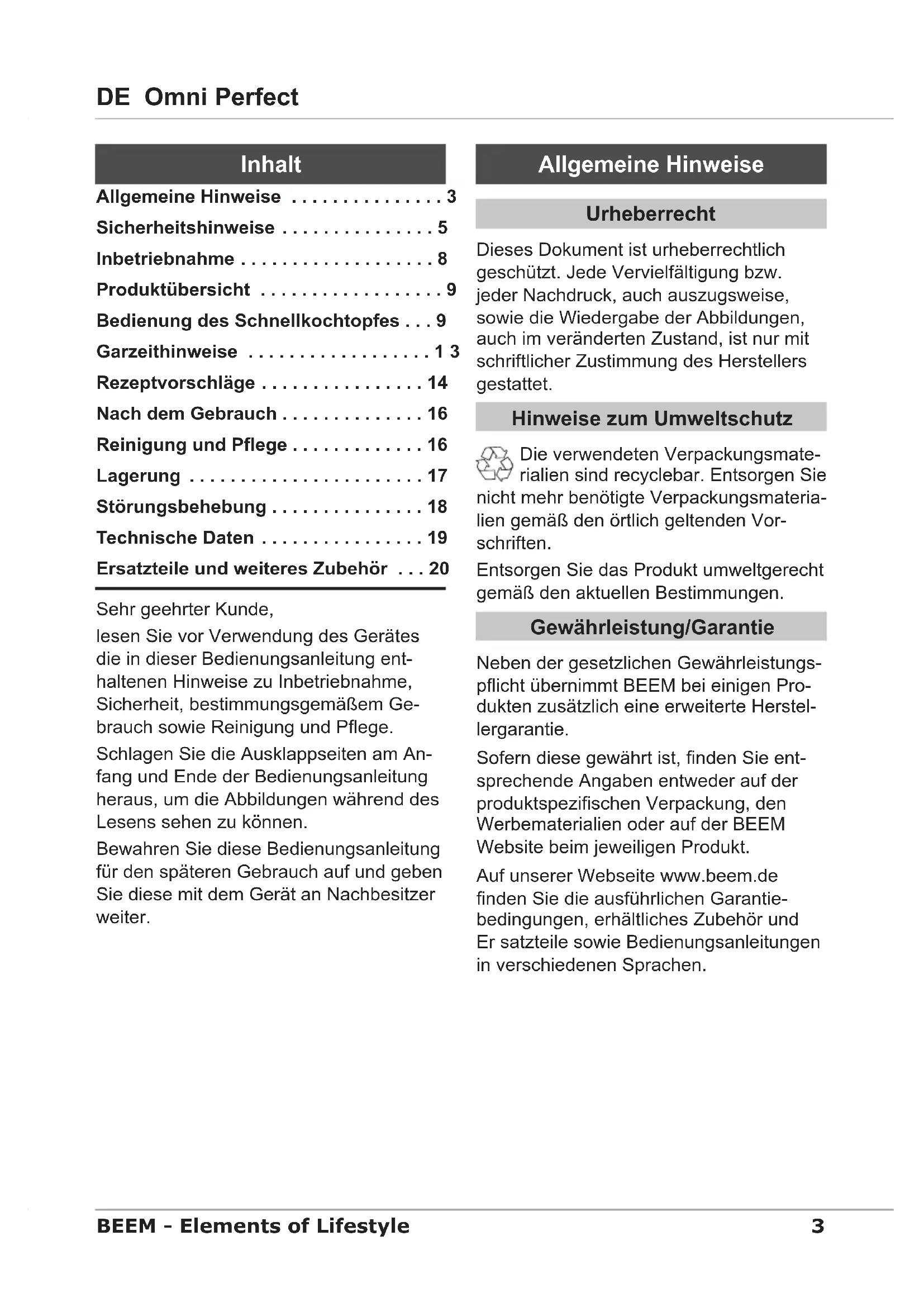 - DE Omni Perfect BEEM - Elements of Lifestyle Sehr geehrter Kunde, lesen Sie vor Verwendung des Gerätes die in dieser Bedienungsanleitung ent- haltenen Hinweise zu Inbetriebnahme, Sicherheit, bestimmungsgemäßem Ge- brauch sowie Reinigung und Pege. Schlagen Sie die Ausklappseiten am An- fang und Ende der Bedienungsanleitung heraus, um die Abbildungen während des Lesens sehen zu können. Bewahren Sie diese Bedienungsanleitung für den späteren Gebrauch auf und geben Sie diese mit dem Gerät an Nachbesitzer weiter. Allgemeine Hinweise Urheberrecht Dieses Dokument ist urheberrechtlich geschützt. Jede Vervielfältigung bzw. jeder Nachdruck, auch auszugsweise, sowie die Wiedergabe der Abbildungen, auch im veränderten Zustand, ist nur mit schriftlicher Zustimmung des Herstellers gestattet. Hinweise zum Umweltschutz Die verwendeten Verpackungsmate- rialien sind recyclebar. Entsorgen Sie nicht mehr benötigte Verpackungsmateria- lien gemäß den örtlich geltenden Vor- schriften. Entsorgen Sie das Produkt umweltgerecht gemäß den aktuellen Bestimmungen. Gewährleistung/Garantie Neben der gesetzlichen Gewährleistungs- picht übernimmt BEEM bei einigen Pro- dukten zusätzlich eine erweiterte Herstel- lergarantie. Sofern diese gewährt ist, nden Sie ent- sprechende Angaben entweder auf der produktspezischen Verpackung, den Werbematerialien oder auf der BEEM Website beim jeweiligen Produkt. Auf unserer Webseite www.beem.de nden Sie die ausführlichen Garantie- bedingungen, erhältliches Zubehör und Er satzteile sowie Bedienungsanleitungen in verschiedenen Sprachen. Allgemeine Hinweise p. 3