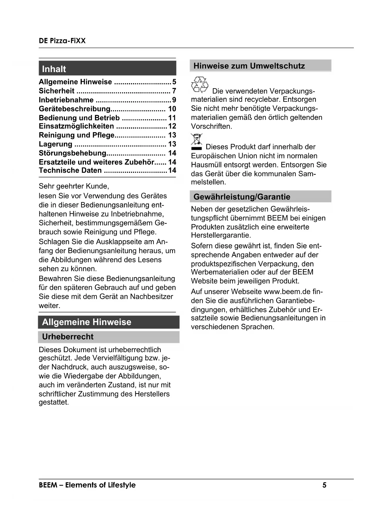 Sehr geehrter Kunde, lesen Sie vor Verwendung des Gerätes die in dieser Bedienungsanleitung ent- haltenen Hinweise zu Inbetriebnahme, Sicherheit, bestimmungsgemäßem Ge- brauch sowie Reinigung und Pflege. Schlagen Sie die Ausklappseite am An- fang der Bedienungsanleitung heraus, um die Abbildungen während des Lesens sehen zu können. Bewahren Sie diese Bedienungsanleitung für den späteren Gebrauch auf und geben Sie diese mit dem Gerät an Nachbesitzer weiter. Allgemeine Hinweise Urheberrecht Dieses Dokument ist urheberrechtlich geschützt. Jede Vervielfältigung bzw. je- der Nachdruck, auch auszugsweise, so- wie die Wiedergabe der Abbildungen, auch im veränderten Zustand, ist nur mit schriftlicher Zustimmung des Herstellers gestattet. Hinweise zum Umweltschutz Die verwendeten Verpackungs- materialien sind recyclebar. Entsorgen Sie nicht mehr benötigte Verpackungs- materialien gemäß den örtlich geltenden Vorschriften. Dieses Produkt darf innerhalb der Europäischen Union nicht im normalen Hausmüll entsorgt werden. Entsorgen Sie das Gerät über die kommunalen Sam- melstellen. Gewährleistung/Garantie Neben der gesetzlichen Gewährleis- tungspflicht übernimmt BEEM bei einigen Produkten zusätzlich eine erweiterte Herstellergarantie. Sofern diese gewährt ist, finden Sie ent- sprechende Angaben entweder auf der produktspezifischen Verpackung, den Werbematerialien oder auf der BEEM Website beim jeweiligen Produkt. Auf unserer Webseite www.beem.de fin- den Sie die ausführlichen Garantiebe- dingungen, erhältliches Zubehör und Er- satzteile sowie Bedienungsanleitungen in verschiedenen Sprachen.Pizza-FiXX DE 6 BEEM – Elements of Lifestyle Verwendete Symbole GEFAHR Wird verwendet für eine unmittelbar drohende Gefahr, die zu schweren Kör- perverletzungen oder zum Tod führt. Zur Vermeidung der Gefahr die hier aufgeführten Anweisungen befolgen. WARNUNG Wird verwendet für eine möglicherweise gefährliche Situation, die zu schweren Körperverletzungen oder zum Tod führen könnte. Zur Vermeidung der Gefahr die hier aufgeführten Anweisungen befolgen. VORSICHT Wird verwendet für eine möglicherweise gefährliche Situation, die zu leichten Verletzungen führen kann. Zur Vermeidung der Gefahr die hier aufgeführten Anweisungen befolgen. ACHTUNG Wird verwendet für eine Situation, die zu Sachschäden führen kann. Zur Vermeidung der Gefahr die hier aufgeführten Anweisungen befolgen. Haftungsbeschränkungen Wir übernehmen keine Haftung bei Schäden oder Folgeschäden bei: