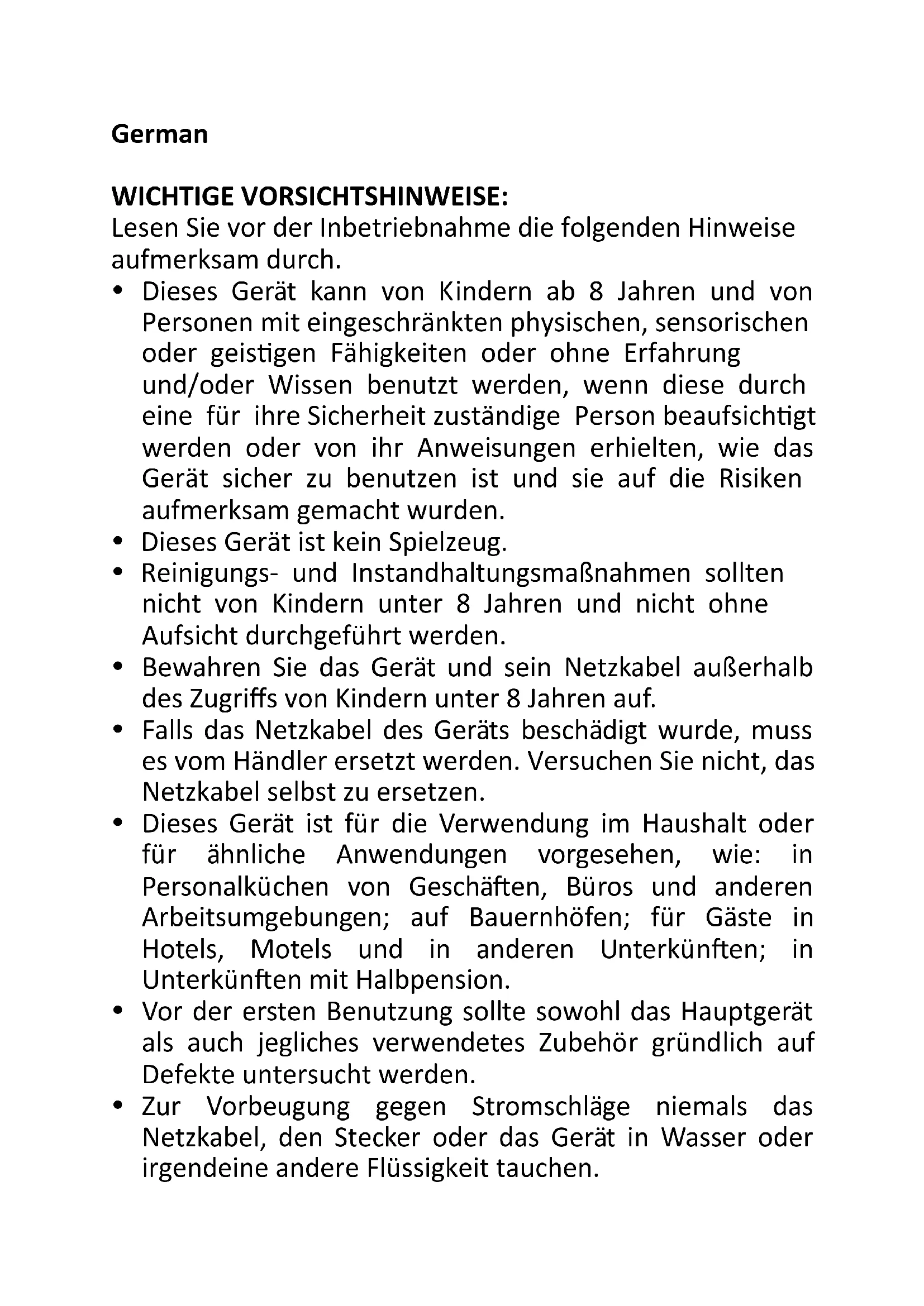 oven must not be operated until it has been repaired by a competent person. If smoke is emitted, stop or unplug the oven and keep the door closed to extinguish potential flames. It is advised to clean the oven regularly and to remove all food deposits: if the appliance is not kept sufficiently clean its surface could degrade which could inexorably affect appliance life span and lead to a hazard. When operating the oven, keep at least 12cm’s of free space on all sides of the oven to allow for adequate air circulation. WARNING!! Please do not touch surface while in use. The accessible surface may get hot when the appliance is operating.German WICHTIGE VORSICHTSHINWEISE: Lesen Sie vor der Inbetriebnahme die folgenden Hinweise aufmerksam durch. Dieses Gerät kann von Kindern ab 8 Jahren und von Personen mit eingeschränkten physischen, sensorischen oder geistigen Fähigkeiten oder ohne Erfahrung und/oder Wissen benutzt werden, wenn diese durch eine für ihre Sicherheit zuständige Person beaufsichtigt werden oder von ihr Anweisungen erhielten, wie das Gerät sicher zu benutzen ist und sie auf die Risiken aufmerksam gemacht wurden. Dieses Gerät ist kein Spielzeug. Reinigungs- und Instandhaltungsmaßnahmen sollten nicht von Kindern unter 8 Jahren und nicht ohne Aufsicht durchgeführt werden. Bewahren Sie das Gerät und sein Netzkabel außerhalb des Zugriffs von Kindern unter 8 Jahren auf. Falls das Netzkabel des Geräts beschädigt wurde, muss es vom Händler ersetzt werden. Versuchen Sie nicht, das Netzkabel selbst zu ersetzen. Dieses Gerät ist für die Verwendung im Haushalt oder für ähnliche Anwendungen vorgesehen, wie: in Personalküchen von Geschäften, Büros und anderen Arbeitsumgebungen; auf Bauernhöfen; für Gäste in Hotels, Motels und in anderen Unterkünften; in Unterkünften mit Halbpension. Vor der ersten Benutzung sollte sowohl das Hauptgerät als auch jegliches verwendetes Zubehör gründlich auf Defekte untersucht werden. Zur Vorbeugung gegen Stromschläge niemals das Netzkabel, den Stecker oder das Gerät in Wasser oder irgendeine andere Flüssigkeit tauchen. Den Netzstecker abziehen, wenn das Gerät nicht benutzt wird oder gereinigt werden soll. Vor dem Anbringen und Abnehmen von Zubehör abkühlen lassen. Schützen Sie die Glastür während des Betriebs vor Wasser. Das Glas könnte sonst zersplittern. Das Gerät nicht benutzen, wenn Kabel oder Stecker beschädigt wurden, nachdem Fehlfunktionen aufgetreten sind oder das Gerät auf andere Weise beschädigt wurde. Geben Sie das Gerät zur Untersuchung, Reparatur oder Anpassung an den Händler zurück (oder an eine Fachwerkstatt). Die Benutzung von Zubehör, das nicht von uns empfohlen wurde, kann zu Körperverletzungen führen. Nicht im Freien benutzen. Das Netzkabel nicht über die Kante des Tischs oder der Stellfläche hängen lassen. Nicht mit heißen Oberflächen in Berührung kommen lassen. Das Gerät nicht auf oder in die Nähe von Wärmequellen wie Gas- oder Elektro-Herdplatten stellen. Seien Sie vorsichtig beim Hereinstellen und Herausnehmen von Nahrungsmitteln. Das Gerät im Betrieb nicht unbeaufsichtigt lassen. Nach der Benutzung den Netzstecker von der Steckdose abziehen. Das Gerät nicht in der Nähe von oder unter Wandschränke oder hängende Objekte wie Vorhänge oder andere brennenbare Materialien stellen oder dort betreiben. Keine Gegenstände auf das Gerät stellen. Warnung: Der Ofen ist im Betrieb heiß! Nicht die heißen Oberflächen oder die Glastür berühren. Benutzen Sie die Griffe oder Knöpfe. Der Ofen darf nicht in Wasser gestellt oder mit Wasser gereinigt werden. Dieses Produkt ist nur zum Hausgebrauch bestimmt. Das Gerät muss während der Inbetriebnahme auf einer ebenen, stabilen, hitzebeständig und sauberen Fläche aufgestellt sein. Das Gerät darf nicht mit Hilfe einer externen Zeitschaltuhr oder eines separaten Systems mit Fernbedienung eingeschaltet werden. Decken Sie das Krümelblech oder einen anderen Teil des Geräts nicht mit einer Aluminiumfolie ab, da sich dadurch das Gerät zu stark erhitzen kann. WARNUNG: Bei beschädigter Tür bzw. Türversiegelung darf der Ofen nicht betrieben werden, bis er von einem Fachmann repariert wurde. Bei Rauchaufkommen den Ofen ausschalten bzw. von der Stromversorgung trennen und die Tür geschlossen lassen, um etwaige Flammen zu ersticken. Es wird empfohlen, den Ofen regelmäßig zu reinigen und von Lebensmittelrückständen zu befreien: Wird das Gerät nicht ausreichend sauber gehalten, könnte die Oberflächenqualität abnehmen, was unweigerlich zu einer verkürzen Gerätelebensdauer und zu Gefahren führt. Lassen Sie für eine angemessene Luftzirkulation einen Freiraum von mindestens 12 cm um das Gerät. WARNHINWEIS! Berühren Sie die Kochplatten nicht während des Betriebs, sie werden sehr heiß.French CONSIGNES IMPORTANTES Avant d’utiliser l’appareil, l’utilisateur devrait lire attentivement les instructions. Cet appareil peut être utilisé par les enfants à partir de 8 ans et les personnes souffrant dedéficience physique, sensorielle et mentale ou manquant d’expérience et de connaissance àconditions qu’elles soient sous surveillance ou aient reçu des instructions sécuritaires relatives à l’utilisation de l’appareil et comprennent les risques impliqués. Conservez l’appareil et son cordon hors de portée des enfants de moins de 8 ans. Les enfants doivent être surveillés afin de s’assurer qu’ils ne jouent pas avec l’appareil. Le nettoyage et l’entretien à domicile ne doit pas être effectué par des enfants âgés de moins de 8 ans sans supervision. S’il est endommagé, le cordon d’alimentation doit être remplacé par le fabricant, ses agents de réparation ou une personne qualifiée afin d’éviter tout risque d’accident. Cet appereil est concu pour être utilisé dans les ménages et dans les lieux similaires notamment: Les cuisines du personnel dans les magasins, les bureaux et autres lieux de servic