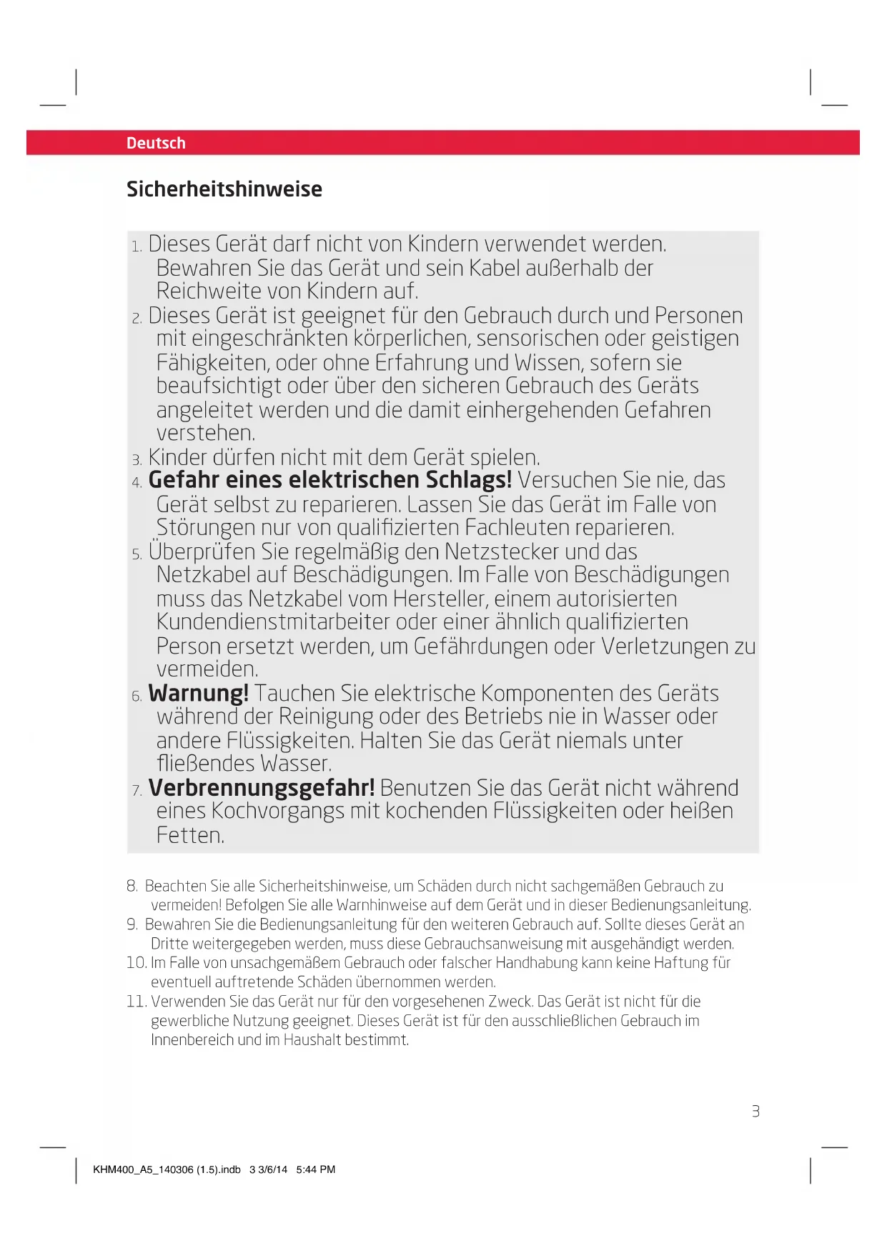 gewerbliche Nutzung geeignet. Dieses Gerät ist für den ausschließlichen Gebrauch im Innenbereich und im Haushalt bestimmt. KHM400_A5_140306 (1.5).indb 3 3/6/14 5:44 PM4 Deutsch Deutsch Sicherheitshinweise