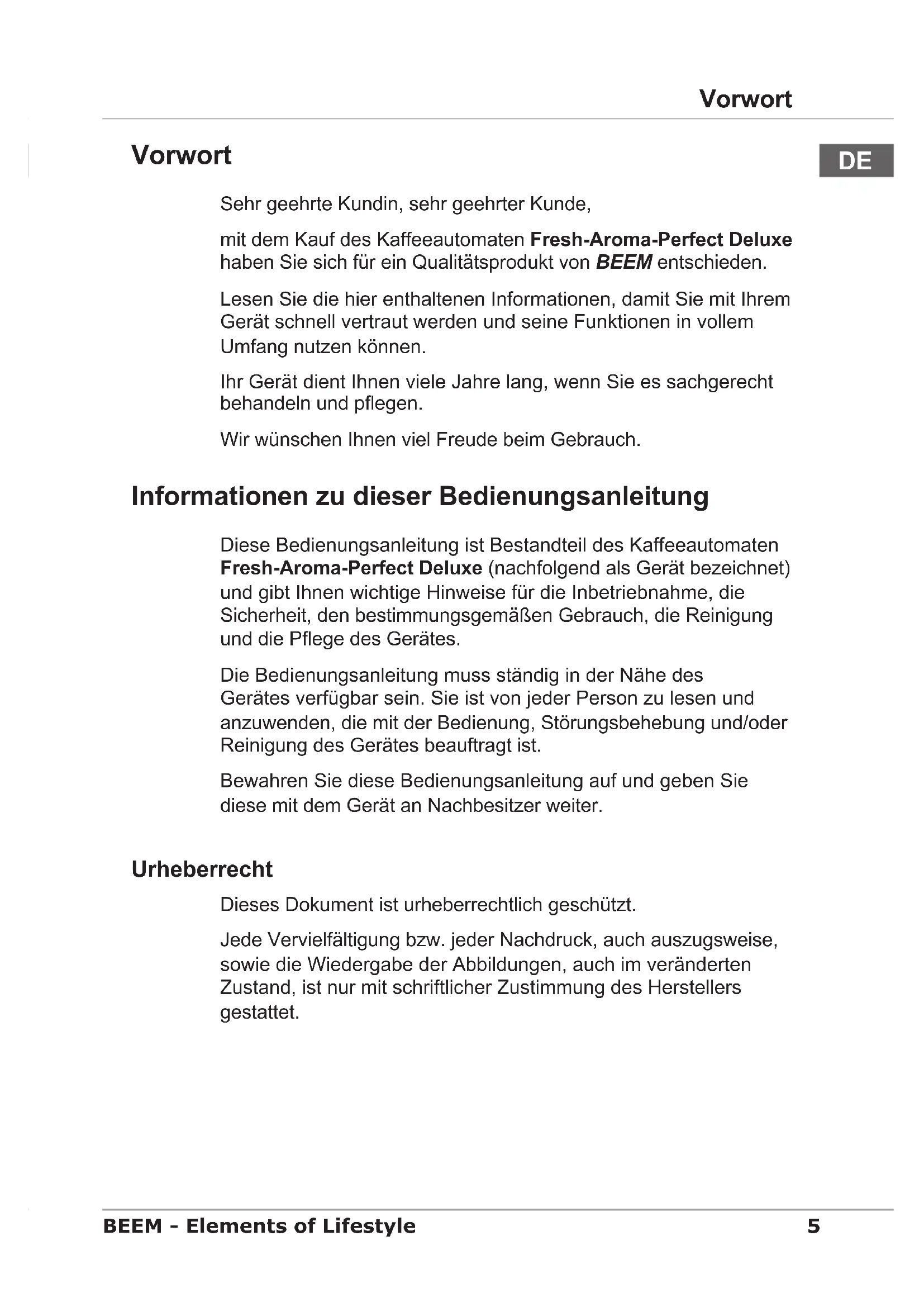 Vorwort Sehr geehrte Kundin, sehr geehrter Kunde, mit dem Kauf des Kaffeeautomaten Fresh-Aroma-Perfect Deluxe haben Sie sich für ein Qualitätsprodukt von BEEM entschieden. Lesen Sie die hier enthaltenen Informationen, damit Sie mit Ihrem Gerät schnell vertraut werden und seine Funktionen in vollem Umfang nutzen können. Ihr Gerät dient Ihnen viele Jahre lang, wenn Sie es sachgerecht behandeln und pegen. Wir wünschen Ihnen viel Freude beim Gebrauch. Informationen zu dieser Bedienungsanleitung Diese Bedienungsanleitung ist Bestandteil des Kaffeeautomaten Fresh-Aroma-Perfect Deluxe (nachfolgend als Gerät bezeichnet) und gibt Ihnen wichtige Hinweise für die Inbetriebnahme, die Sicherheit, den bestimmungsgemäßen Gebrauch, die Reinigung und die Pege des Gerätes. Die Bedienungsanleitung muss ständig in der Nähe des Gerätes verfügbar sein. Sie ist von jeder Person zu lesen und anzuwenden, die mit der Bedienung, Störungsbehebung und/oder Reinigung des Gerätes beauftragt ist. Bewahren Sie diese Bedienungsanleitung auf und geben Sie diese mit dem Gerät an Nachbesitzer weiter. Urheberrecht Dieses Dokument ist urheberrechtlich geschützt. Jede Vervielfältigung bzw. jeder Nachdruck, auch auszugsweise, sowie die Wiedergabe der Abbildungen, auch im veränderten Zustand, ist nur mit schriftlicher Zustimmung des Herstellers gestattet.6 Informationen zu dieser Bedienungsanleitung BEEM - Elements of Lifestyle