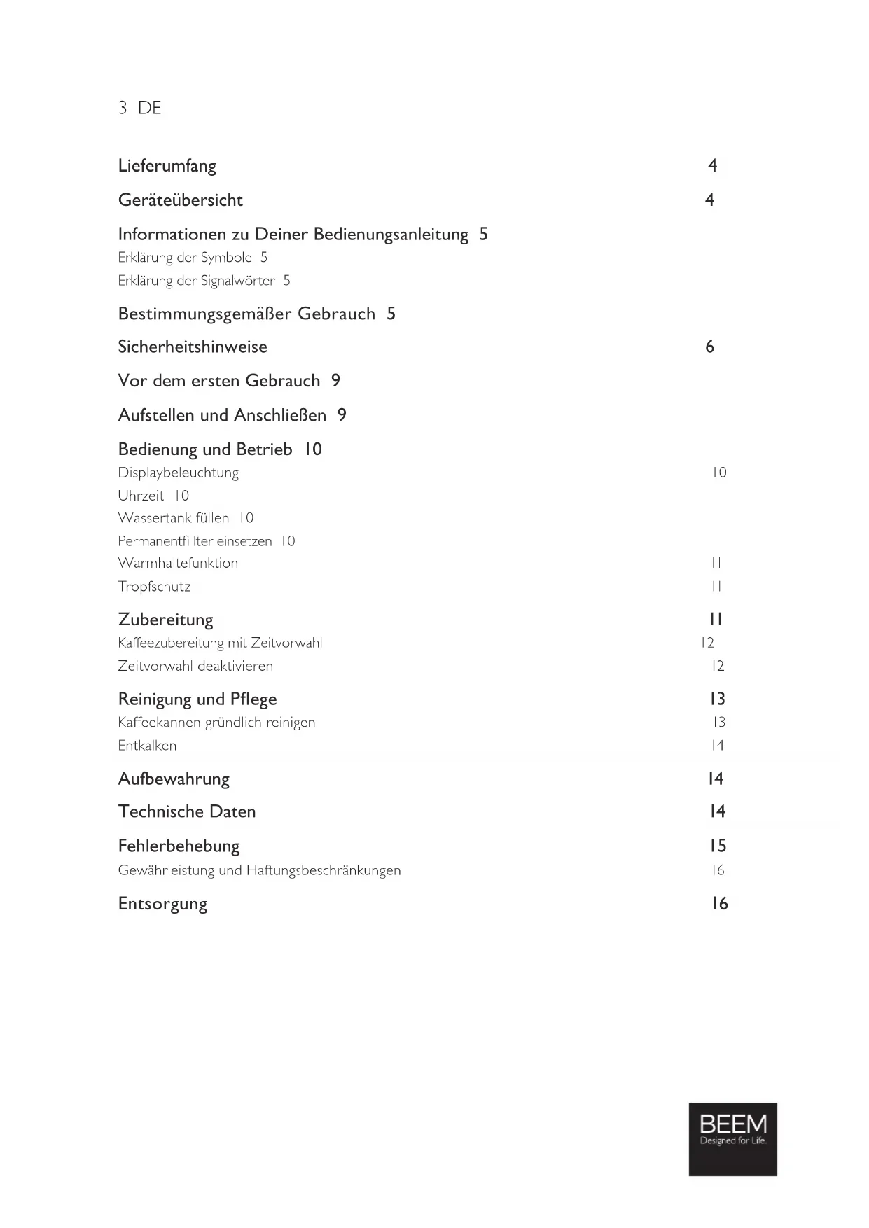 - Bedienungsanleitung Überprüfe den Lieferumfang auf Vollständigkeit und Transportschäden. Falls das Gerät oder die Anschlussleitung Schäden aufweisen sollten, verwende das Gerät nicht (!), sondern kontaktiere den Kundenservice. Geräteübersicht Legende (Abbildungen siehe Ausklappseite) 1 Wassertankdeckel 2 Permanentfi lter 3 Filterfach 4 Tropfschutzventil im Kaffeeauslauf des Filterfachs 5 Glaskanne 6 Warmhalteplatte 7 Bedienfeld mit Display und Kontrollleuchten 8 Wasserstandsanzeige 9 Wassertank Bedienfeld 10 Taste PROG (Programmierung Uhrzeit / Zeitvorwahl) 11 Betriebsleuchte, rot 12 Taste MIN (Einstellung der Minuten) 13 Taste ON / OFF (Ein- / Ausschalter) 14 Taste HR (Einstellung der Stunden) 15 Kontrollleuchte Zeitvorwahl, grün 16 Taste AUTO (Aktivieren / Deaktivieren der Zeitvorwahl)5 DE Herzlichen Glückwunsch! Liebe Kundin, lieber Kunde, wir freuen uns, dass Du Dich für diese Filterkaffeemaschine entschieden hast. Solltest Du Fragen zum Gerät sowie zu Ersatz- / Zubehörteilen haben, kontaktiere den Kundenservice über unsere Website: www.beem.de Informationen zu Deiner Bedienungsanleitung Lies vor dem ersten Gebrauch des Gerätes die Bedienungsanleitung sorgfältig durch und be wahre sie zum späteren Nachlesen auf. Bei Weitergabe des Gerätes ist auch diese Bedienungsanlei- tung mitzugeben. Hersteller und Importeur übernehmen keine Haftung, wenn die Angaben in dieser Bedienungsanleitung nicht beachtet werden. Erklärung der Symbole Gefahrenzeichen: Diese Symbole zeigen Verletzungsgefahren an. Die dazugehörenden Sicherheitshinweise aufmerksam durchlesen und an diese halten, um Personenschäden zu vermeiden. Ergänzende Informationen Für Lebensmittel geeignet. Vorsicht vor heißen Oberfl ächen! Bedienungsanleitung vor Gebrauch lesen! Erklärung der Signalwörter GEFAHR Warnt vor schweren Verletzungen und Lebensgefahr. WARNUNG Warnt vor möglichen schweren Verletzungen und Lebensgefahr. VORSICHT Warnt vor leichten bis mittelschweren Verletzungen. HINWEIS Warnt vor Sachschäden. Bestimmungsgemäßer Gebrauch