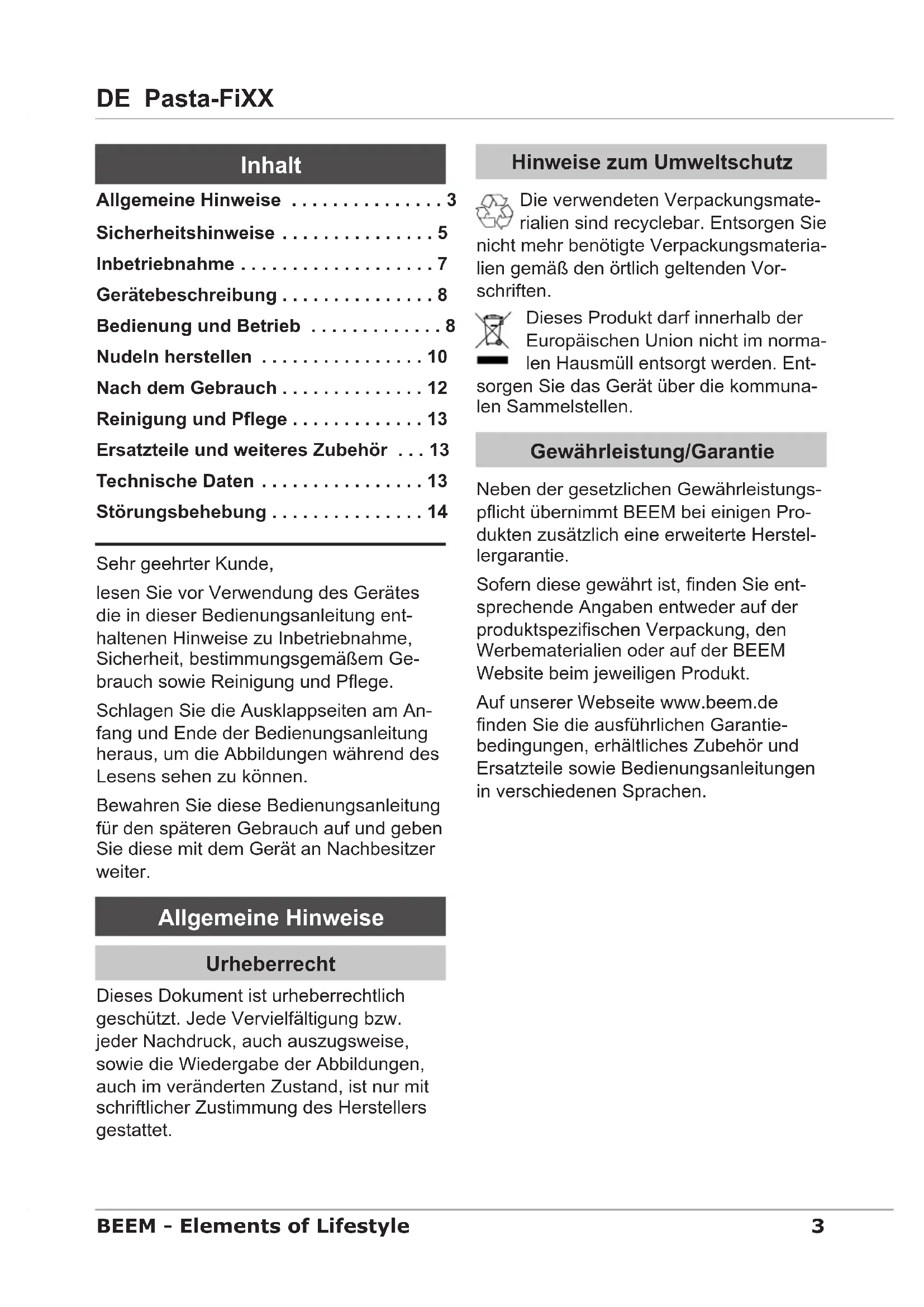 - DE Pasta-FiXX BEEM - Elements of Lifestyle Sehr geehrter Kunde, lesen Sie vor Verwendung des Gerätes die in dieser Bedienungsanleitung ent- haltenen Hinweise zu Inbetriebnahme, Sicherheit, bestimmungsgemäßem Ge- brauch sowie Reinigung und Pege. Schlagen Sie die Ausklappseiten am An- fang und Ende der Bedienungsanleitung heraus, um die Abbildungen während des Lesens sehen zu können. Bewahren Sie diese Bedienungsanleitung für den späteren Gebrauch auf und geben Sie diese mit dem Gerät an Nachbesitzer weiter. Allgemeine Hinweise Urheberrecht Dieses Dokument ist urheberrechtlich geschützt. Jede Vervielfältigung bzw. jeder Nachdruck, auch auszugsweise, sowie die Wiedergabe der Abbildungen, auch im veränderten Zustand, ist nur mit schriftlicher Zustimmung des Herstellers gestattet. Hinweise zum Umweltschutz Die verwendeten Verpackungsmate- rialien sind recyclebar. Entsorgen Sie nicht mehr benötigte Verpackungsmateria- lien gemäß den örtlich geltenden Vor- schriften. Dieses Produkt darf innerhalb der Europäischen Union nicht im norma- len Hausmüll entsorgt werden. Ent- sorgen Sie das Gerät über die kommuna- len Sammelstellen. Gewährleistung/Garantie Neben der gesetzlichen Gewährleistungs- picht übernimmt BEEM bei einigen Pro- dukten zusätzlich eine erweiterte Herstel- lergarantie. Sofern diese gewährt ist, nden Sie ent- sprechende Angaben entweder auf der produktspezischen Verpackung, den Werbematerialien oder auf der BEEM Website beim jeweiligen Produkt. Auf unserer Webseite www.beem.de nden Sie die ausführlichen Garantie- bedingungen, erhältliches Zubehör und Ersatzteile sowie Bedienungsanleitungen in verschiedenen Sprachen. Allgemeine Hinweise p. 3