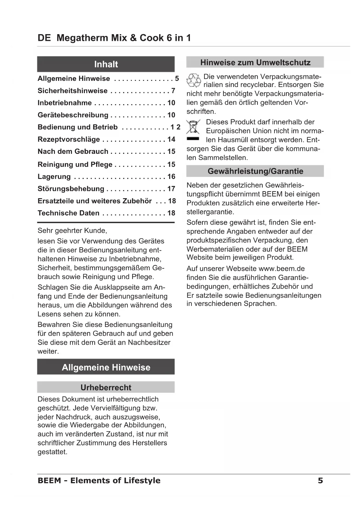 - DE Megatherm Mix & Cook 6 in 1 BEEM - Elements of Lifestyle Sehr geehrter Kunde, lesen Sie vor Verwendung des Gerätes die in dieser Bedienungsanleitung ent- haltenen Hinweise zu Inbetriebnahme, Sicherheit, bestimmungsgemäßem Ge- brauch sowie Reinigung und Pege. Schlagen Sie die Ausklappseite am An- fang und Ende der Bedienungsanleitung heraus, um die Abbildungen während des Lesens sehen zu können. Bewahren Sie diese Bedienungsanleitung für den späteren Gebrauch auf und geben Sie diese mit dem Gerät an Nachbesitzer weiter. Allgemeine Hinweise Urheberrecht Dieses Dokument ist urheberrechtlich geschützt. Jede Vervielfältigung bzw. jeder Nachdruck, auch auszugsweise, sowie die Wiedergabe der Abbildungen, auch im veränderten Zustand, ist nur mit schriftlicher Zustimmung des Herstellers gestattet. Hinweise zum Umweltschutz Die verwendeten Verpackungsmate- rialien sind recyclebar. Entsorgen Sie nicht mehr benötigte Verpackungsmateria- lien gemäß den örtlich geltenden Vor- schriften. Dieses Produkt darf innerhalb der Europäischen Union nicht im norma- len Hausmüll entsorgt werden. Ent- sorgen Sie das Gerät über die kommuna- len Sammelstellen. Gewährleistung/Garantie Neben der gesetzlichen Gewährleis- tungspicht übernimmt BEEM bei einigen Produkten zusätzlich eine erweiterte Her- stellergarantie. Sofern diese gewährt ist, nden Sie ent- sprechende Angaben entweder auf der produktspezischen Verpackung, den Werbematerialien oder auf der BEEM Website beim jeweiligen Produkt. Auf unserer Webseite www.beem.de nden Sie die ausführlichen Garantie- bedingungen, erhältliches Zubehör und Er satzteile sowie Bedienungsanleitungen in verschiedenen Sprachen. Allgemeine Hinweise p. 5