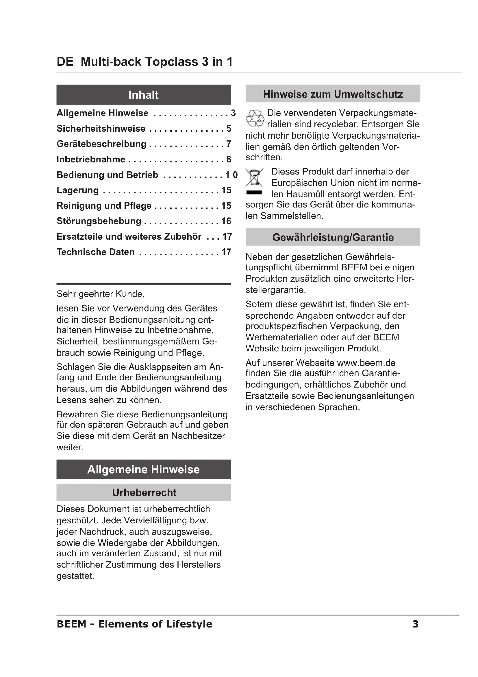 - 1b3 DE Multi-back Topclass 3 in 1 BEEM - Elements of Lifestyle Sehr geehrter Kunde, lesen Sie vor Verwendung des Gerätes die in dieser Bedienungsanleitung ent- haltenen Hinweise zu Inbetriebnahme, Sicherheit, bestimmungsgemäßem Ge- brauch sowie Reinigung und Pege. Schlagen Sie die Ausklappseiten am An- fang und Ende der Bedienungsanleitung heraus, um die Abbildungen während des Lesens sehen zu können. Bewahren Sie diese Bedienungsanleitung für den späteren Gebrauch auf und geben Sie diese mit dem Gerät an Nachbesitzer weiter. Allgemeine Hinweise Urheberrecht Dieses Dokument ist urheberrechtlich geschützt. Jede Vervielfältigung bzw. jeder Nachdruck, auch auszugsweise, sowie die Wiedergabe der Abbildungen, auch im veränderten Zustand, ist nur mit schriftlicher Zustimmung des Herstellers gestattet. Hinweise zum Umweltschutz Die verwendeten Verpackungsmate- rialien sind recyclebar. Entsorgen Sie nicht mehr benötigte Verpackungsmateria- lien gemäß den örtlich geltenden Vor- schriften. Dieses Produkt darf innerhalb der Europäischen Union nicht im norma- len Hausmüll entsorgt werden. Ent- sorgen Sie das Gerät über die kommuna- len Sammelstellen. Gewährleistung/Garantie Neben der gesetzlichen Gewährleis- tungspicht übernimmt BEEM bei einigen Produkten zusätzlich eine erweiterte Her- stellergarantie. Sofern diese gewährt ist, nden Sie ent- sprechende Angaben entweder auf der produktspezischen Verpackung, den Werbematerialien oder auf der BEEM Website beim jeweiligen Produkt. Auf unserer Webseite www.beem.de nden Sie die ausführlichen Garantie- bedingungen, erhältliches Zubehör und Ersatzteile sowie Bedienungsanleitungen in verschiedenen Sprachen. Allgemeine Hinweise p. 3