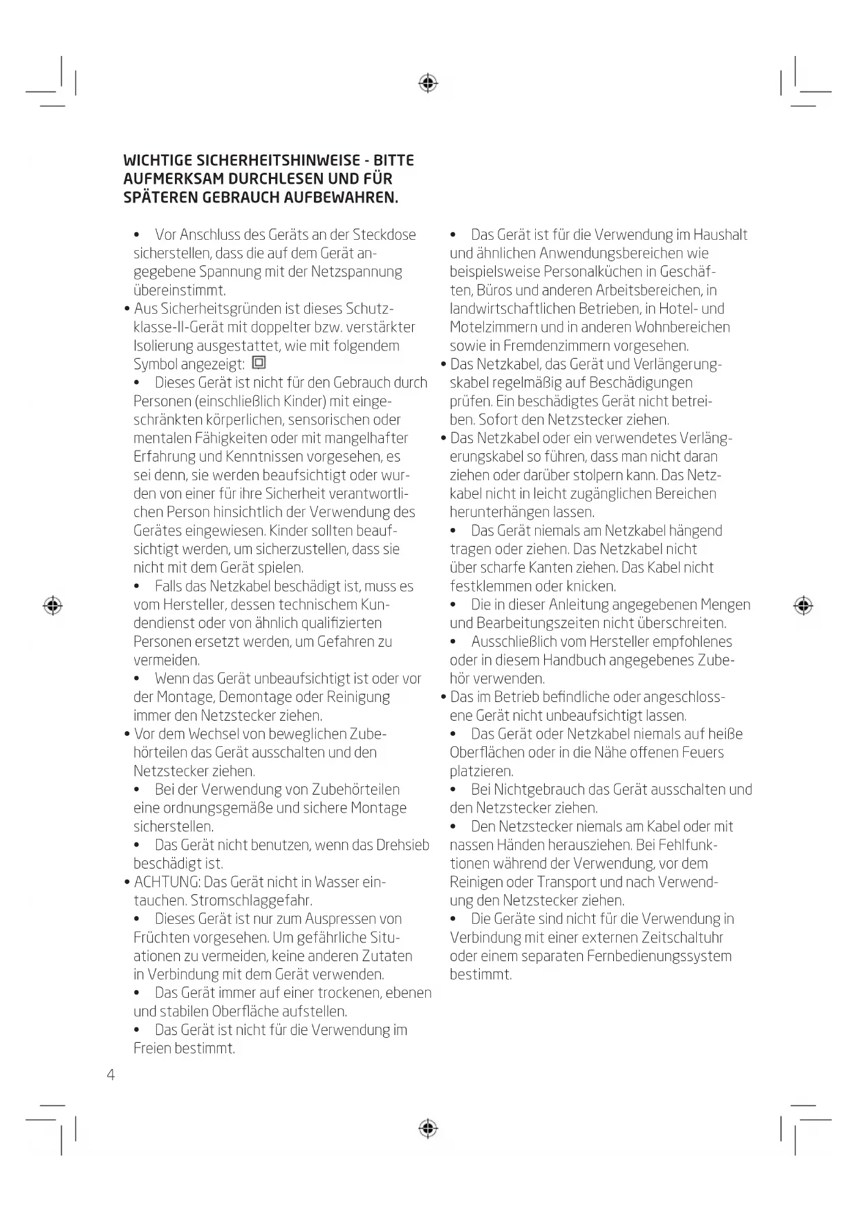 - Dieses Gerät ist nur zum Auspressen von Früchten vorgesehen. Um gefährliche Situ- ationen zu vermeiden, keine anderen Zutaten in Verbindung mit dem Gerät verwenden.