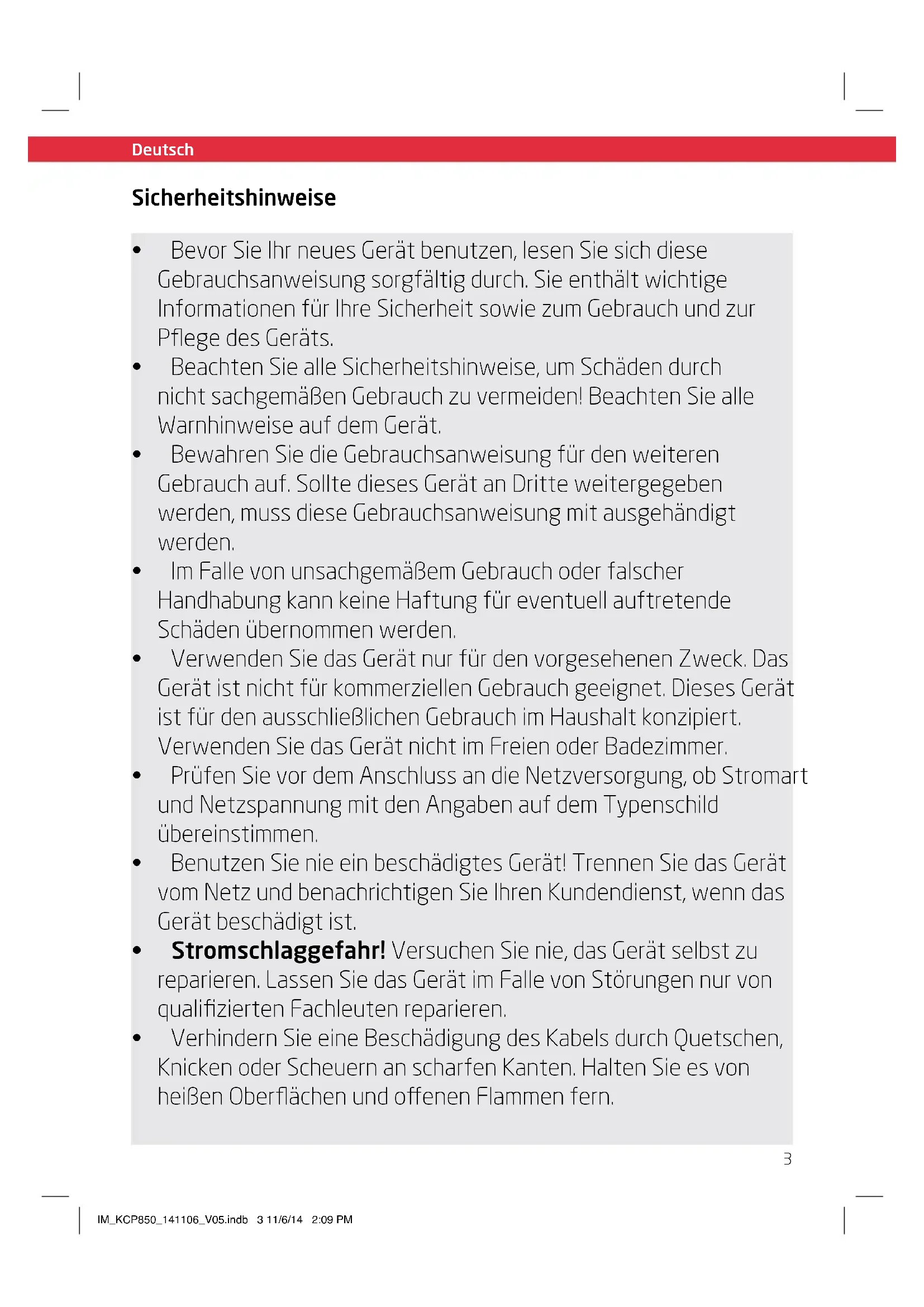 - VerhindernSieeineBeschädigungdesKabelsdurchQuetschen, KnickenoderScheuernanscharfenKanten.HaltenSieesvon heißenOberächenundoenenFlammenfern. IM_KCP850_141106_V05.indb 3 11/6/14 2:09 PM4 Deutsch Deutsch Sicherheitshinweise
