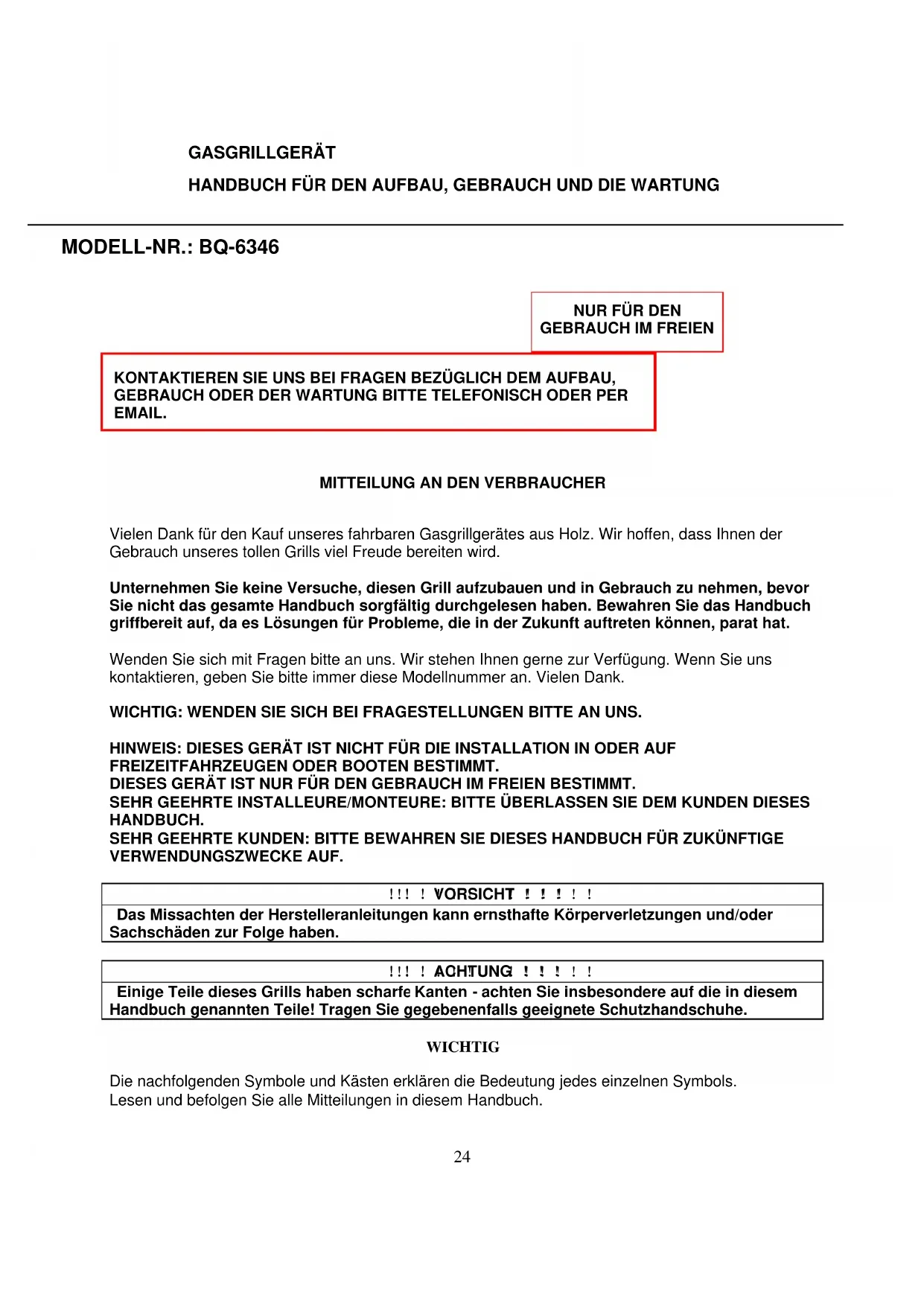 Unternehmen Sie keine Versuche, diesen Grill aufzubauen und in Gebrauch zu nehmen, bevor Sie nicht das gesamte Handbuch sorgfältig durchgelesen haben. Bewahren Sie das Handbuch griffbereit auf, da es Lösungen für Probleme, die in der Zukunft auftreten können, parat hat.