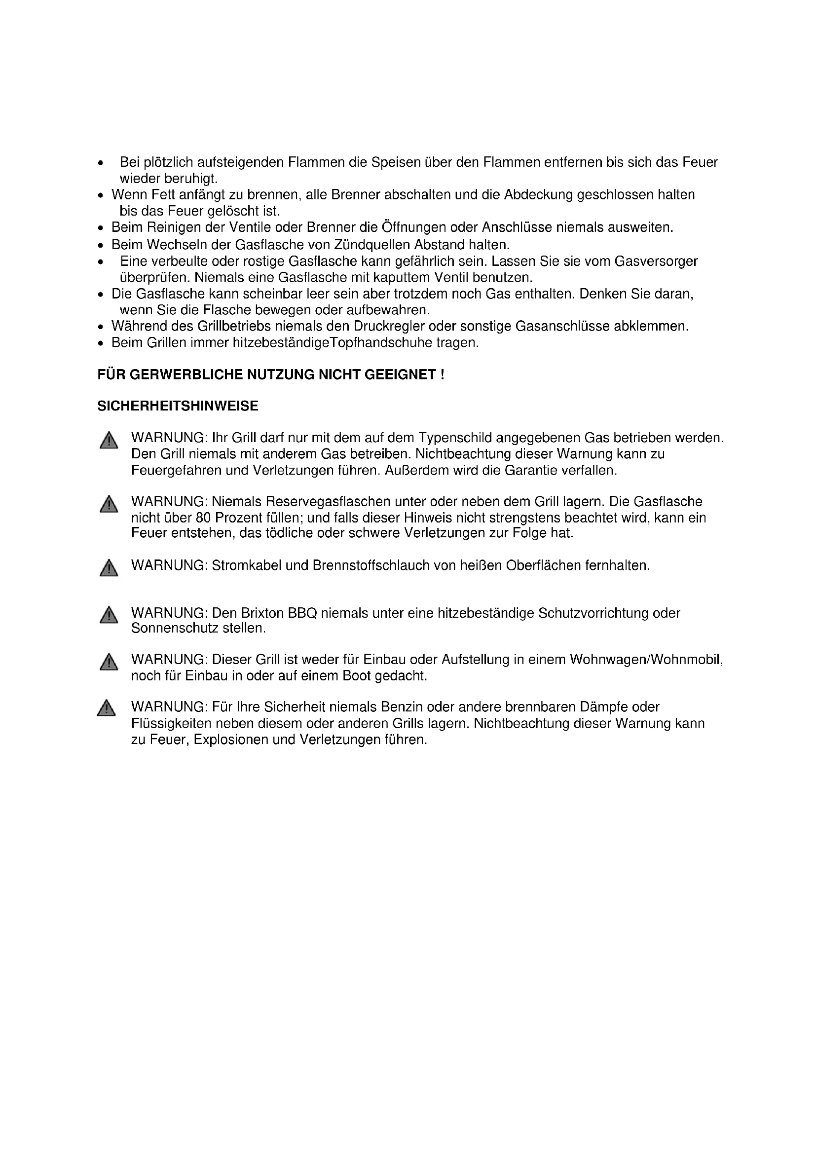 Die Dichteitsprüfung niemals mit einem Feuerzeug durchfuhren. - Den Brixton BBQ niemals bei Gasaustritt an den Verbindungsstellen benutzen.