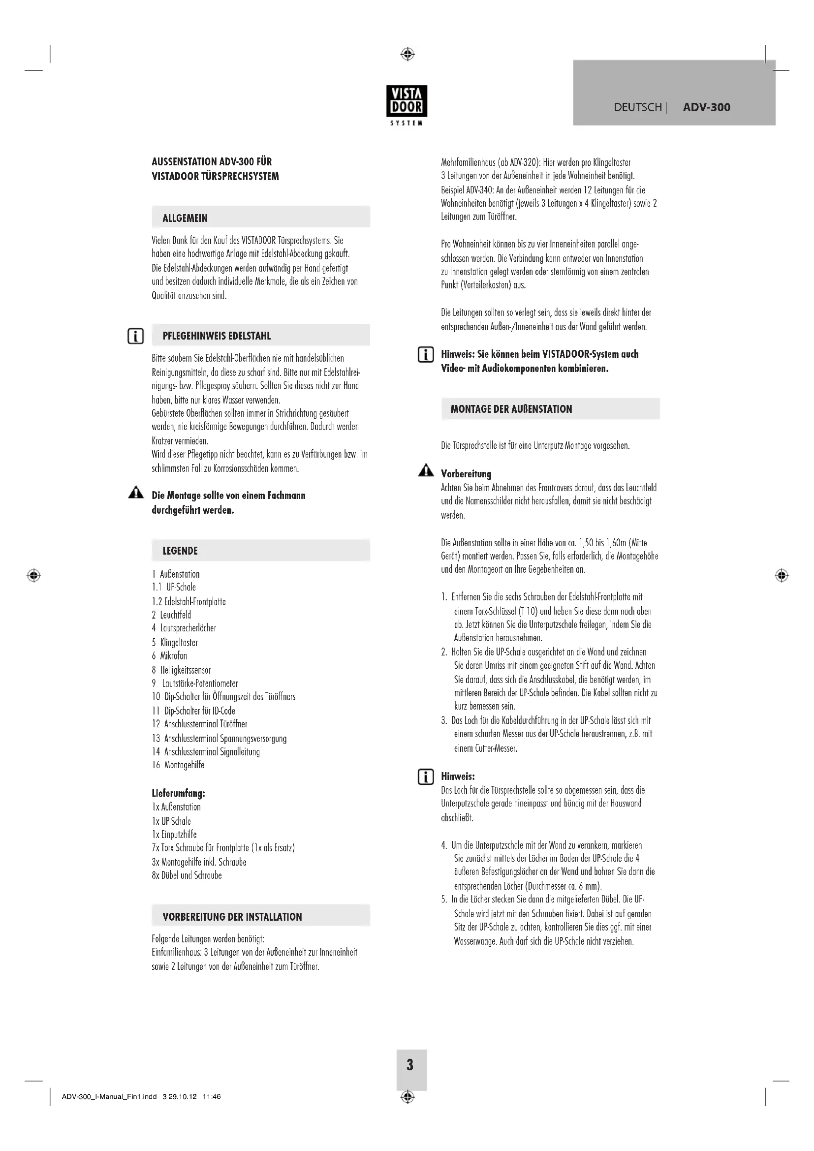 Vielen Dank für den Kauf des VISTADOOR Tursprechsystems. Sie haben eine hochwertige Anlage mit Edelstohl-Abdeckung gekauft. Die Edelstohl-Abdeckungen werden aufwändig per Hand gefertigt und besitzen dadurch individuelle Merkmale, die als ein Zeichen von Qualität anzusehen sind.