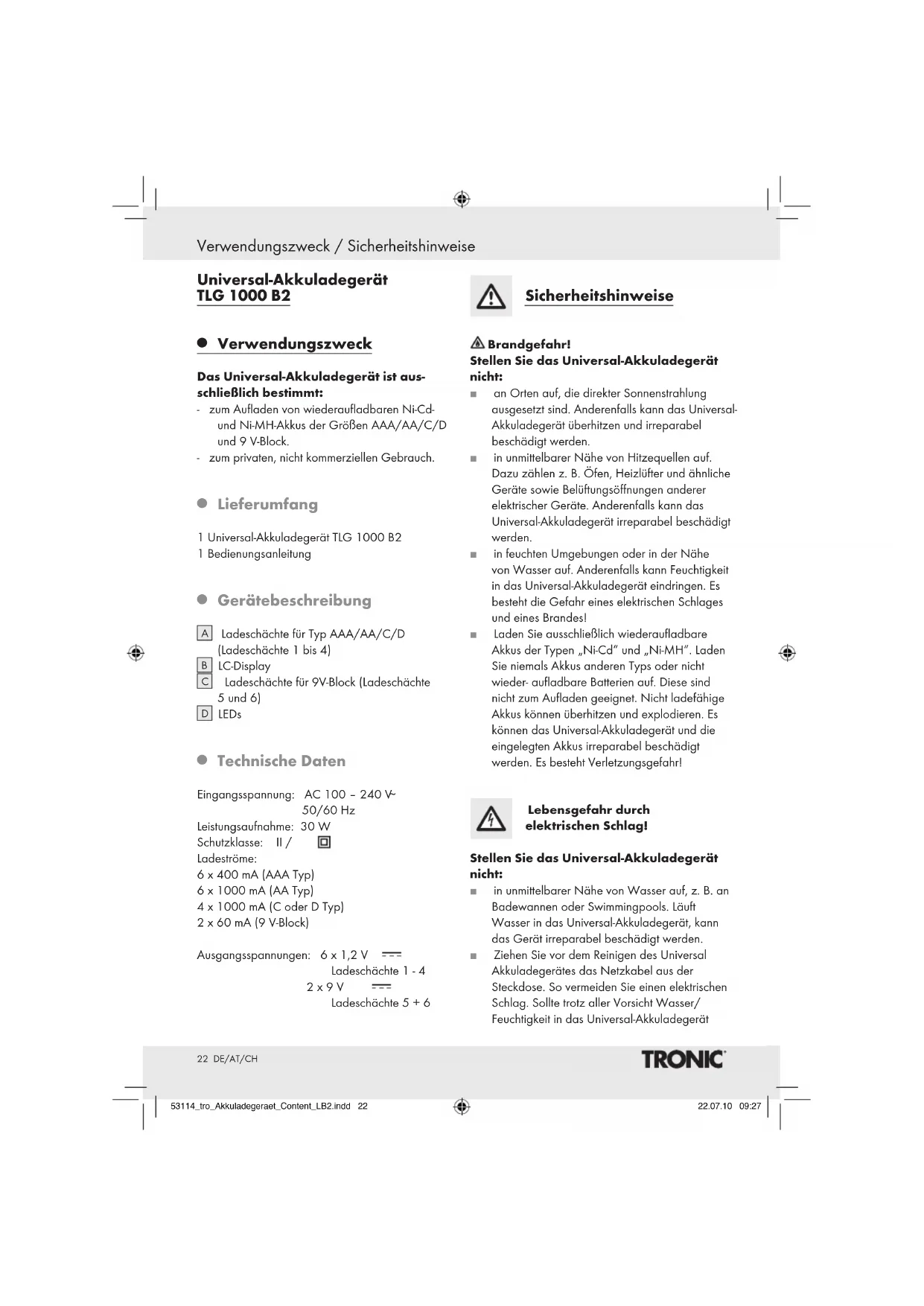 50/60 Hz Leistungsaufnahme: 30 W Schutzklasse: II / Ladeströme: 6 x 400 mA (AAA Typ) 6 x 1000 mA (AA Typ) 4 x 1000 mA (C oder D Typ) 2 x 60 mA (9 V-Block) Ausgangsspannungen: 6 x 1,2 V Ladeschächte 1 - 4 2 x 9 V Ladeschächte 5 + 6 Sicherheitshinweise Brandgefahr! Stellen Sie das Universal-Akkuladegerät nicht: J an Orten auf, die direkter Sonnenstrahlung ausgesetzt sind. Anderenfalls kann das Universal- Akkuladegerät überhitzen und irreparabel beschädigt werden. J in unmittelbarer Nähe von Hitzequellen auf. Dazu zählen z. B. Öfen, Heizlüfter und ähnliche Geräte sowie Belüftungsöffnungen anderer elektrischer Geräte. Anderenfalls kann das Universal-Akkuladegerät irreparabel beschädigt werden. J in feuchten Umgebungen oder in der Nähe von Wasser auf. Anderenfalls kann Feuchtigkeit in das Universal-Akkuladegerät eindringen. Es besteht die Gefahr eines elektrischen Schlages und eines Brandes! J Laden Sie ausschließlich wiederaufladbare Akkus der Typen „Ni-Cd“ und „Ni-MH“. Laden Sie niemals Akkus anderen Typs oder nicht wieder- aufladbare Batterien auf. Diese sind nicht zum Aufladen geeignet. Nicht ladefähige Akkus können überhitzen und explodieren. Es können das Universal-Akkuladegerät und die eingelegten Akkus irreparabel beschädigt werden. Es besteht Verletzungsgefahr! Lebensgefahr durch elektrischen Schlag! Stellen Sie das Universal-Akkuladegerät nicht: J in unmittelbarer Nähe von Wasser auf, z. B. an Badewannen oder Swimmingpools. Läuft Wasser in das Universal-Akkuladegerät, kann das Gerät irreparabel beschädigt werden. J Ziehen Sie vor dem Reinigen des Universal Akkuladegerätes das Netzkabel aus der Steckdose. So vermeiden Sie einen elektrischen Schlag. Sollte trotz aller Vorsicht Wasser/ Feuchtigkeit in das Universal-Akkuladegerät 53114_tro_Akkuladegeraet_Content_LB2.indd 22 22.07.10 09:2723 DE/AT/CH Sicherheitshinweise / Inbetriebnahme eindringen, ziehen Sie sofort den Netzstecker aus der Steckdose.