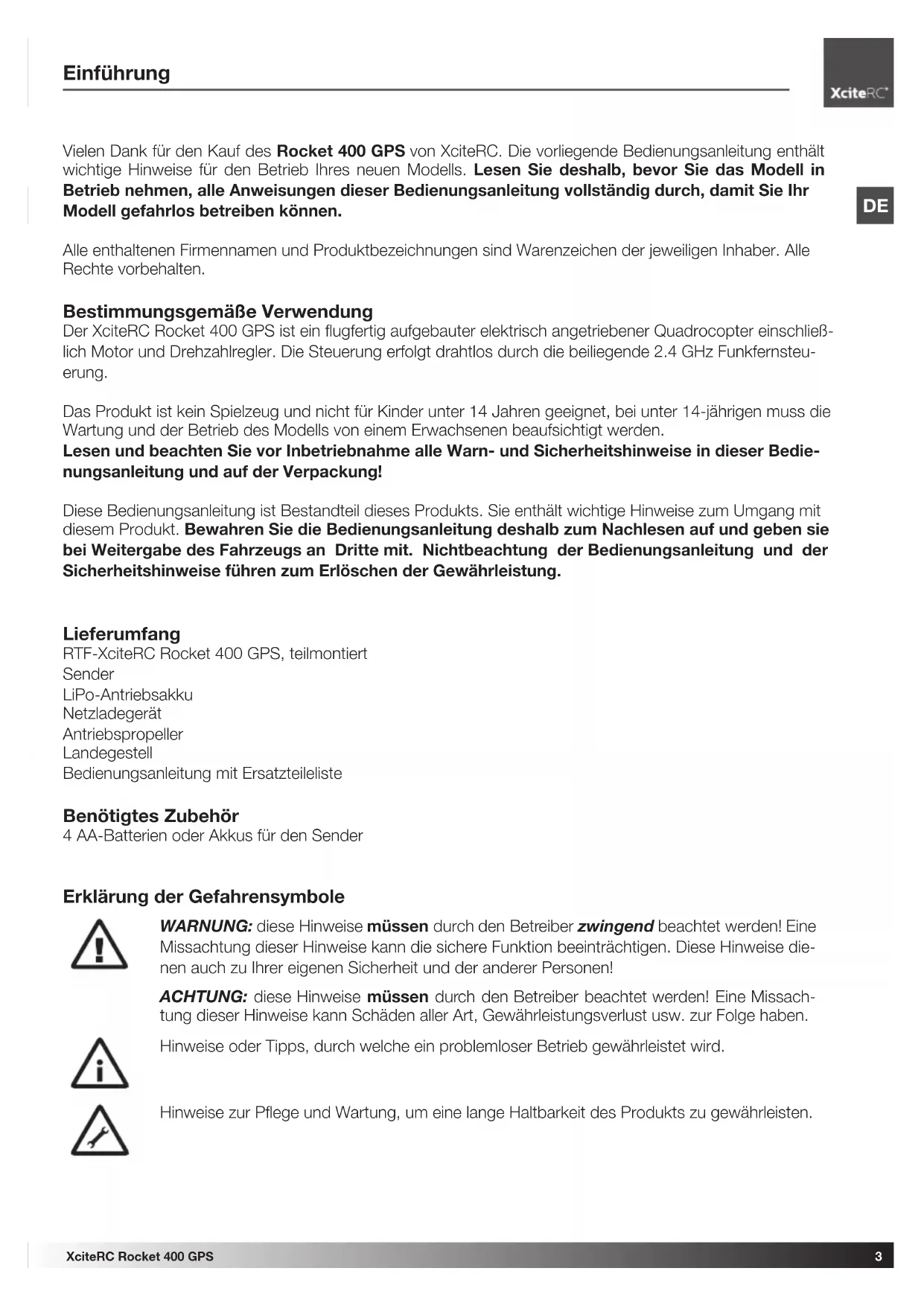 Vielen Dank für den Kauf des Rocket 400 GPS von XciteRC. Die vorliegende Bedienungsanleitung enthält wichtige Hinweise für den Betrieb Ihres neuen Modells. Lesen Sie deshalb, bevor Sie das Modell in Betrieb nehmen, alle Anweisungen dieser Bedienungsanleitung vollständig durch, damit Sie Ihr Modell gefahrlos betreiben können.
