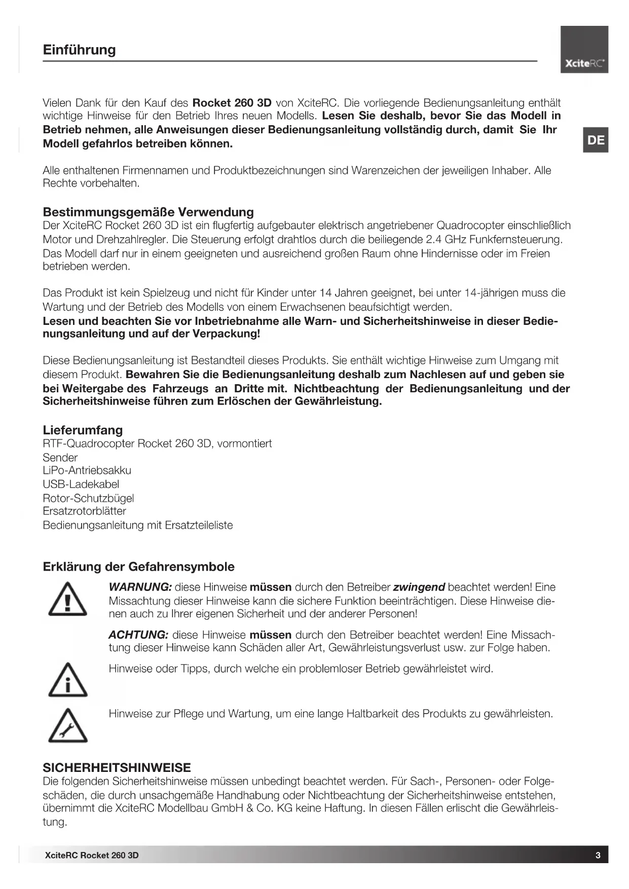 Einführung Vielen Dank für den Kauf des Rocket 260 3D von XciteRC. Die vorliegende Bedienungsanleitung enthält wichtige Hinweise für den Betrieb Ihres neuen Modells. Lesen Sie deshalb, bevor Sie das Modell in Betrieb nehmen, alle Anweisungen dieser Bedienungsanleitung vollständig durch, damit Sie Ihr Modell gefahrlos betreiben können. Alle enthaltenen Firmennamen und Produktbezeichnungen sind Warenzeichen der jeweiligen Inhaber. Alle Rechte vorbehalten. Bestimmungsgemäße Verwendung Der XciteRC Rocket 260 3D ist ein flugfertig aufgebauter elektrisch angetriebener Quadrocopter einschließlich Motor und Drehzahlregler. Die Steuerung erfolgt drahtlos durch die beiliegende 2.4 GHz Funkfernsteuerung. Das Modell darf nur in einem geeigneten und ausreichend großen Raum ohne Hindernisse oder im Freien betrieben werden. Das Produkt ist kein Spielzeug und nicht für Kinder unter 14 Jahren geeignet, bei unter 14-jährigen muss die Wartung und der Betrieb des Modells von einem Erwachsenen beaufsichtigt werden. Lesen und beachten Sie vor Inbetriebnahme alle Warn- und Sicherheitshinweise in dieser Bedie- nungsanleitung und auf der Verpackung! Diese Bedienungsanleitung ist Bestandteil dieses Produkts. Sie enthält wichtige Hinweise zum Umgang mit diesem Produkt. Bewahren Sie die Bedienungsanleitung deshalb zum Nachlesen auf und geben sie bei Weitergabe des Fahrzeugs an Dritte mit. Nichtbeachtung der Bedienungsanleitung und der Sicherheitshinweise führen zum Erlöschen der Gewährleistung. Lieferumfang RTF-Quadrocopter Rocket 260 3D, vormontiert Sender LiPo-Antriebsakku USB-Ladekabel Rotor-Schutzbügel Ersatzrotorblätter Bedienungsanleitung mit Ersatzteileliste Erklärung der Gefahrensymbole WARNUNG: diese Hinweise müssen durch den Betreiber zwingend beachtet werden! Eine Missachtung dieser Hinweise kann die sichere Funktion beeinträchtigen. Diese Hinweise die- nen auch zu Ihrer eigenen Sicherheit und der anderer Personen! ACHTUNG: diese Hinweise müssen durch den Betreiber beachtet werden! Eine Missach- tung dieser Hinweise kann Schäden aller Art, Gewährleistungsverlust usw. zur Folge haben. Hinweise oder Tipps, durch welche ein problemloser Betrieb gewährleistet wird. Hinweise zur Pflege und Wartung, um eine lange Haltbarkeit des Produkts zu gewährleisten. SICHERHEITSHINWEISE Die folgenden Sicherheitshinweise müssen unbedingt beachtet werden. Für Sach-, Personen- oder Folge- schäden, die durch unsachgemäße Handhabung oder Nichtbeachtung der Sicherheitshinweise entstehen, übernimmt die XciteRC Modellbau GmbH & Co. KG keine Haftung. In diesen Fällen erlischt die Gewährleis- tung.4 XciteRC Rocket 260 3D