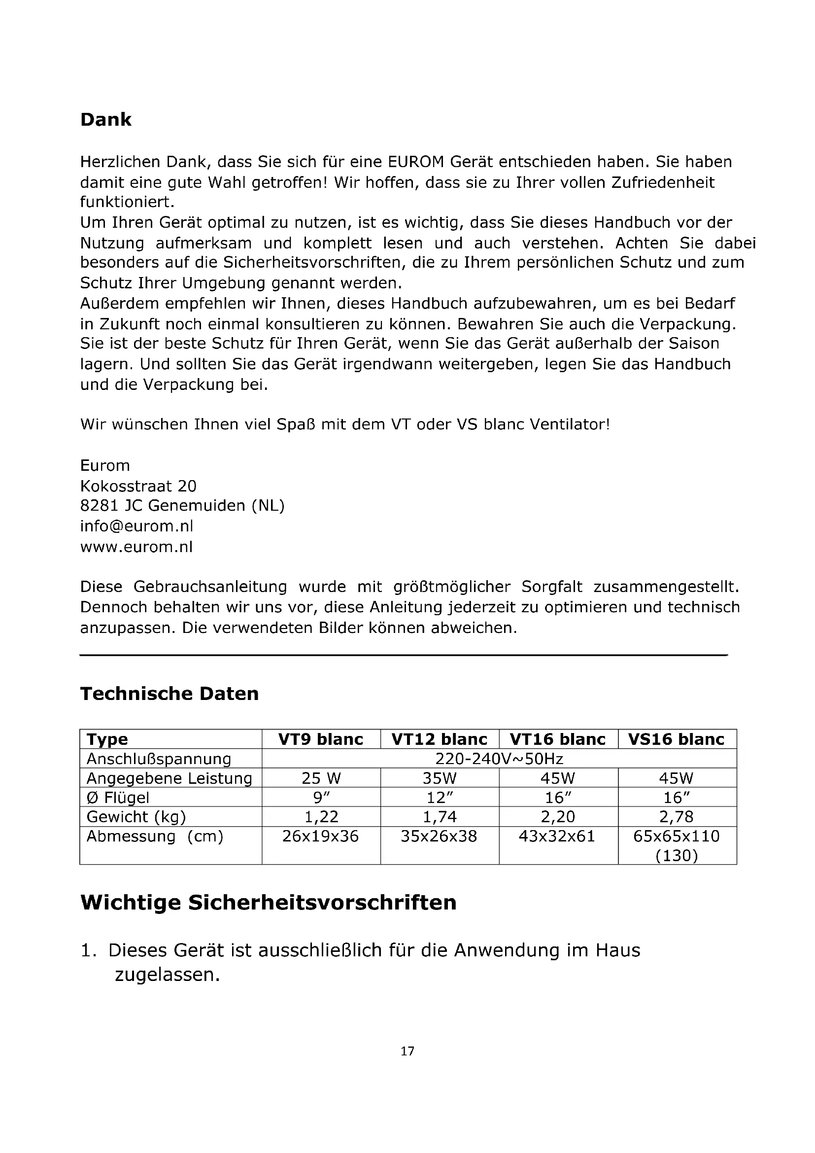 replacing or repairing the electrical cable and plug. Please request original parts if the device needs to be repaired. If the device is subjected to modifications or repairs are carried out by unqualified persons, the guarantees from the supplier, importer and manufacturer will become null and void. Removal In the EU this symbol indicates that this product may not be disposed of as ordinary household waste. Old equipment contains valuable materials, suitable for recycling. These materials should be made suitable for reuse in order to prevent any adverse effects to health and the environment caused by unregulated waste collection. Therefore, please make sure that you bring old equipment to a designated collection point. Alternatively, contact the original supplier, who can make sure that as many of the components as possible can be recycled. CE-statement See page 46.17 Dank Herzlichen Dank, dass Sie sich für eine EUROM Gerät entschieden haben. Sie haben damit eine gute Wahl getroffen! Wir hoffen, dass sie zu Ihrer vollen Zufriedenheit funktioniert. Um Ihren Gerät optimal zu nutzen, ist es wichtig, dass Sie dieses Handbuch vor der Nutzung aufmerksam und komplett lesen und auch verstehen. Achten Sie dabei besonders auf die Sicherheitsvorschriften, die zu Ihrem persönlichen Schutz und zum Schutz Ihrer Umgebung genannt werden. Außerdem empfehlen wir Ihnen, dieses Handbuch aufzubewahren, um es bei Bedarf in Zukunft noch einmal konsultieren zu können. Bewahren Sie auch die Verpackung. Sie ist der beste Schutz für Ihren Gerät, wenn Sie das Gerät außerhalb der Saison lagern. Und sollten Sie das Gerät irgendwann weitergeben, legen Sie das Handbuch und die Verpackung bei. Wir wünschen Ihnen viel Spaß mit dem VT oder VS blanc Ventilator! Eurom Kokosstraat 20 8281 JC Genemuiden (NL) info@eurom.nl www.eurom.nl Diese Gebrauchsanleitung wurde mit größtmöglicher Sorgfalt zusammengestellt. Dennoch behalten wir uns vor, diese Anleitung jederzeit zu optimieren und technisch anzupassen. Die verwendeten Bilder können abweichen.