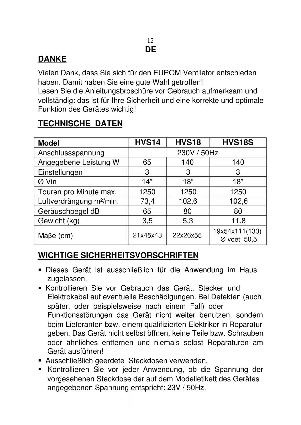 DANKE Vielen Dank, dass Sie sich für den EUROM Ventilator entschieden haben. Damit haben Sie eine gute Wahl getroffen! Lesen Sie die Anleitungsbroschüre vor Gebrauch aufmerksam und vollständig: das ist für Ihre Sicherheit und eine korrekte und optimale Funktion des Gerätes wichtig! TECHNISCHE DATEN Model HVS14 HVS18 HVS18S Anschlussspannung 230V / 50Hz Angegebene Leistung W