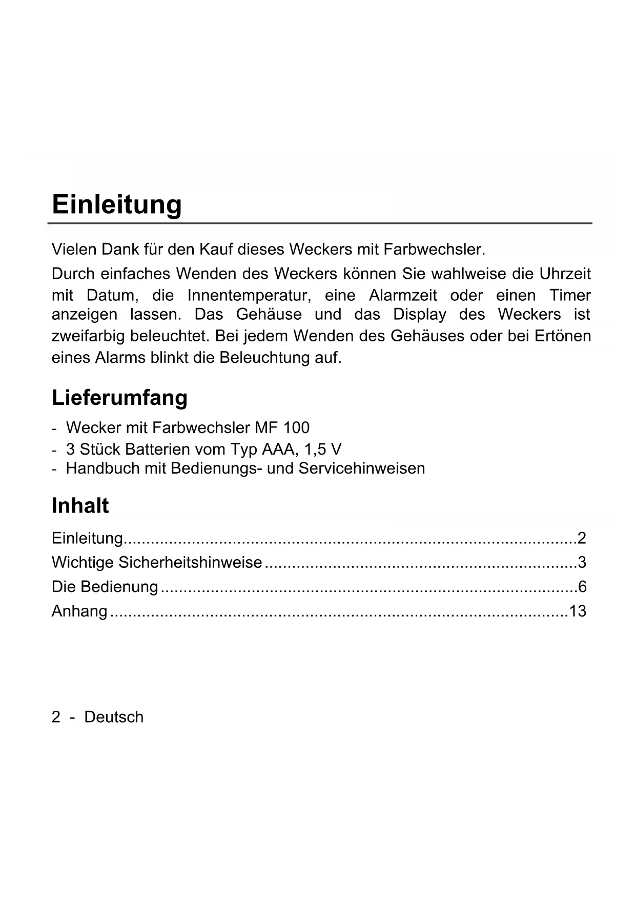 - IAN 46755 Version v1.42 - Deutsch Einleitung Vielen Dank für den Kauf dieses Weckers mit Farbwechsler. Durch einfaches Wenden des Weckers können Sie wahlweise die Uhrzeit mit Datum, die Innentemperatur, eine Alarmzeit oder einen Timer anzeigen lassen. Das Gehäuse und das Display des Weckers ist zweifarbig beleuchtet. Bei jedem Wenden des Gehäuses oder bei Ertönen eines Alarms blinkt die Beleuchtung auf. Lieferumfang - Wecker mit Farbwechsler MF 100 - 3 Stück Batterien vom Typ AAA, 1,5 V - Handbuch mit Bedienungs- und Servicehinweisen Inhalt Einleitung p. 2