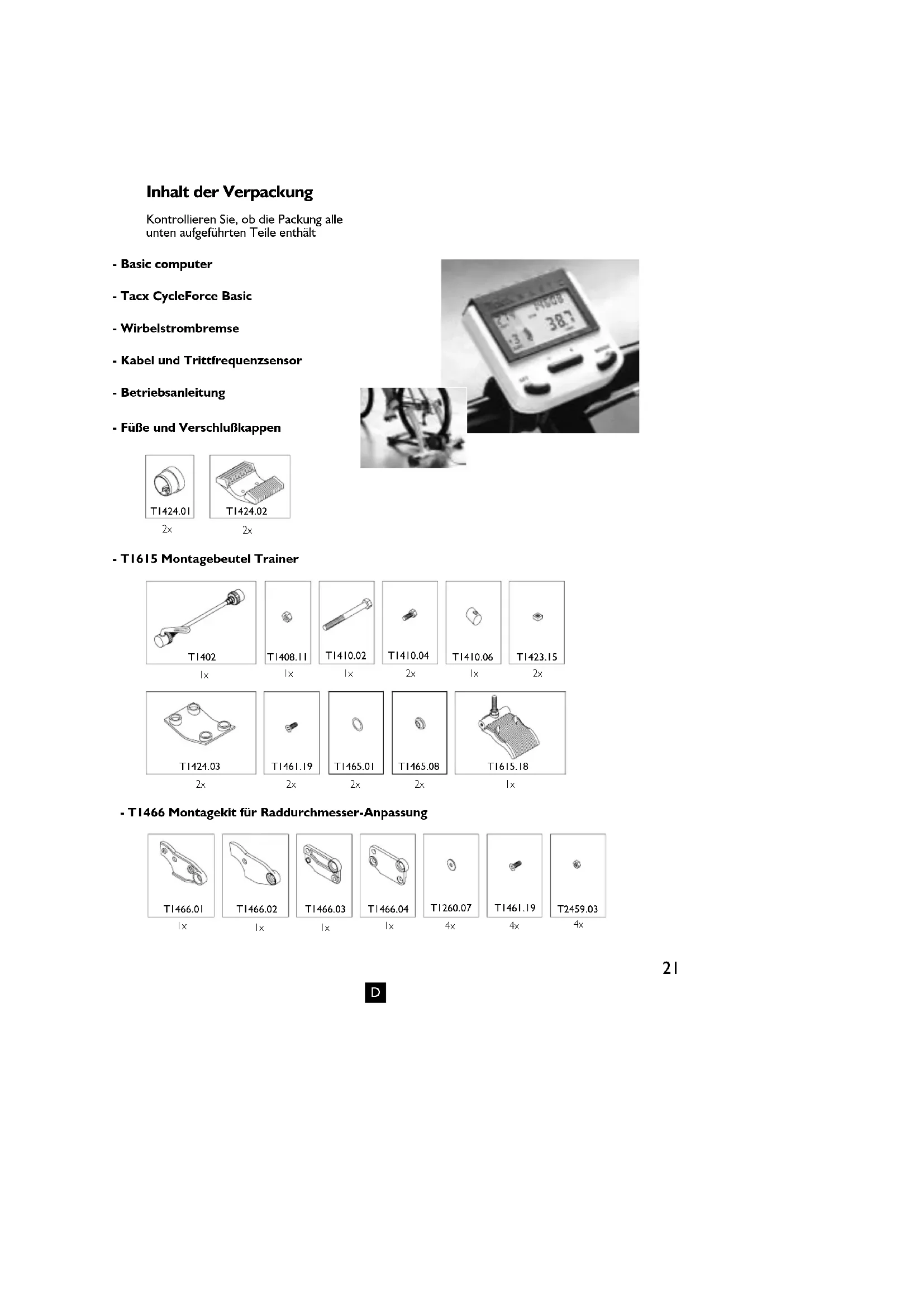 Inhalt der Verpackung Kontrollieren Sie, ob die Packung alle unten aufgeführten Teile enthält - Basic computer - Tacx CycleForce Basic - Wirbelstrombremse - Kabel und Trittfrequenzsensor - Betriebsanleitung T1424.01