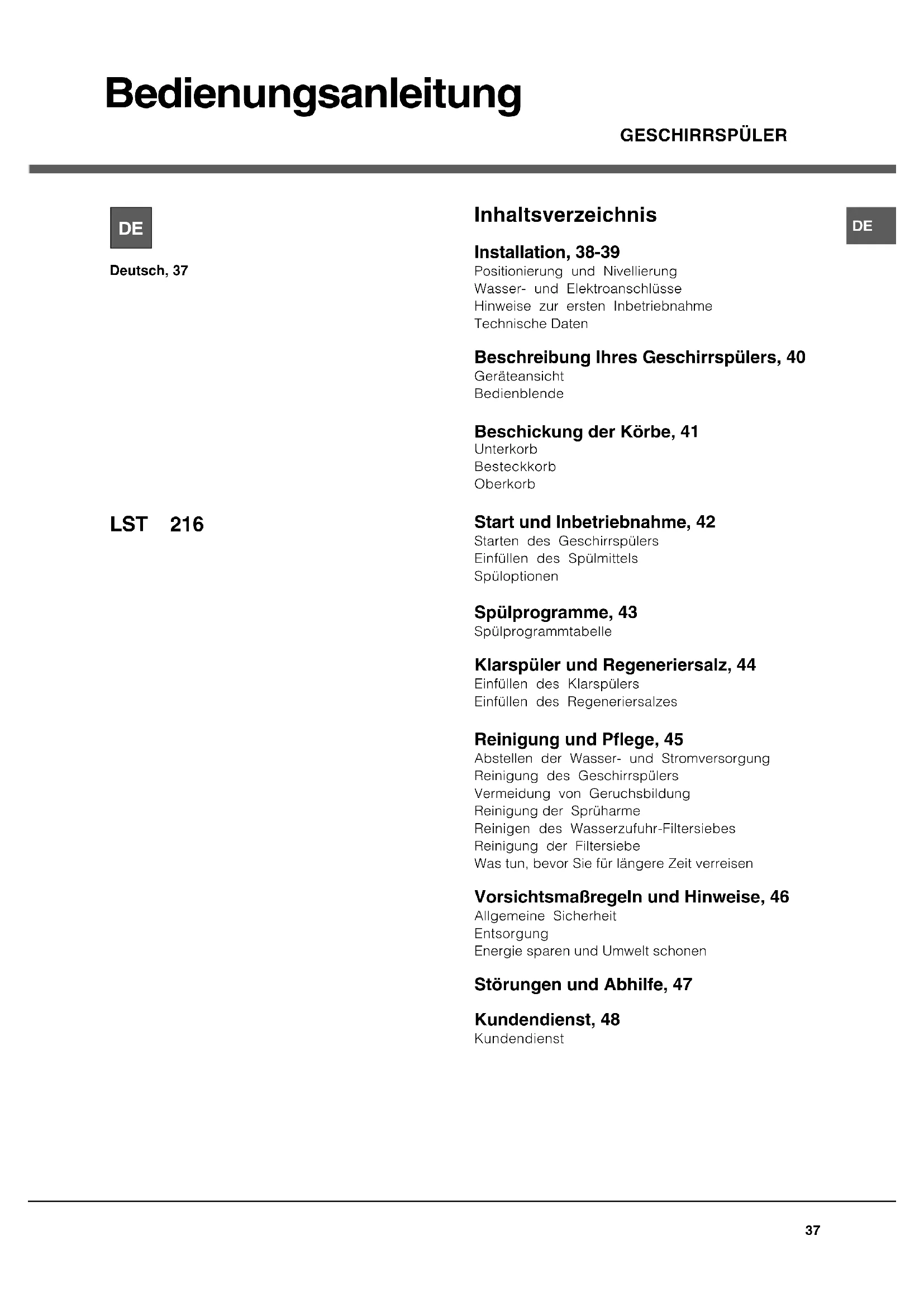 Deutsch, 37 GESCHIRRSPÜLER Inhaltsverzeichnis Installation, 38-39 Positionierung und Nivellierung Wasser- und Elektroanschlüsse Hinweise zur ersten Inbetriebnahme Technische Daten Beschreibung Ihres Geschirrspülers, 40 Geräteansicht Bedienblende Beschickung der Körbe, 41 Unterkorb Besteckkorb Oberkorb Start und Inbetriebnahme, 42 Starten des Geschirrspülers Einfüllen des Spülmittels Spüloptionen Spülprogramme, 43 Spülprogrammtabelle Klarspüler und Regeneriersalz, 44 Einfüllen des Klarspülers Einfüllen des Regeneriersalzes Reinigung und Pflege, 45 Abstellen der Wasser- und Stromversorgung Reinigung des Geschirrspülers Vermeidung von Geruchsbildung Reinigung der Sprüharme Reinigen des Wasserzufuhr-Filtersiebes Reinigung der Filtersiebe Was tun, bevor Sie für längere Zeit verreisen Vorsichtsmaßregeln und Hinweise, 46 Allgemeine Sicherheit Entsorgung Energie sparen und Umwelt schonen Störungen und Abhilfe, 47 Kundendienst, 48 Kundendienst,-