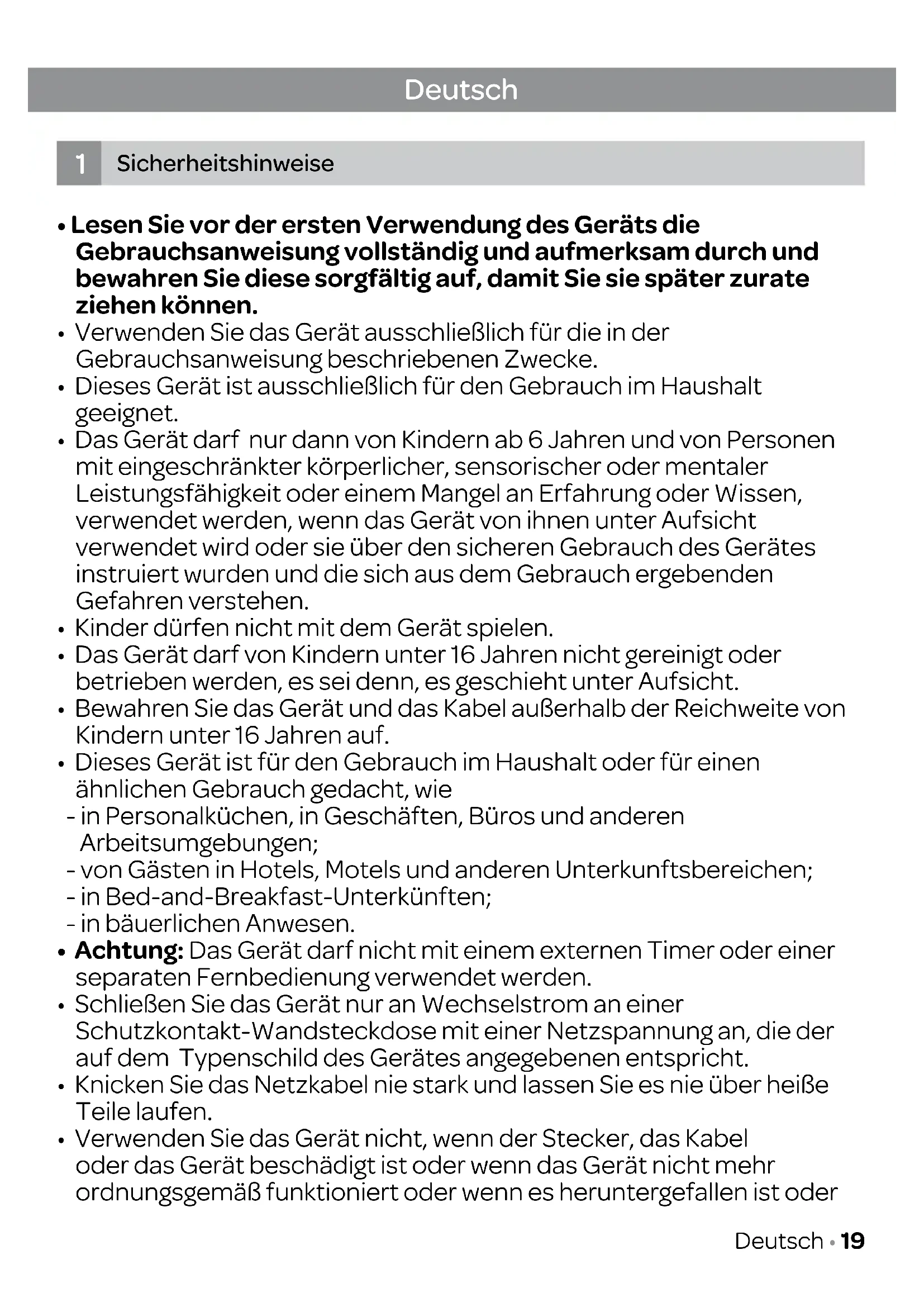 - Dieses Gerät ist ausschließlich für den Gebrauch im Haushalt geeignet.
