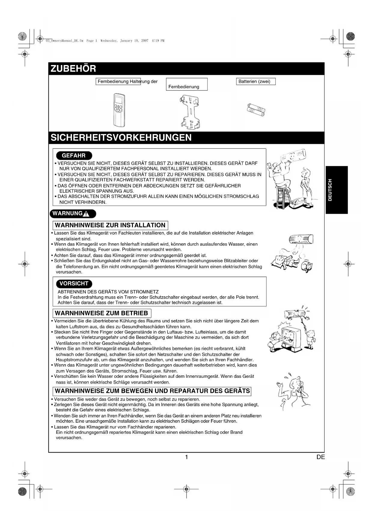 - Lassen Sie das Klimagerät nur vom Fachhändler reparieren. Ein nicht ordnungsgemäß repariertes Klimagerät kann einen elektrischen Schlag oder Brand verursachen. ZUBEHÖR SICHERHEITSVORKEHRUNGEN GEFAHR