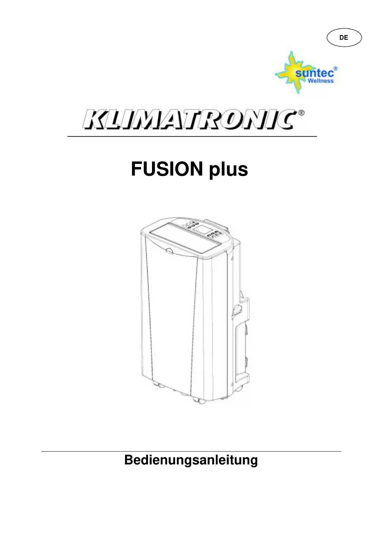 SEHR WICHTIG! Bitte Installieren oder nutzen Sie Ihr lokales mobiles Klimagerät nicht, bevor Sie sich sorgfältig diese Bedienungsanleitung durchgelesen haben. Bitte bewahren Sie diese Bedienungsanleitung für eine etwaige Produktgarantie und als Nachschlagewerk auf.Einleitung Herzlichen Glückwunsch zum Kauf Ihres SUNTEC WELLNESS KLIMATRONIC ® FUSION PLUS Gerätes. Ihre Klimaanlage wurde mit den höchsten Standards modernster Technik entwickelt und hergestellt. Bitte lesen Sie die Bedienungsanleitung aufmerksam durch, bevor Sie Ihr FUSION PLUS Gerät ans Stromnetz anschließen, um Schäden durch nicht sachgemäßen Gebrauch zu vermeiden. Beachten Sie besonders die Sicherheitshinweise. Sollten Sie dieses FUSION PLUS Gerät an Dritte weitergeben, muss diese Bedienungsanleitung mit ausgehändigt werden. Bitte bewahren Sie diese Bedienungsanleitung für eventuelle spätere Fragen auf. Wir danken Ihnen für Ihr Vertrauen und wünschen ein angenehmes Raumklima mit Ihrem lokalen Suntec- Klimagerät. Sicherheitshinweise vor Inbetriebnahme Dieses Gerät kann von Kindern ab 8 Jahren und darüber und von Personen mit reduzierten physischen, sensorischen oder mentalen Fähigkeiten oder Mangel an Erfahrung und/oder Wissen benutzt werden, wenn sie beaufsichtigt oder bezüglich des sicheren Gebrauchs des Gerätes unterwiesen wurden und die daraus resultierenden Gefahren verstanden haben. Kinder dürfen nicht mit dem Gerät spielen. Reinigung und Benutzer-Wartung dürfen nicht durch Kinder ohne Beaufsichtigung durchgeführt werden. Das Gerät ist ausschließlich für die Innennutzung. Eine anderweitige Verwendung ist ausgeschlossen. Lesen Sie alle Anweisungen, Bitte verbinden Sie das Gerät mit geerdete Stromquellen: 220-240VAC, 50 Hz. Ziehen Sie den Netzstecker vor der Montage, Demontage und vor der Reinigung des Gerätes. Betreiben Sie das Gerät immer auf einer horizontalen Oberfläche, um das Auslaufen von Wasser zu vermeiden. Vermeiden Sie das Berühren beweglicher Teile am Gerät. Niemals Finger, Stifte oder andere Gegenstände in das Gerät stecken, wenn der Netzstecker eingesteckt ist und vor allem nicht während des Betriebs. Benutzen Sie die Anleitung für kein anderes Gerät. Das Gerät darf nicht verwendet werden, wenn das Schutzblech nicht der Anleitung entsprechend angebracht wurde. Wenn das Netzkabel Schäden aufweist, muss es aus Sicherheitsgründen von einer qualifizierten Person ersetzt werden, um Gefährdungen zu vermeiden. Verwenden Sie Ihr Gerät nicht mit einem Verlängerungskabel, wenn es nicht von einem Fachmann geprüft wurde. Das lokale Klimagerät muss aufrecht gelagert und transportiert werden, sonst kann es zu irreparablen Schäden am Kompressor kommen kann. Im Zweifelsfall empfehlen wir mindestens 24 Stunden ruhen zu lassen, bevor Sie Ihr lokales Klimagerät starten. Vermeiden Sie einen Neustart des lokalen Klimagerätes, wenn 3 Minuten nach dem Ausschalten vergangen sind, sonst kann der Kompressor beschädigt werden. Verwenden Sie niemals den Netzstecker als Schalter zum Starten und Ausschalten des lokalen Klimagerätes. Verwenden Sie die vorgesehenen ON / OFF Schalter, der sich auf dem Bedienfeld befindet. Stellen Sie die tragbare Klimaanlage auf einen trockenen und festen Platz. Das Gerät muss so positioniert werden, dass der Anschluss zugänglich ist und in Übereinstimmung mit den örtlichen Vorschriften installiert werden. Betreiben Sie dieses Gerät nicht in einem korrodierenden Umfeld. Reinigen Sie den Luftfilter regelmäßig, um die höchstmögliche Effizienz an Kühlung genießen zu können. Die Batterien der Fernbedienung müssen entfernt werden, bevor diese verschrottet und sicher entsorgt werden Betreiben Sie das Gerät nicht in der Nähe offener Feuerstellen. Betreiben Sie das Gerät nicht in einer Umgebung, in der Öl oder Wasser verspritzt werden kann. Vermeiden Sie, das Gerät direktem Sonnenlicht auszusetzen. Bitte decken Sie das Gerät nie ab und achten darauf, dass der Lufteinlass und –auslass niemals blockiert wird. Der Mindestabstand von Möbeln und Wand sollte 50 cmbetragen. Energiespartipps Halten Sie die Filter sauber. Unter normalen Bedingungen sollten die Filter etwa alle 30 Tage gereinigt werden. Häufigere Reinigung ist vielleicht notwendig, jedoch abhängig von der Qualität der Raumluft. Stellen Sie für den ersten Start die Lüftergeschwindigkeit auf die höchste Stufe und den Thermostat auf die kälteste Stufe ein. Um eine bessere Wirkung zu erzielen, empfehlen wir Ihnen, den Kühlmodus nur dann zu benutzen, wenn die Umgebungstemperatur nicht über 35°C liegt. Daher kann es notwendig sein, das Gerät an warmen Tagen früh am Morgen, mit einer kühlen Raumtemperatur unter 35°C zu starten. Die Heizfunktion ist nicht zu empfehlen, wenn die Umgebungstemperatur unter 7°C liegt. Bezeichnung der Ersatzteile/Komponenten