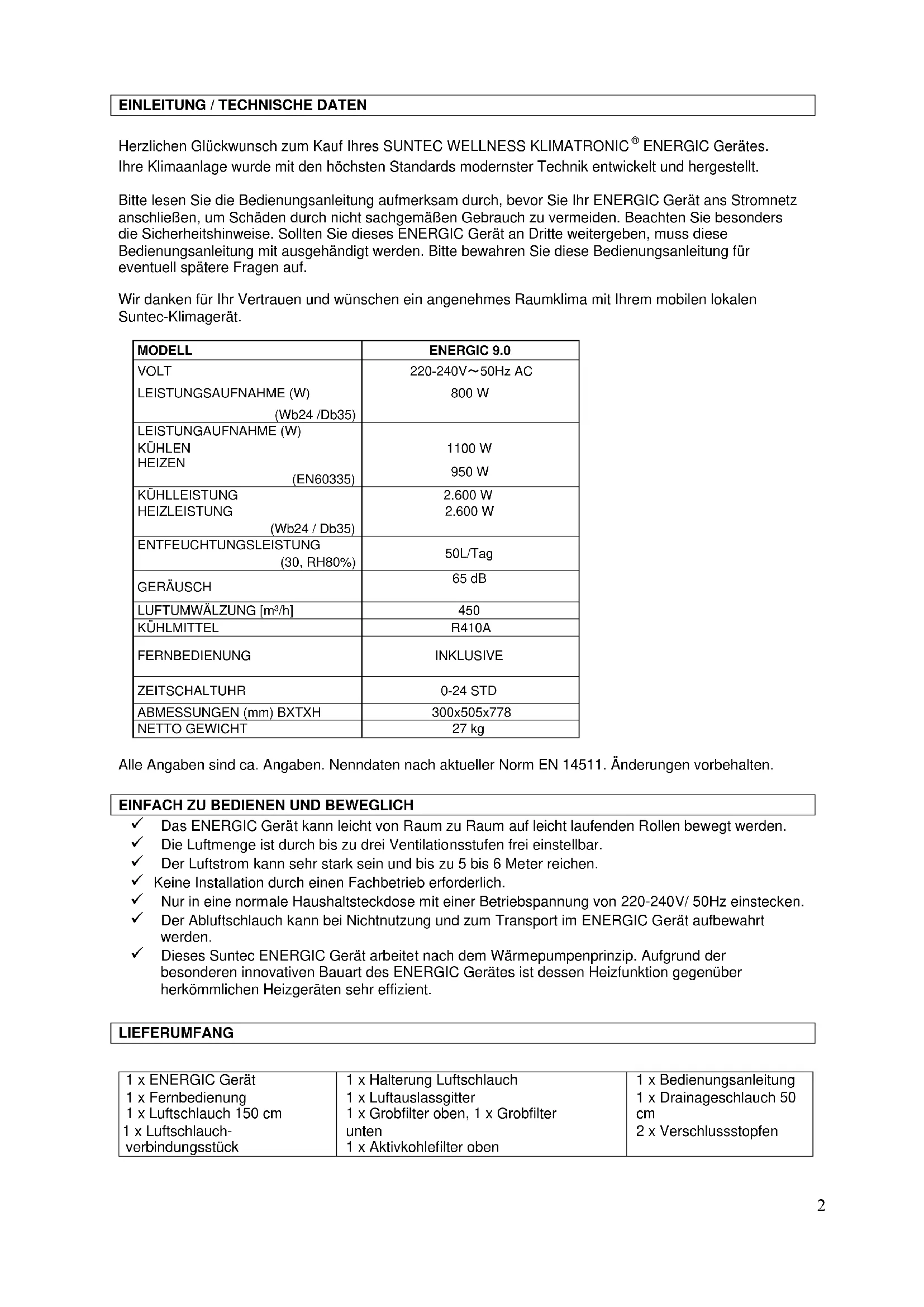ENERGIC Gerätes. Ihre Klimaanlage wurde mit den höchsten Standards modernster Technik entwickelt und hergestellt. Bitte lesen Sie die Bedienungsanleitung aufmerksam durch, bevor Sie Ihr ENERGIC Gerät ans Stromnetz anschließen, um Schäden durch nicht sachgemäßen Gebrauch zu vermeiden. Beachten Sie besonders die Sicherheitshinweise. Sollten Sie dieses ENERGIC Gerät an Dritte weitergeben, muss diese Bedienungsanleitung mit ausgehändigt werden. Bitte bewahren Sie diese Bedienungsanleitung für eventuell spätere Fragen auf. Wir danken für Ihr Vertrauen und wünschen ein angenehmes Raumklima mit Ihrem mobilen lokalen Suntec-Klimagerät. MODELL ENERGIC 9.0 VOLT 220-240V~50Hz AC LEISTUNGSAUFNAHME (W) 800 W (Wb24 /Db35)