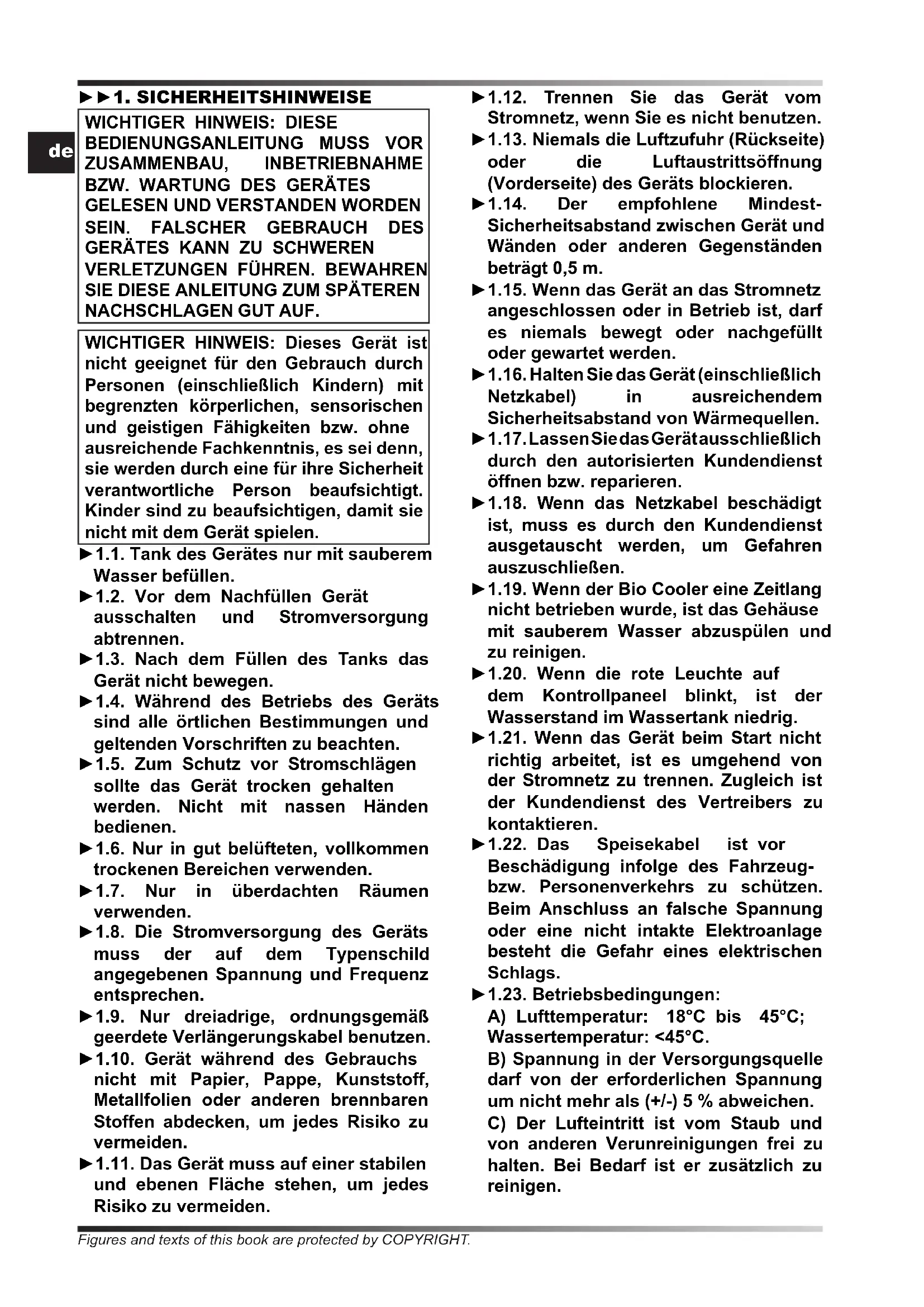 NACHSCHLAGEN GUT AUF. WICHTIGER HINWEIS: Dieses Gerät ist nicht geeignet für den Gebrauch durch Personen (einschließlich Kindern) mit begrenzten körperlichen, sensorischen und geistigen Fähigkeiten bzw. ohne ausreichende Fachkenntnis, es sei denn, sie werden durch eine für ihre Sicherheit verantwortliche Person beaufsichtigt. Kinder sind zu beaufsichtigen, damit sie nicht mit dem Gerät spielen. ►1.1. Tank des Gerätes nur mit sauberem Wasser befüllen. ►1.2. Vor dem Nachfüllen Gerät ausschalten und Stromversorgung abtrennen. ►1.3. Nach dem Füllen des Tanks das Gerät nicht bewegen. ►1.4. Während des Betriebs des Geräts sind alle örtlichen Bestimmungen und geltenden Vorschriften zu beachten. ►1.5. Zum Schutz vor Stromschlägen sollte das Gerät trocken gehalten werden. Nicht mit nassen Händen bedienen. ►1.6. Nur in gut belüfteten, vollkommen trockenen Bereichen verwenden. ►1.7. Nur in überdachten Räumen verwenden. ►1.8. Die Stromversorgung des Geräts muss der auf dem Typenschild angegebenen Spannung und Frequenz entsprechen. ►1.9. Nur dreiadrige, ordnungsgemäß geerdete Verlängerungskabel benutzen. ►1.10. Gerät während des Gebrauchs nicht mit Papier, Pappe, Kunststoff, Metallfolien oder anderen brennbaren Stoffen abdecken, um jedes Risiko zu vermeiden. ►1.11. Das Gerät muss auf einer stabilen und ebenen Fläche stehen, um jedes Risiko zu vermeiden. ►1.12. Trennen Sie das Gerät vom Stromnetz, wenn Sie es nicht benutzen. ►1.13. Niemals die Luftzufuhr (Rückseite) oder die Luftaustrittsöffnung (Vorderseite) des Geräts blockieren. ►1.14. Der empfohlene Mindest- Sicherheitsabstand zwischen Gerät und Wänden oder anderen Gegenständen beträgt 0,5 m. ►1.15. Wenn das Gerät an das Stromnetz angeschlossen oder in Betrieb ist, darf es niemals bewegt oder nachgefüllt oder gewartet werden. ►1.16. Halten Sie das Gerät (einschließlich Netzkabel) in ausreichendem Sicherheitsabstand von Wärmequellen. ►1.17. Lassen Sie das Gerät ausschließlich durch den autorisierten Kundendienst öffnen bzw. reparieren. ►1.18. Wenn das Netzkabel beschädigt ist, muss es durch den Kundendienst ausgetauscht werden, um Gefahren auszuschließen. ►1.19. Wenn der Bio Cooler eine Zeitlang nicht betrieben wurde, ist das Gehäuse mit sauberem Wasser abzuspülen und zu reinigen. ►1.20. Wenn die rote Leuchte auf dem Kontrollpaneel blinkt, ist der Wasserstand im Wassertank niedrig. ►1.21. Wenn das Gerät beim Start nicht richtig arbeitet, ist es umgehend von der Stromnetz zu trennen. Zugleich ist der Kundendienst des Vertreibers zu kontaktieren. ►1.22. Das Speisekabel ist vor Beschädigung infolge des Fahrzeug- bzw. Personenverkehrs zu schützen. Beim Anschluss an falsche Spannung oder eine nicht intakte Elektroanlage besteht die Gefahr eines elektrischen Schlags. ►1.23. Betriebsbedingungen: A) Lufttemperatur: 18°C bis 45°C; Wassertemperatur: <45°C. B) Spannung in der Versorgungsquelle darf von der erforderlichen Spannung um nicht mehr als (+/-) 5 % abweichen. C) Der Lufteintritt ist vom Staub und von anderen Verunreinigungen frei zu halten. Bei Bedarf ist er zusätzlich zu reinigen. Figures and texts of this book are protected by COPYRIGHT.de ►►2. AUSPACKEN ►2.1. Entfernen Sie alle für Verpackung und Versand des Geräts verwendeten Materialien und entsorgen Sie diese vorschriftsgemäß. ►2.2. Nehmen Sie alle Artikel aus der Verpackung. ►2.3. Kontrollieren Sie, ob Transportschäden vorliegen. Wenn das Gerät beschädigt ist, sofort den Vertragshändler informieren, bei dem es erworben wurde. ►►3. ZUSAMMENBAU Das Gerät besitzt Räder, damit es einfacher bewegt werden kann. Je nach Modell sind die Räder bereits montiert oder müssen noch montiert werden. Die Bauteile dazu benden sich zusammen mit den zugehörigen Schrauben zur Montage in der Verpackung (Abb. 1). ►►4. BEDIENUNG WARNHINWEIS: Vor dem Einschalten des Gerätes sind die „SICHERHEITSHINWEISE“ aufmerksam durchzulesen. WARNHINWEIS: Nur sauberes Wasser verwenden, um Defekte und andere Störungen zu vermeiden. WARNHINWEIS: Prüfen Sie, ob Ihre elektrische Anlage ordnungsgemäß geerdet ist. Der Stromanschluss muss gemäß geltenden nationalen Vorschriften vorgenommen werden. Die Stromversorgung des Geräts muss der auf dem Typenschild angegebenen Spannung und Frequenz entsprechen. HINWEIS: Diese Modelle können an einen Wasserversorgungsanschluss mittels Verbindung der Leitung an ein Verbindungselement angeschlossen werden (Abb. 10). ►►4.1. INBETRIEBNAHME: ►4.1.1. Klappe des Tanks öffnen (Abb. 2). ►4.1.2. Wasser in den Tank füllen (Abb. 3), der Wasserstand muss sich zwischen MIN und MAX der Skala an der Seite des Geräts (Abb. 4) benden, um Gefahren zu vermeiden. ►4.1.3. Klappe des Tanks schließen (Abb. 5). ►4.1.4. Netzstecker an das Stromnetz anschließen (Abb. 6). ►4.1.5. Zum Einschalten des Geräts die Taste ON/OFF drücken (Abb. 9). ►►4.2. BEDIENTAFEL, BEDIENUNG