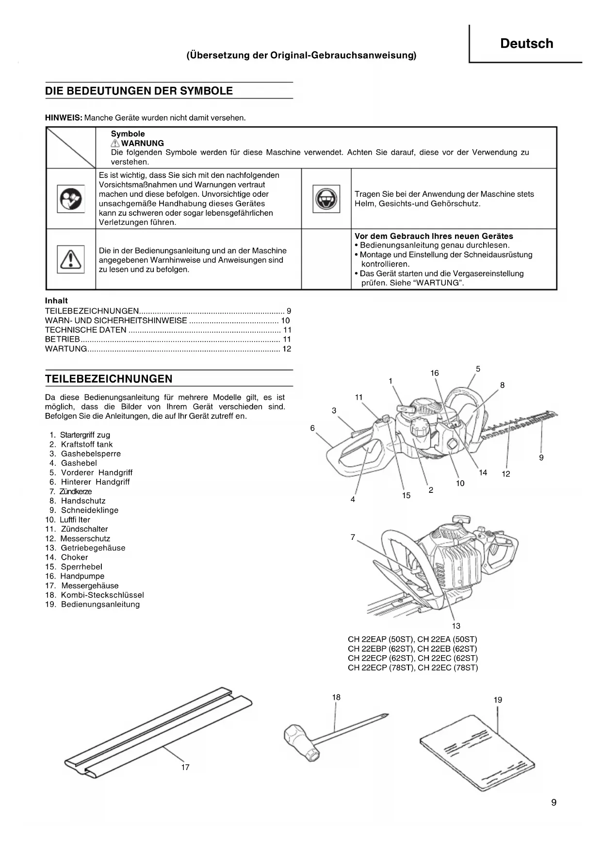 VERLETZUNGEN VERURSACHEN. Lesen Sie sich die Anweisungen zur korrekten Handhabung, Vorbereitung, Wartung, Inbetriebnahme und Abschaltung des Heckenschneiders aufmerksam durch. Machen Sie sich mit allen Bedienelementen und dem sachgemäßen Einsatz des Heckenschneiders vertraut. Sicherheit des Bedieners ○ Stets Gesichtsschutz bzw. Schutzbrille tragen. ○ Stets schwere lange Hosen, Stiefel und Handschuhe tragen. Das Gerät darf nicht in lockerer Kleidung, mit Schmuck, in kurzen Hosen, Sandalen oder barfuß betrieben werden. Das Haar ist so zu sichern, daß es nicht über die Schulter herunterhängt. ○ Dieses Gerät darf nicht von Personen bedient werden, die übermüdet oder krank sind, oder unter Alkohol-, Drogen-, oder Medikamenteneinfl uss stehen. ○ Man darf niemals erlauben, daß ein Kind oder eine unerfahrene Person die Maschine betätigt. ○ Seien Sie bei Überlandleitungen vorsichtig. ○ Helm, Gesichts- und Gehörschutz tragen. ○ Der Motor darf nie in geschlossenen Räumen oder Gebäuden angelassen bzw. betrieben werden. Die Abgase können zum Tod führen. ○ Die Griff e müssen frei von Öl und Kraftstoff bleiben. ○ Hände weg von den Schneidmessern! ○ Das Gerät nicht an der Schneidausrüsung aufheben oder halten. ○ Nach dem Ausschalten des Motors unbedingt mit dem Abstellen des Geräts warten, bis die Schneidemesser vollständig stillstehen. ○ Bei Dauerbetrieb gelegentlich eine Pause einlegen als vorbeugende Maßnahme gegen das Hand-/Arm-Syndrom, das durch ständige Vibration verursacht werden könnte. ○ Falls der Schneidmechanismus irgendwelche Fremdkörper triff t oder der Heckenschneider ungewöhnliche Betriebsgeräusche oder Vibrationen abgibt, schalten Sie das Gerät aus und warten, bis der Heckenschneider zum Stillstand gekommen ist. Trennen Sie den Zündkerzenstecker von der Zündkerze; befolgen Sie die nachstehenden Schritte: