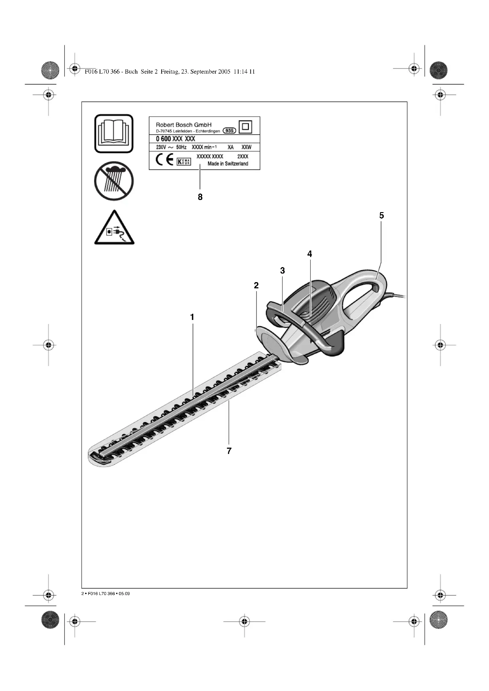 F016 L70 366 - Buch Seite 3 Freitag, 23. September 2005 11:14 11Deutsch - 1 Achtung! Lesen Sie die nachfolgenden Anwei- sungen sorgfältig durch und machen Sie sich mit den Bedienelementen und dem ordnungsge- mäßen Gebrauch der Heckenschere vertraut. Bewahren Sie die Bedienungsanleitung für eine spätere Verwendung sicher auf. Wenn die He- ckenschere nicht vorschriftsmäßig verwendet wird, kann dies zu schweren Verletzungen füh- ren. Bei der Verwendung von Elektrowerkzeu- gen müssen die allgemeinen und die nachfol- genden Sicherheitshinweise beachtet werden, um das Risiko vor Feuer, elektrischem Schlag und Verletzung zu vermindern. Erklärung der Bildsymbole: Die Bedienungsanleitung durchlesen. Die Heckenschere darf nicht bei Regen oder an nassen Hecken benutzt werden. Ausschalten und Stecker ziehen vor Einstell- und Reinigungsarbeiten, wenn das Kabel ver- wickelt, zerschnitten oder beschädigt ist und wenn die Heckenschere auch nur für kurze Dauer unbeaufsichtigt liegengelassen wird. ■ Während des Betriebes dürfen sich im Umkreis von 3 m keine anderen Personen oder Tiere auf- halten. ■ Die Heckenschere niemals am Messerbalken an- fassen. ■ Niemals Kindern oder mit diesen Anweisungen nicht vertrauten Personen erlauben die Hecken- schere zu benutzen. Nationale Vorschriften be- schränken möglicherweise das Alter des Bedieners. ■ Niemals schneiden, während sich Personen, ins- besondere Kinder oder Haustiere, in unmittelba- rer Nähe aufhalten. ■ Der Bediener oder Nutzer ist für Unfälle oder Schäden an anderen Menschen oder deren Ei- gentum verantwortlich. ■ Die Heckenschere nicht benutzen, wenn man barfuß läuft oder offene Sandalen trägt. Tragen Sie stets festes Schuhwerk und eine lange Hose. Das Tragen von festen Handschuhen, rutschfes- tem Schuhwerk und einer Schutzbrille wird emp- fohlen. Keine lose Kleidung oder Schmuck tra- gen, welche sich in bewegenden Teilen verfan- gen können. ■ Die zu schneidende Fläche sorgfältig inspizieren und alle Drähte und sonstige Fremdkörper besei- tigen. ■ Vor der Benutzung immer durch Augenschein prüfen, ob die Messer, die Messerschrauben und andere Teile des Schneidwerks abgenützt oder beschädigt sind. Nie mit beschädigtem oder stark abgenütztem Schneidwerk arbeiten. ■ Vor jedem Gebrauch das Verlängerungskabel kontrollieren und bei Bedarf auswechseln. Schüt- zen Sie das Stromkabel vor Hitze, Öl und schar- fen Kanten. ■ Machen Sie sich mit der Heckenschere vertraut um sie im Notfall schnell zu stoppen. ■ Hecken nur bei Tageslicht oder gutem künstli- chen Licht schneiden. ■ Die Heckenschere niemals mit defekten oder nicht montierten Schutzvorrichtungen betreiben. ■ Sicherstellen, dass alle mitgelieferten Griffe und Schutzvorrichtungen beim Betrieb der Hecken- schere montiert sind. Niemals eine unvollstän- dige Heckenschere oder eine, an der unerlaubte Modifizierungen vorgenommen wurden, verwen- den. ■ Die Heckenschere immer mit beiden Händen füh- ren. ■ Die Heckenschere nie an der Schutzvorrichtung halten. ■ Das Kabel vom Arbeitsbereich fernhalten. ■ Beim Betrieb der Heckenschere stets auf einen sicheren Stand achten und immer das Gleichge- wicht halten, insbesondere bei der Benutzung von Stufen oder Leitern. ■ Aufmerksam die Umgebung beobachten und auf mögliche Gefahren gefasst sein, die beim Arbei- ten unter Umständen überhört werden könnten. ■ Netzstecker aus der Steckdose ziehen: – vor einer Überprüfung, Beseitigung einer Blockie- rung oder Arbeiten an der Heckenschere. – nach dem Kontakt mit einem Fremdkörper. Die Heckenschere auf Beschädigungen überprüfen und wenn nötig instandsetzen lassen. – wenn die Heckenschere wegen abnormaler Vib- ration überprüft wird. ■ Den Festsitz aller Muttern, Bolzen und Schrau- ben sicherstellen, um zu gewährleisten, dass sich die Heckenschere in einem sicheren Arbeitszu- stand befindet. ■ Nach dem Gebrauch die Heckenschere sicher mit abgedeckten Messern lagern. Die Hecken- schere sollte trocken und für Kinder unerreichbar hoch oder verschlossen aufbewahrt werden. ■ Sicherheitshalber abgenutzte oder beschädigte Teile auswechseln. ■ Nicht versuchen das Gerät zu reparieren, es sei denn, Sie besitzen die notwendige Ausbildung. ■ Stellen Sie sicher, dass auszuwechselnde Teile von Bosch stammen. Sicherheitshinweise F016 L70 366 - Buch Seite 1 Freitag, 23. September 2005 11:14 11 4 • F016 L70 366 • 05.09Deutsch - 2 Das Gerät ist bestimmt für das Schneiden und Stut- zen von Hecken und Büschen in Haus- und Hobby- gärten. Dieses Handbuch enthält Anweisungen über die richtige Montage und den sicheren Gebrauch Ihrer Heckenschere. Es ist wichtig, dass Sie diese Anwei- sungen sorgfältig lesen. Alle Teile des Gerätes sind vorsichtig aus der Verpa- ckung zu entnehmen und auf Vollständigkeit zu überprüfen: – Heckenschere – Messerschutz – Bedienungsanleitung Wenn Teile fehlen oder beschädigt sind, wenden Sie sich bitte an Ihren Händler. 1 Messerbalken 2 Handschutz für vorderen Griff 3 Vorderer Griffbügel mit Schalthebel 4 Lüftungsschlitze 5 Hinterer Griff mit Ein-/Ausschalter 6 Netzstecker** 7 Messerschutz 8 Seriennummer **länderspezifisch Abgebildetes oder beschriebenes Zubehör gehört teilweise nicht zum Lieferumfang. Elektrische Sicherheit Ihre Maschine ist zur Sicherheit schutzisoliert und benötigt keine Erdung. Die Betriebsspannung be- trägt 230 V AC, 50 Hz (für Nicht-EU Länder 220 V, 240 V je nach Ausführung). Nur zugelassene Ver- längerungskabel verwenden. Informationen erhal- ten Sie bei Ihrer autorisierten Kundendienststelle. Gerätekennwerte Heckenschere AHS 400 - 24T AHS 480 - 24T AHS 550 - 24ST AHS 600 - 24ST Bestellnummer 3 600 H48 0.. 3 600 H48 1.. 3 600 H48 2.. 3 600 H48 3.. Nennaufnahme 550 W 550 W 600 W 600 W Leerlaufhubzahl 1400 min