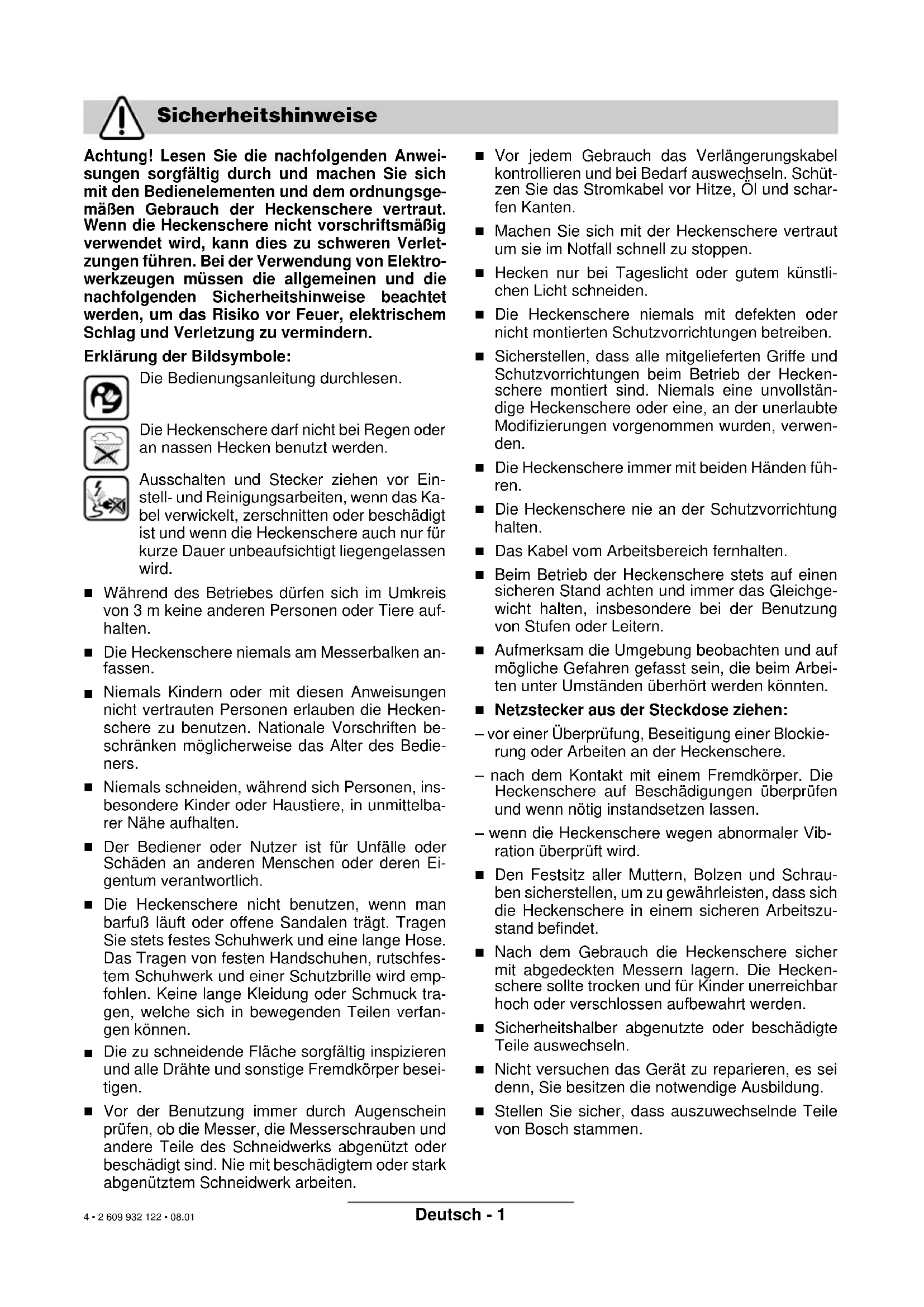 6 8Deutsch - 1 Achtung! Lesen Sie die nachfolgenden Anwei- sungen sorgfältig durch und machen Sie sich mit den Bedienelementen und dem ordnungsge- mäßen Gebrauch der Heckenschere vertraut. Wenn die Heckenschere nicht vorschriftsmäßig verwendet wird, kann dies zu schweren Verlet- zungen führen. Bei der Verwendung von Elektro- werkzeugen müssen die allgemeinen und die nachfolgenden Sicherheitshinweise beachtet werden, um das Risiko vor Feuer, elektrischem Schlag und Verletzung zu vermindern. Erklärung der Bildsymbole: Die Bedienungsanleitung durchlesen. Die Heckenschere darf nicht bei Regen oder an nassen Hecken benutzt werden. Ausschalten und Stecker ziehen vor Ein- stell- und Reinigungsarbeiten, wenn das Ka- bel verwickelt, zerschnitten oder beschädigt ist und wenn die Heckenschere auch nur für kurze Dauer unbeaufsichtigt liegengelassen wird.
