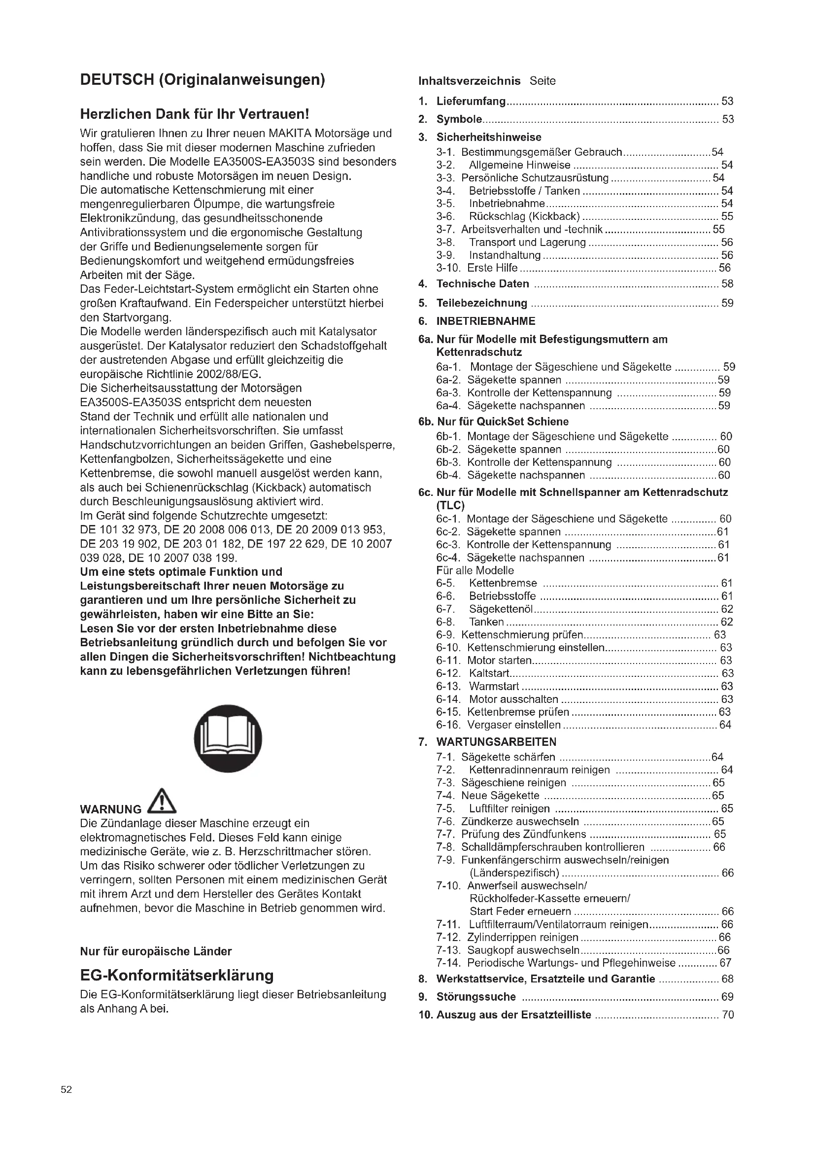N’utilisez que des pièces de rechange d’origine MAKITA. Pour les réparations et la rechange pour d’autres pièces, votre atelier spécialisé MAKITA est compétent. EA3500S, 3501S EA3502S, 3503S Pos. Désignation 1 Guide à êtoile 3/8”, 30 cm, 1,3 mm (12”) Guide à êtoile 3/8”, 35 cm, 1,3 mm (14”) Guide à êtoile 3/8”, 40 cm, 1,3 mm (16”) 2 Chaîne de sciage 3/8” pour 30 cm, 1,3 mm Chaîne de sciage 3/8” pour 35 cm, 1,3 mm Chaîne de sciage 3/8” pour 40 cm, 1,3 mm 1 Guide à êtoile 3/8”, 30 cm, 1,1 mm (12”) Guide à êtoile 3/8”, 35 cm, 1,1 mm (14”) 2 Chaîne de sciage 3/8” pour 30 cm, 1,1 mm Chaîne de sciage 3/8” pour 35 cm, 1,1 mm 1 Guide à êtoile 3/8”, 30 cm, 1,3 mm (12”) Guide à êtoile 3/8”, 35 cm, 1,3 mm (14”) Guide à êtoile 3/8”, 40 cm, 1,3 mm (16”) 2 Chaîne de sciage 3/8” pour 30 cm, 1,3 mm Chaîne de sciage 3/8” pour 35 cm, 1,3 mm Chaîne de sciage 3/8” pour 40 cm, 1,3 mm 1 Guide à êtoile 3/8”, 30 cm, 1,1 mm (12”) Guide à êtoile 3/8”, 35 cm, 1,1 mm (14”) 2 Chaîne de sciage 3/8” pour 30 cm, 1,1 mm Chaîne de sciage 3/8” pour 35 cm, 1,1 mm 3 Protège-guide pour 30-35 cm (3/8”) Protège-guide pour 40 cm (3/8”) 4 Clé combinée Ouverture 16/13 6 Tournevis pour carburateur 7 Crépine d’aspiration 8 Bouchon du réservoir d’essence complet 9 O-Ring 29,3 x 3,6 mm 10 Cassette de ressort d’appel cpl. 11 Ressort 12 Entraîneur 13 Cordon de lancement 3 x 900 mm 14 Bougie 15 Capuchon cpl. réservoir huile 16 O-Ring 29,3 x 3,6 mm 17 Filtre à air 18 Protection cpl. roue à chaîne Protège-pignon (avec tendeur rapide) complet 19 Ecrou hexag. M8 20 Tambour d’accouplement cpl 3/8”, 6-dents 21 Disque 22 Rondelle de sûreté 23 Ecran pare-étincelles (selon les pays) Accessoires (non compris dans la livraison) 25 Jauge de mesure des chaînes 26 Manche de lime 27 Lime ronde ø 4,5 mm 28 Lime ronde ø 4,0 mm 29 Lime plate 30 Porte lime (avec lime ronde ø 4,5 mm) 31 Porte lime (avec lime ronde ø 4,0 mm) 32 Tournevis coudé - Nourrice combinée (pour 5l carburant, 3l huile de chaîne de sciage)52 DEUTSCH (Originalanweisungen) Herzlichen Dank für Ihr Vertrauen! Wir gratulieren Ihnen zu Ihrer neuen MAKITA Motorsäge und hoffen, dass Sie mit dieser modernen Maschine zufrieden sein werden. Die Modelle EA3500S-EA3503S sind besonders handliche und robuste Motorsägen im neuen Design. Die automatische Kettenschmierung mit einer mengenregulierbaren Ölpumpe, die wartungsfreie Elektronikzündung, das gesundheitsschonende Antivibrationssystem und die ergonomische Gestaltung der Griffe und Bedienungselemente sorgen für Bedienungskomfort und weitgehend ermüdungsfreies Arbeiten mit der Säge. Das Feder-Leichtstart-System ermöglicht ein Starten ohne großen Kraftaufwand. Ein Federspeicher unterstützt hierbei den Startvorgang. Die Modelle werden länderspezisch auch mit Katalysator ausgerüstet. Der Katalysator reduziert den Schadstoffgehalt der austretenden Abgase und erfüllt gleichzeitig die europäische Richtlinie 2002/88/EG. Die Sicherheitsausstattung der Motorsägen EA3500S-EA3503S entspricht dem neuesten Stand der Technik und erfüllt alle nationalen und internationalen Sicherheitsvorschriften. Sie umfasst Handschutzvorrichtungen an beiden Griffen, Gashebelsperre, Kettenfangbolzen, Sicherheitssägekette und eine Kettenbremse, die sowohl manuell ausgelöst werden kann, als auch bei Schienenrückschlag (Kickback) automatisch durch Beschleunigungsauslösung aktiviert wird. Im Gerät sind folgende Schutzrechte umgesetzt: DE 101 32 973, DE 20 2008 006 013, DE 20 2009 013 953, DE 203 19 902, DE 203 01 182, DE 197 22 629, DE 10 2007 039 028, DE 10 2007 038 199. Um eine stets optimale Funktion und Leistungsbereitschaft Ihrer neuen Motorsäge zu garantieren und um Ihre persönliche Sicherheit zu gewährleisten, haben wir eine Bitte an Sie: Lesen Sie vor der ersten Inbetriebnahme diese Betriebsanleitung gründlich durch und befolgen Sie vor allen Dingen die Sicherheitsvorschriften! Nichtbeachtung kann zu lebensgefährlichen Verletzungen führen! WARNUNG Die Zündanlage dieser Maschine erzeugt ein elektromagnetisches Feld. Dieses Feld kann einige medizinische Geräte, wie z. B. Herzschrittmacher stören. Um das Risiko schwerer oder tödlicher Verletzungen zu verringern, sollten Personen mit einem medizinischen Gerät mit ihrem Arzt und dem Hersteller des Gerätes Kontakt aufnehmen, bevor die Maschine in Betrieb genommen wird. Nur für europäische Länder EG-Konformitätserklärung Die EG-Konformitätserklärung liegt dieser Betriebsanleitung als Anhang A bei. Inhaltsverzeichnis Seite