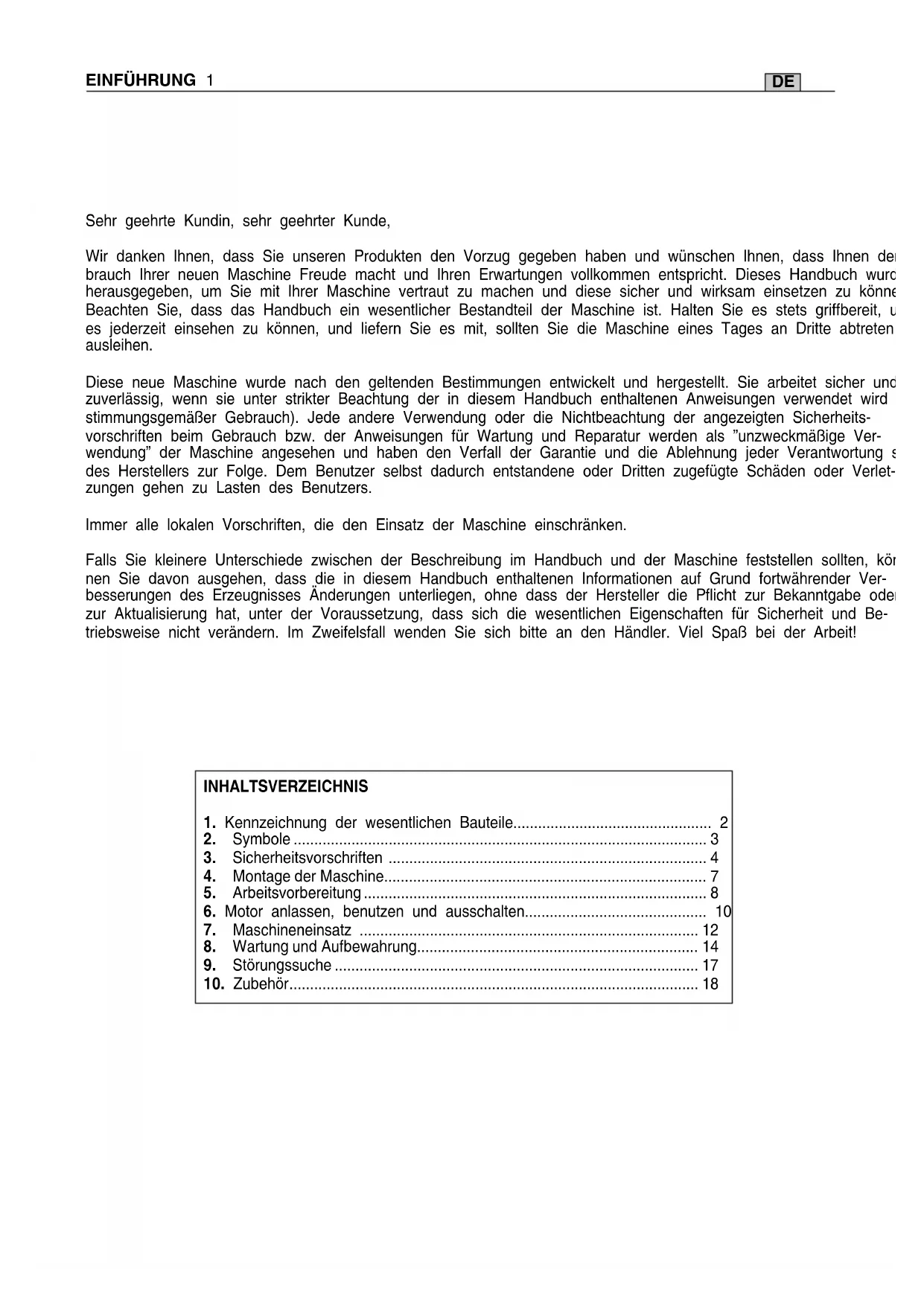 (21BPX078X) Pour les pièces de rechange, utiliser uniquement les chaînes et les barres susmentionnées. L'emploi de combinaisons non approuvées peut provoquer une série de lésions personnelles et endommager la machine. ATTENTION!DE EINFÜHRUNG 1 Sehr geehrte Kundin, sehr geehrter Kunde, Wir danken Ihnen, dass Sie unseren Produkten den Vorzug gegeben haben und wünschen Ihnen, dass Ihnen der Ge- brauch Ihrer neuen Maschine Freude macht und Ihren Erwartungen vollkommen entspricht. Dieses Handbuch wurde herausgegeben, um Sie mit Ihrer Maschine vertraut zu machen und diese sicher und wirksam einsetzen zu können. Beachten Sie, dass das Handbuch ein wesentlicher Bestandteil der Maschine ist. Halten Sie es stets griffbereit, um es jederzeit einsehen zu können, und liefern Sie es mit, sollten Sie die Maschine eines Tages an Dritte abtreten oder ausleihen. Diese neue Maschine wurde nach den geltenden Bestimmungen entwickelt und hergestellt. Sie arbeitet sicher und zuverlässig, wenn sie unter strikter Beachtung der in diesem Handbuch enthaltenen Anweisungen verwendet wird (Be- stimmungsgemäßer Gebrauch). Jede andere Verwendung oder die Nichtbeachtung der angezeigten Sicherheits- vorschriften beim Gebrauch bzw. der Anweisungen für Wartung und Reparatur werden als ”unzweckmäßige Ver- wendung” der Maschine angesehen und haben den Verfall der Garantie und die Ablehnung jeder Verantwortung seitens des Herstellers zur Folge. Dem Benutzer selbst dadurch entstandene oder Dritten zugefügte Schäden oder Verlet- zungen gehen zu Lasten des Benutzers. Immer alle lokalen Vorschriften, die den Einsatz der Maschine einschränken. Falls Sie kleinere Unterschiede zwischen der Beschreibung im Handbuch und der Maschine feststellen sollten, kön- nen Sie davon ausgehen, dass die in diesem Handbuch enthaltenen Informationen auf Grund fortwährender Ver- besserungen des Erzeugnisses Änderungen unterliegen, ohne dass der Hersteller die Pflicht zur Bekanntgabe oder zur Aktualisierung hat, unter der Voraussetzung, dass sich die wesentlichen Eigenschaften für Sicherheit und Be- triebsweise nicht verändern. Im Zweifelsfall wenden Sie sich bitte an den Händler. Viel Spaß bei der Arbeit! INHALTSVERZEICHNIS