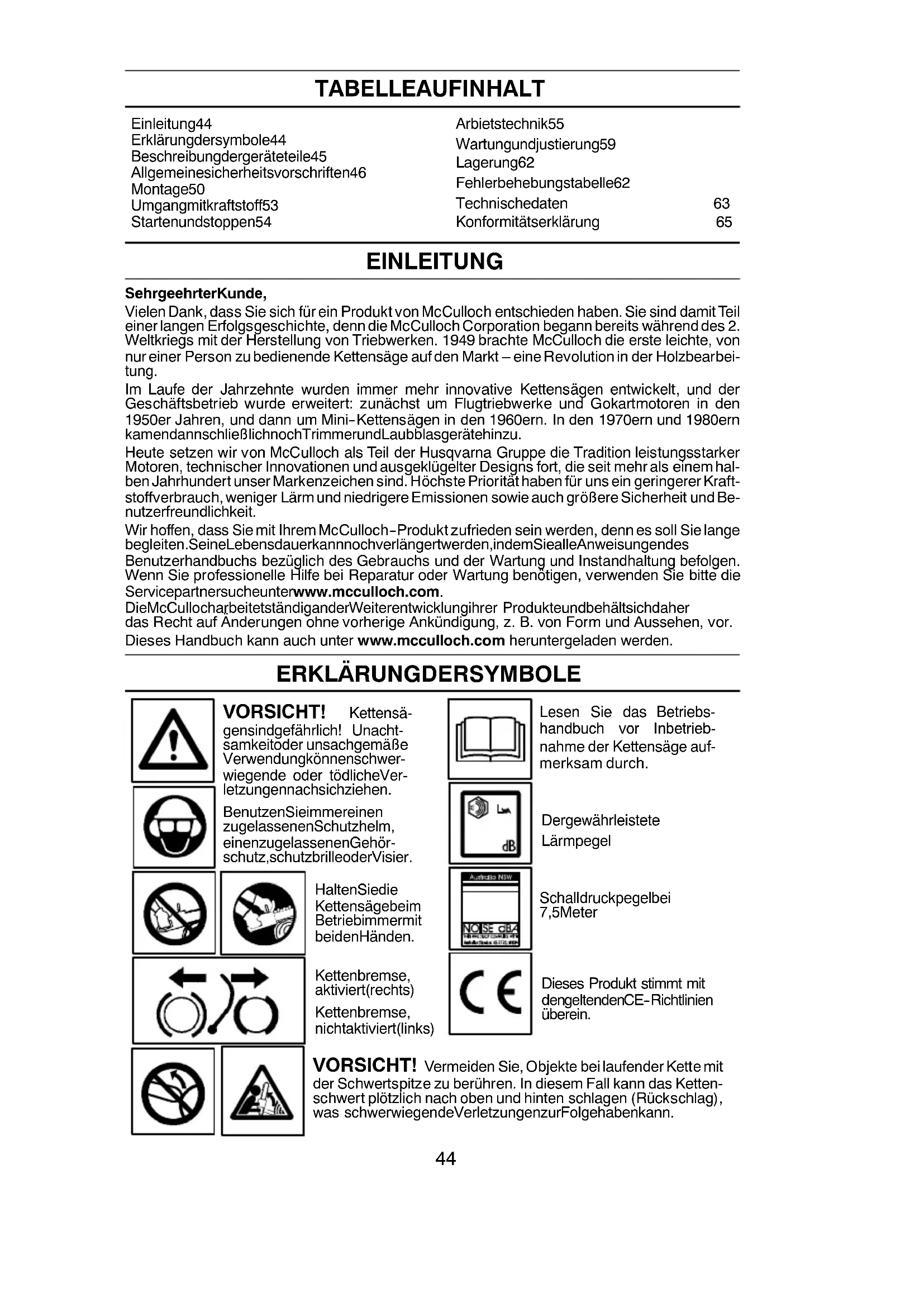 Einleitung 44 Erklärung der symbole 44 Beschreibung der geräteteile 45 Allgemeine sicherheitsvorschriften 46 Montage 50 Umgang mit kraftstoff 53 Starten und stoppen 54 Arbietstechnik 55 Wartung und justierung 59 Lagerung 62 Fehlerbehebungstabelle 62 Technische daten 63 Konformitätserklärung 65 EINLEITUNG Sehr geehrter Kunde, Vielen Dank, dass Sie sich für ein Produkt von McCulloch entschieden haben. Sie sind damit Teil einer langen Erfolgsgeschichte, denn die McCulloch Corporation begann bereits während des 2. Weltkriegs mit der Herstellung von Triebwerken. 1949 brachte McCulloch die erste leichte, von nur einer Person zu bedienende Kettensäge auf den Markt – eine Revolution in der Holzbearbei- tung. Im Laufe der Jahrzehnte wurden immer mehr innovative Kettensägen entwickelt, und der Geschäftsbetrieb wurde erweitert: zunächst um Flugtriebwerke und Gokartmotoren in den 1950er Jahren, und dann um Mini--Kettensägen in den 1960ern. In den 1970ern und 1980ern kamen dann schließlich noch Trimmer und Laubblasgeräte hinzu. Heute setzen wir von McCulloch als Teil der Husqvarna Gruppe die Tradition leistungsstarker Motoren, technischer Innovationen und ausgeklügelter Designs fort, die seit mehr als einem hal- ben Jahrhundert unser Markenzeichen sind. Höchste Priorität haben für uns ein geringerer Kraft- stoffverbrauch, weniger Lärmund niedrigere Emissionen sowie auch größere Sicherheit undBe- nutzerfreundlichkeit. Wir hoffen, dass Sie mit Ihrem McCulloch--Produkt zufrieden sein werden, denn es soll Sie lange begleiten. Seine Lebensdauer kann noch verlängert werden, indem Sie alle Anweisungen des Benutzerhandbuchs bezüglich des Gebrauchs und der W artung und Instandhaltung befolgen. Wenn Sie professionelle Hilfe bei Reparatur oder W artung benötigen, verwenden Sie bitte die Servicepartnersuche unter www.mcculloch.com. Die McCulloch arbeitet ständig an der Weiterentwicklung ihrer Produkte und behält sich daher das Recht auf Änderungen ohne vorherige Ankündigung, z. B. von Form und Aussehen, vor . Dieses Handbuch kann auch unter www.mcculloch.com heruntergeladen werden.