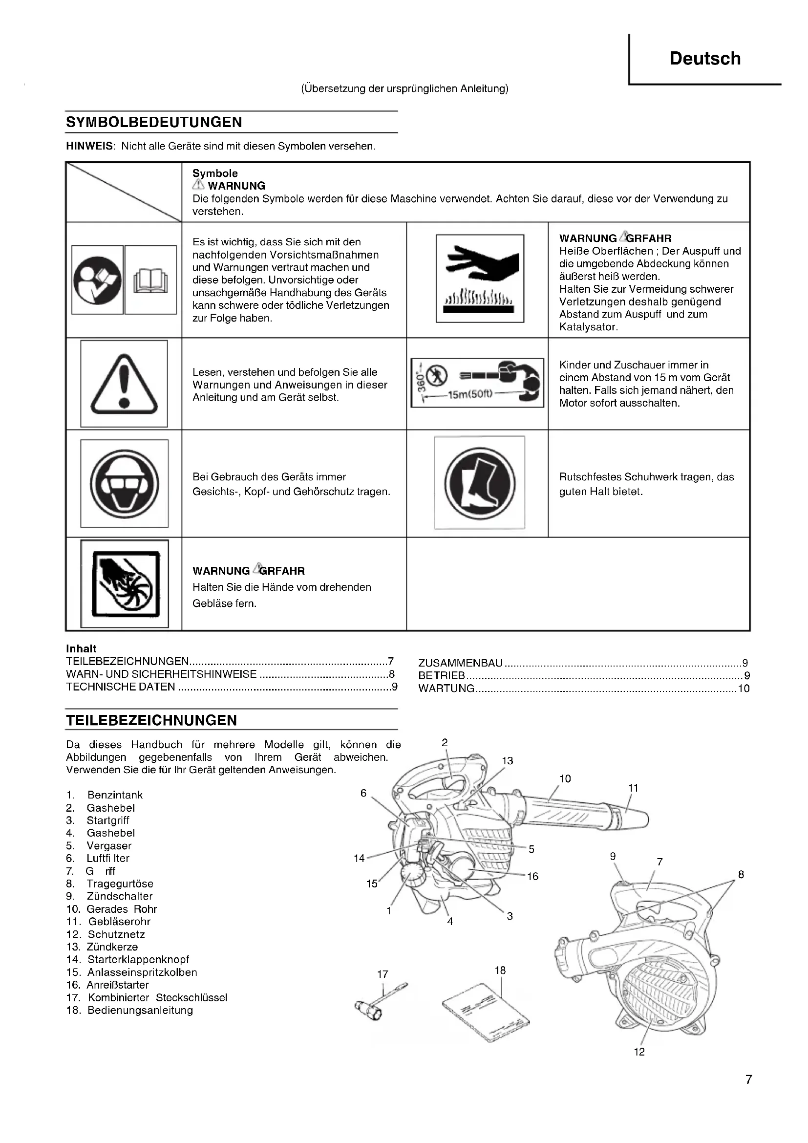 SYMBOLBEDEUTUNGEN HINWEIS: Nicht alle Geräte sind mit diesen Symbolen versehen. Symbole WARNUNG Die folgenden Symbole werden für diese Maschine verwendet. Achten Sie darauf, diese vor der Verwendung zu verstehen. Es ist wichtig, dass Sie sich mit den nachfolgenden Vorsichtsmaßnahmen und Warnungen vertraut machen und diese befolgen. Unvorsichtige oder unsachgemäße Handhabung des Geräts kann schwere oder tödliche Verletzungen zur Folge haben. WARNUNG GRFAHR Heiße Oberfl ächen ; Der Auspuff und die umgebende Abdeckung können äußerst heiß werden. Halten Sie zur Vermeidung schwerer Verletzungen deshalb genügend Abstand zum Auspuff und zum Katalysator. Lesen, verstehen und befolgen Sie alle Warnungen und Anweisungen in dieser Anleitung und am Gerät selbst. Kinder und Zuschauer immer in einem Abstand von 15 m vom Gerät halten. Falls sich jemand nähert, den Motor sofort ausschalten. Bei Gebrauch des Geräts immer Gesichts-, Kopf- und Gehörschutz tragen. Rutschfestes Schuhwerk tragen, das guten Halt bietet. WARNUNG GRFAHR Halten Sie die Hände vom drehenden Gebläse fern. Inhalt TEILEBEZEICHNUNGEN ..................................................................7