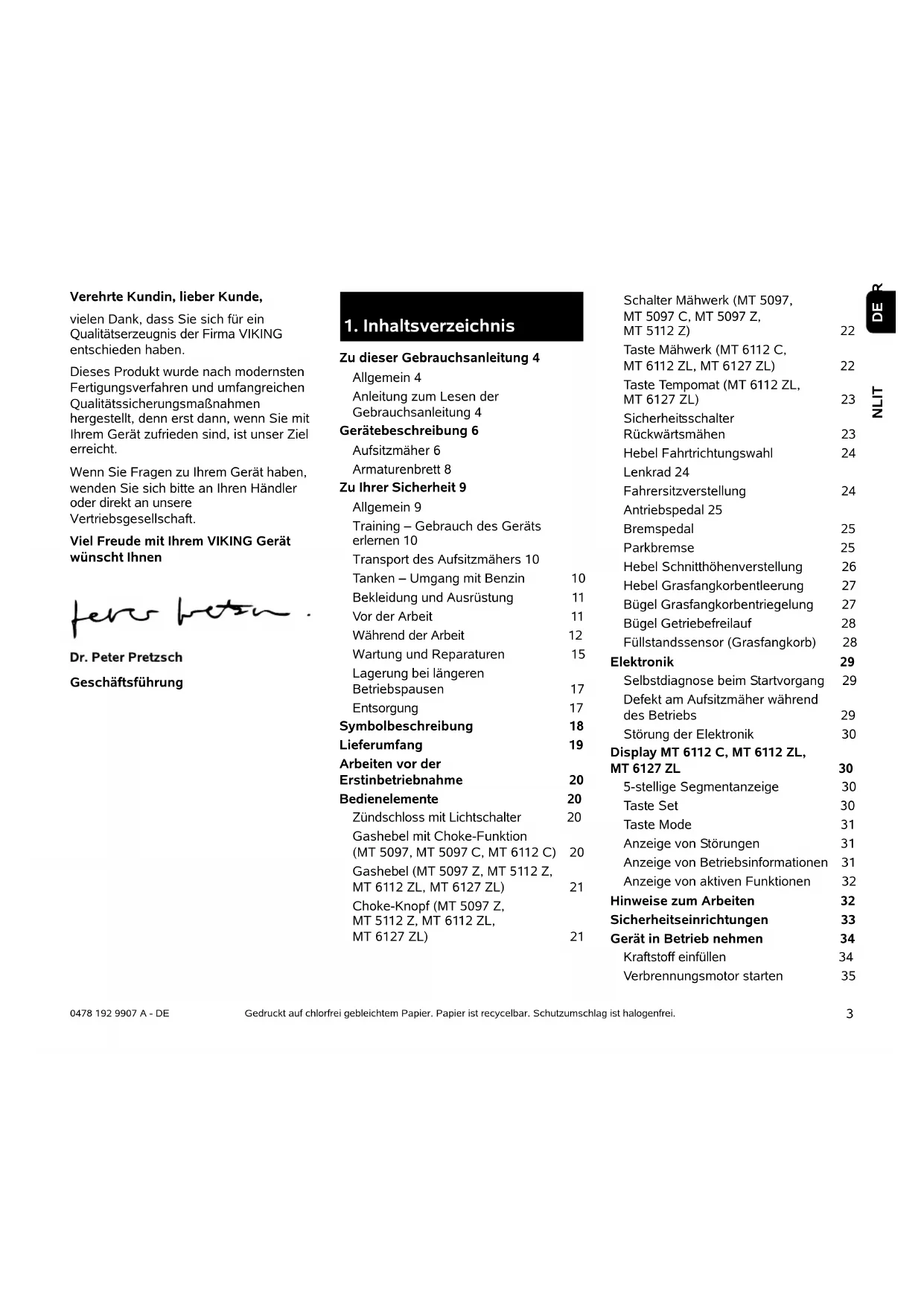 NLIT 0478 192 9907 A - DE Verehrte Kundin, lieber Kunde, vielen Dank, dass Sie sich für ein Qualitätserzeugnis der Firma VIKING entschieden haben. Dieses Produkt wurde nach modernsten Fertigungsverfahren und umfangreichen Qualitätssicherungsmaßnahmen hergestellt, denn erst dann, wenn Sie mit Ihrem Gerät zufrieden sind, ist unser Ziel erreicht. Wenn Sie Fragen zu Ihrem Gerät haben, wenden Sie sich bitte an Ihren Händler oder direkt an unsere Vertriebsgesellschaft. Viel Freude mit Ihrem VIKING Gerät wünscht Ihnen Geschäftsführung Gedruckt auf chlorfrei gebleichtem Papier. Papier ist recycelbar. Schutzumschlag ist halogenfrei.