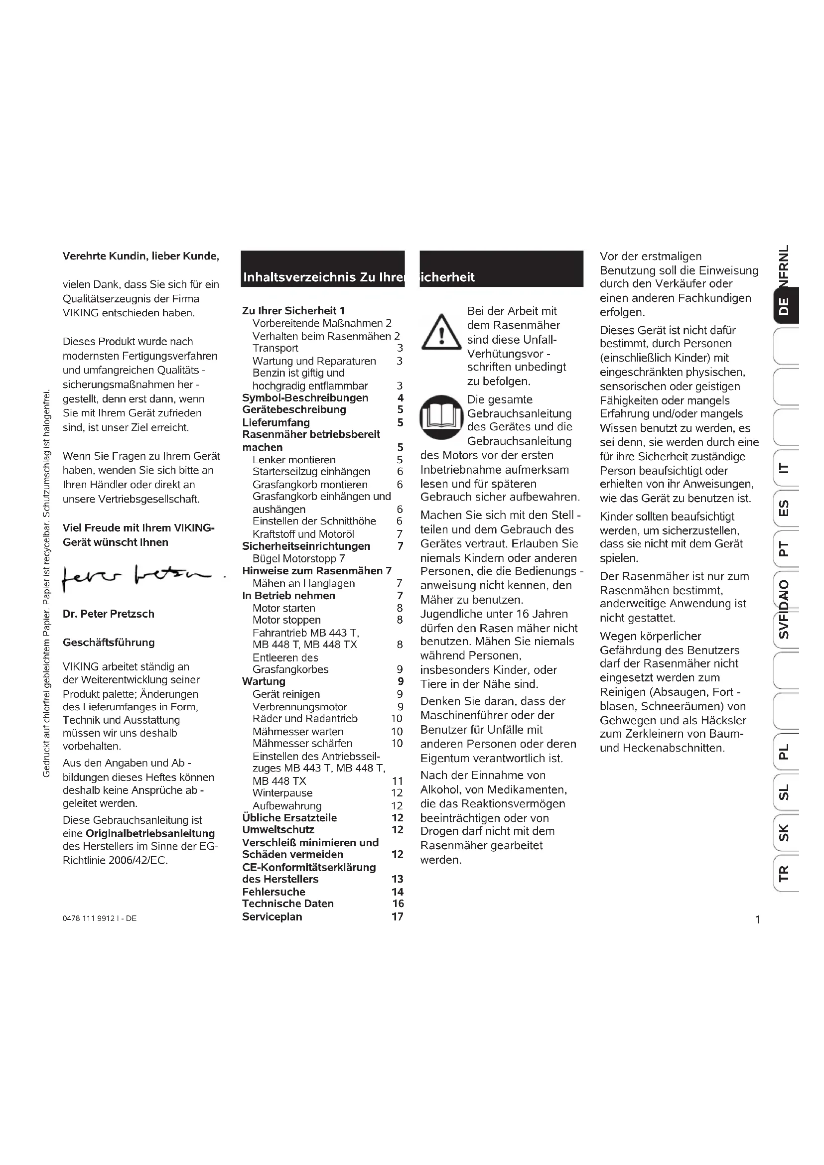 Bei der Arbeit mit dem Rasenmäher sind diese Unfall- Verhütungsvor - schriften unbedingt zu befolgen. Die gesamte Gebrauchsanleitung des Gerätes und die Gebrauchsanleitung des Motors vor der ersten Inbetriebnahme aufmerksam lesen und für späteren Gebrauch sicher aufbewahren. Machen Sie sich mit den Stell - teilen und dem Gebrauch des Gerätes vertraut. Erlauben Sie niemals Kindern oder anderen Personen, die die Bedienungs - anweisung nicht kennen, den Mäher zu benutzen. Jugendliche unter 16 Jahren dürfen den Rasen mäher nicht benutzen. Mähen Sie niemals während Personen, insbesonders Kinder, oder Tiere in der Nähe sind. Denken Sie daran, dass der Maschinenführer oder der Benutzer für Unfälle mit anderen Personen oder deren Eigentum verantwortlich ist. Nach der Einnahme von Alkohol, von Medikamenten, die das Reaktionsvermögen beeinträchtigen oder von Drogen darf nicht mit dem Rasenmäher gearbeitet werden. Verehrte Kundin, lieber Kunde, vielen Dank, dass Sie sich für ein Qualitätserzeugnis der Firma VIKING entschieden haben. Dieses Produkt wurde nach modernsten Fertigungsverfahren und umfangreichen Qualitäts - sicherungsmaßnahmen her - gestellt, denn erst dann, wenn Sie mit Ihrem Gerät zufrieden sind, ist unser Ziel erreicht. Wenn Sie Fragen zu Ihrem Gerät haben, wenden Sie sich bitte an Ihren Händler oder direkt an unsere Vertriebsgesellschaft. Viel Freude mit Ihrem VIKING- Gerät wünscht Ihnen Dr. Peter Pretzsch Geschäftsführung VIKING arbeitet ständig an der Weiterentwicklung seiner Produkt palette; Änderungen des Lieferumfanges in Form, Technik und Ausstattung müssen wir uns deshalb vorbehalten. Aus den Angaben und Ab - bildungen dieses Heftes können deshalb keine Ansprüche ab - geleitet werden. Diese Gebrauchsanleitung ist eine Originalbetriebsanleitung des Herstellers im Sinne der EG- Richtlinie 2006/42/EC. Inhaltsverzeichnis Zu Ihrer Sicherheit Zu Ihrer Sicherheit 1 Vorbereitende Maßnahmen 2 Verhalten beim Rasenmähen 2 Transport 3 Wartung und Reparaturen 3 Benzin ist giftig und hochgradig entflammbar 3 Symbol-Beschreibungen 4 Gerätebeschreibung 5 Lieferumfang 5 Rasenmäher betriebsbereit machen 5 Lenker montieren 5 Starterseilzug einhängen 6 Grasfangkorb montieren 6 Grasfangkorb einhängen und aushängen 6 Einstellen der Schnitthöhe 6 Kraftstoff und Motoröl 7 Sicherheitseinrichtungen 7 Bügel Motorstopp 7 Hinweise zum Rasenmähen 7 Mähen an Hanglagen 7 In Betrieb nehmen 7 Motor starten 8 Motor stoppen 8 Fahrantrieb MB 443 T, MB 448 T, MB 448 TX 8 Entleeren des Grasfangkorbes 9 Wartung 9 Gerät reinigen 9 Verbrennungsmotor 9 Räder und Radantrieb 10 Mähmesser warten 10 Mähmesser schärfen 10 Einstellen des Antriebsseil- zuges MB 443 T, MB 448 T, MB 448 TX 11 Winterpause 12 Aufbewahrung 12 Übliche Ersatzteile 12 Umweltschutz 12 Verschleiß minimieren und Schäden vermeiden 12 CE-Konformitätserklärung des Herstellers 13 Fehlersuche 14 Technische Daten 16 Serviceplan 17 Vor der erstmaligen Benutzung soll die Einweisung durch den Verkäufer oder einen anderen Fachkundigen erfolgen. Dieses Gerät ist nicht dafür bestimmt, durch Personen (einschließlich Kinder) mit eingeschränkten physischen, sensorischen oder geistigen Fähigkeiten oder mangels Erfahrung und/oder mangels Wissen benutzt zu werden, es sei denn, sie werden durch eine für ihre Sicherheit zuständige Person beaufsichtigt oder erhielten von ihr Anweisungen, wie das Gerät zu benutzen ist. Kinder sollten beaufsichtigt werden, um sicherzustellen, dass sie nicht mit dem Gerät spielen. Der Rasenmäher ist nur zum Rasenmähen bestimmt, anderweitige Anwendung ist nicht gestattet. Wegen körperlicher Gefährdung des Benutzers darf der Rasenmäher nicht eingesetzt werden zum Reinigen (Absaugen, Fort - blasen, Schneeräumen) von Gehwegen und als Häcksler zum Zerkleinern von Baum- und Heckenabschnitten. Gedruckt auf chlorfrei gebleichtem Papier. Papier ist recycelbar. Schutzumschlag ist halogenfrei.2 0478 111 9912 I - DE
