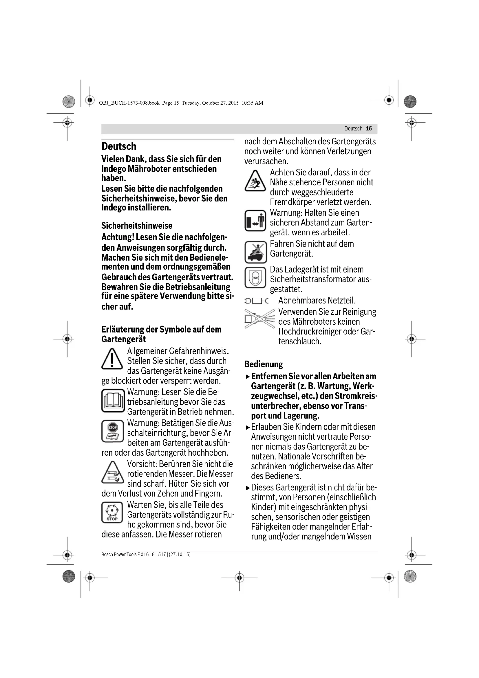 OBJ_BUCH-1573-008.book Page 14 Tuesday, October 27, 2015 10:35 AMDeutsch | 15 Bosch Power Tools F 016 L81 517 | (27.10.15) Deutsch Vielen Dank, dass Sie sich für den Indego Mähroboter entschieden haben. Lesen Sie bitte die nachfolgenden Sicherheitshinweise, bevor Sie den Indego installieren. Sicherheitshinweise Achtung! Lesen Sie die nachfolgen- den Anweisungen sorgfältig durch. Machen Sie sich mit den Bedienele- menten und dem ordnungsgemäßen Gebrauch des Gartengeräts vertraut. Bewahren Sie die Betriebsanleitung für eine spätere Verwendung bitte si- cher auf. Erläuterung der Symbole auf dem Gartengerät Allgemeiner Gefahrenhinweis. Stellen Sie sicher, dass durch das Gartengerät keine Ausgän- ge blockiert oder versperrt werden. Warnung: Lesen Sie die Be- triebsanleitung bevor Sie das Gartengerät in Betrieb nehmen. Warnung: Betätigen Sie die Aus- schalteinrichtung, bevor Sie Ar- beiten am Gartengerät ausfüh- ren oder das Gartengerät hochheben. Vorsicht: Berühren Sie nicht die rotierenden Messer. Die Messer sind scharf. Hüten Sie sich vor dem Verlust von Zehen und Fingern. Warten Sie, bis alle Teile des Gartengeräts vollständig zur Ru- he gekommen sind, bevor Sie diese anfassen. Die Messer rotieren nach dem Abschalten des Gartengeräts noch weiter und können Verletzungen verursachen. Achten Sie darauf, dass in der Nähe stehende Personen nicht durch weggeschleuderte Fremdkörper verletzt werden. Warnung: Halten Sie einen sicheren Abstand zum Garten- gerät, wenn es arbeitet. Fahren Sie nicht auf dem Gartengerät. Das Ladegerät ist mit einem Sicherheitstransformator aus- gestattet. Abnehmbares Netzteil. Verwenden Sie zur Reinigung des Mähroboters keinen Hochdruckreiniger oder Gar- tenschlauch. Bedienung