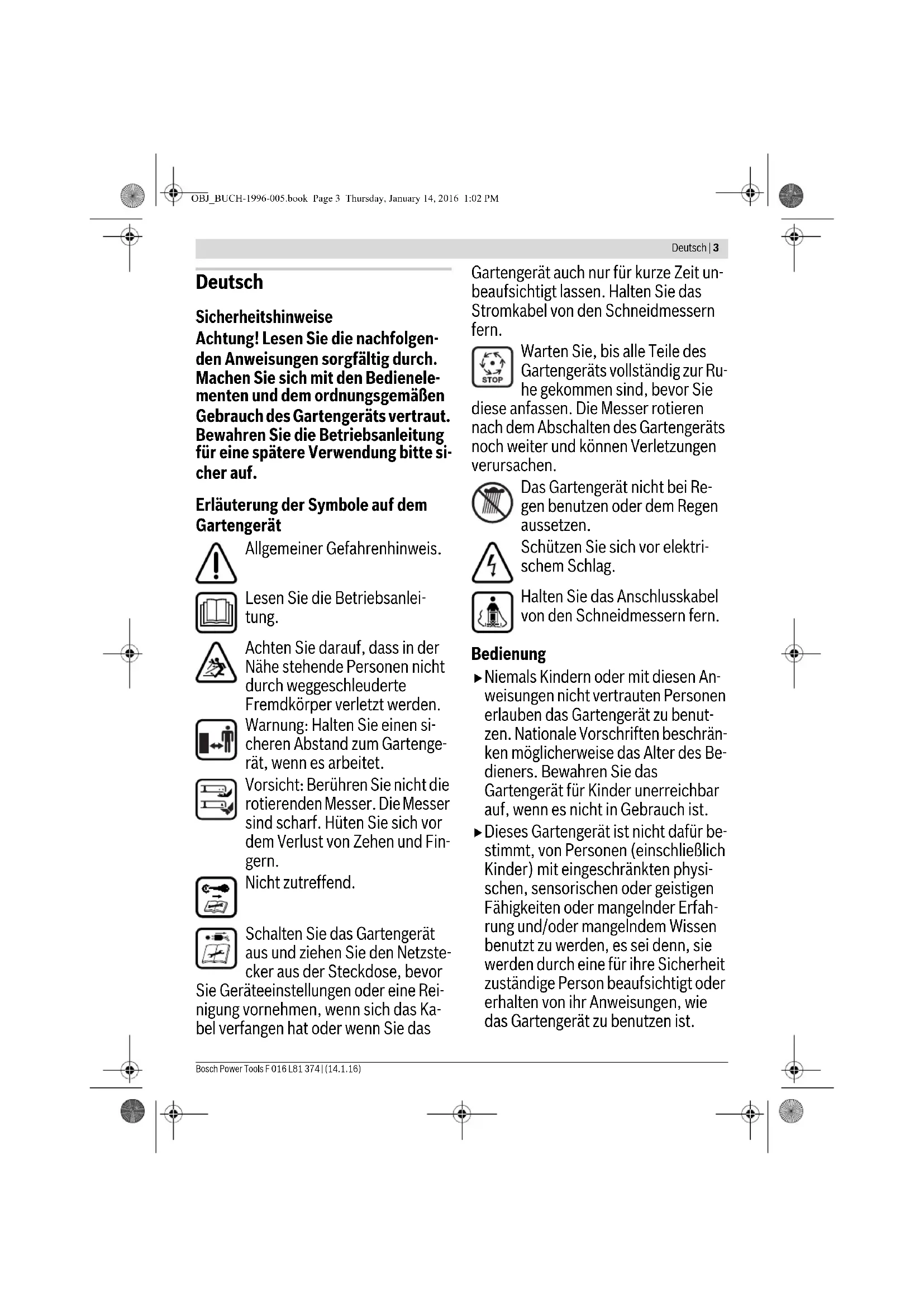 ro Instrucţiuni originale bg Оригинална инструкция mk Оригинално упатство за работа sr Originalno uputstvo za rad sl Izvirna navodila hr Originalne upute za rad et Algupärane kasutusjuhend lv Instrukcijas oriģinālvalodā lt Originali instrukcija Дата производства: Өндірілген уақыты: OBJ_DOKU-35583-005.fm Page 1 Thursday, January 14, 2016 1:12 PM2 | F 016 L81 374 | (14.1.16) Bosch Power Tools Deutsch . . . . . . . . . . . . . . . . . . . . . . . . . . . . . . . . . . . . . . . . . Seite 3 English . . . . . . . . . . . . . . . . . . . . . . . . . . . . . . . . . . . . . . . . . . Page 10 Français . . . . . . . . . . . . . . . . . . . . . . . . . . . . . . . . . . . . . . . . . Page 16 Español . . . . . . . . . . . . . . . . . . . . . . . . . . . . . . . . . . . . . . . . Página 23 Português. . . . . . . . . . . . . . . . . . . . . . . . . . . . . . . . . . . . . . . Página 30 Italiano . . . . . . . . . . . . . . . . . . . . . . . . . . . . . . . . . . . . . . . . . Pagina 37 Nederlands . . . . . . . . . . . . . . . . . . . . . . . . . . . . . . . . . . . . . Pagina 44 Dansk . . . . . . . . . . . . . . . . . . . . . . . . . . . . . . . . . . . . . . . . . . . Side 51 Svenska . . . . . . . . . . . . . . . . . . . . . . . . . . . . . . . . . . . . . . . . . Sida 57 Norsk . . . . . . . . . . . . . . . . . . . . . . . . . . . . . . . . . . . . . . . . . . . Side 63 Suomi. . . . . . . . . . . . . . . . . . . . . . . . . . . . . . . . . . . . . . . . . . . . Sivu 69 Ελληνικά. . . . . . . . . . . . . . . . . . . . . . . . . . . . . . . . . . . . . . . . Σελίδα 75 Türkçe . . . . . . . . . . . . . . . . . . . . . . . . . . . . . . . . . . . . . . . . . Sayfa 82 Polski . . . . . . . . . . . . . . . . . . . . . . . . . . . . . . . . . . . . . . . . . . Strona 89 Česky . . . . . . . . . . . . . . . . . . . . . . . . . . . . . . . . . . . . . . . . . . Strana 96 Slovensky. . . . . . . . . . . . . . . . . . . . . . . . . . . . . . . . . . . . . . . Strana 102 Magyar . . . . . . . . . . . . . . . . . . . . . . . . . . . . . . . . . . . . . . . . . . Oldal 110 Русский . . . . . . . . . . . . . . . . . . . . . . . . . . . . . . . . . . . . . Страница 117 Українська. . . . . . . . . . . . . . . . . . . . . . . . . . . . . . . . . . . Сторінка 125 Қазақша. . . . . . . . . . . . . . . . . . . . . . . . . . . . . . . . . . . . . . . . . . .Бет 133 Română . . . . . . . . . . . . . . . . . . . . . . . . . . . . . . . . . . . . . . . . Pagina 141 Български . . . . . . . . . . . . . . . . . . . . . . . . . . . . . . . . . . . Страница 148 Македонски . . . . . . . . . . . . . . . . . . . . . . . . . . . . . . . . . . . Страна 156 Srpski. . . . . . . . . . . . . . . . . . . . . . . . . . . . . . . . . . . . . . . . . . Strana 162 Slovensko . . . . . . . . . . . . . . . . . . . . . . . . . . . . . . . . . . . . . . . Stran 168 Hrvatski . . . . . . . . . . . . . . . . . . . . . . . . . . . . . . . . . . . . . . Stranica 174 Eesti . . . . . . . . . . . . . . . . . . . . . . . . . . . . . . . . . . . . . . . . . Lehekülg 180 Latviešu . . . . . . . . . . . . . . . . . . . . . . . . . . . . . . . . . . . . . . Lappuse 187 Lietuviškai . . . . . . . . . . . . . . . . . . . . . . . . . . . . . . . . . . . . Puslapis 194 OBJ_BUCH-1996-005.book Page 2 Thursday, January 14, 2016 1:02 PMDeutsch | 3 Bosch Power Tools F 016 L81 374 | (14.1.16) Deutsch Sicherheitshinweise Achtung! Lesen Sie die nachfolgen- den Anweisungen sorgfältig durch. Machen Sie sich mit den Bedienele- menten und dem ordnungsgemäßen Gebrauch des Gartengeräts vertraut. Bewahren Sie die Betriebsanleitung für eine spätere Verwendung bitte si- cher auf. Erläuterung der Symbole auf dem Gartengerät Allgemeiner Gefahrenhinweis. Lesen Sie die Betriebsanlei- tung. Achten Sie darauf, dass in der Nähe stehende Personen nicht durch weggeschleuderte Fremdkörper verletzt werden. Warnung: Halten Sie einen si- cheren Abstand zum Gartenge- rät, wenn es arbeitet. Vorsicht: Berühren Sie nicht die rotierenden Messer. Die Messer sind scharf. Hüten Sie sich vor dem Verlust von Zehen und Fin- gern. Nicht zutreffend. Schalten Sie das Gartengerät aus und ziehen Sie den Netzste- cker aus der Steckdose, bevor Sie Geräteeinstellungen oder eine Rei- nigung vornehmen, wenn sich das Ka- bel verfangen hat oder wenn Sie das Gartengerät auch nur für kurze Zeit un- beaufsichtigt lassen. Halten Sie das Stromkabel von den Schneidmessern fern. Warten Sie, bis alle Teile des Gartengeräts vollständig zur Ru- he gekommen sind, bevor Sie diese anfassen. Die Messer rotieren nach dem Abschalten des Gartengeräts noch weiter und können Verletzungen verursachen. Das Gartengerät nicht bei Re- gen benutzen oder dem Regen aussetzen. Schützen Sie sich vor elektri- schem Schlag. Halten Sie das Anschlusskabel von den Schneidmessern fern. Bedienung