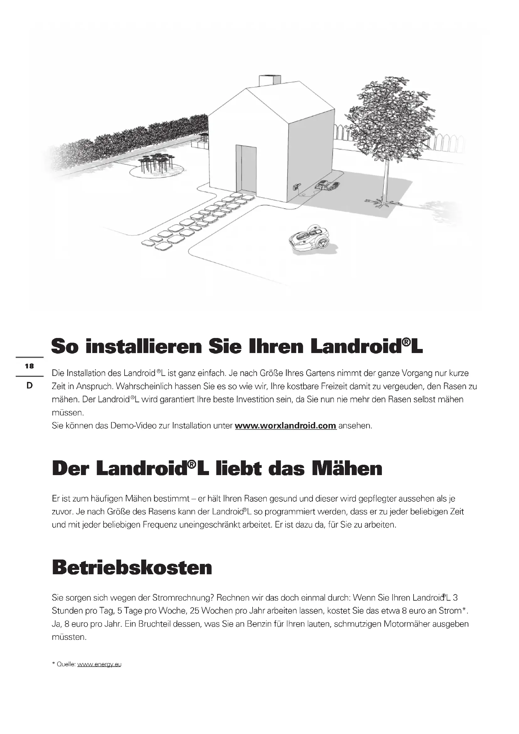 L wird garantiert Ihre beste Investition sein, da Sie nun nie mehr den Rasen selbst mähen müssen. Sie können das Demo-Video zur Installation unter www.worxlandroid.com ansehen. Der Landroid
