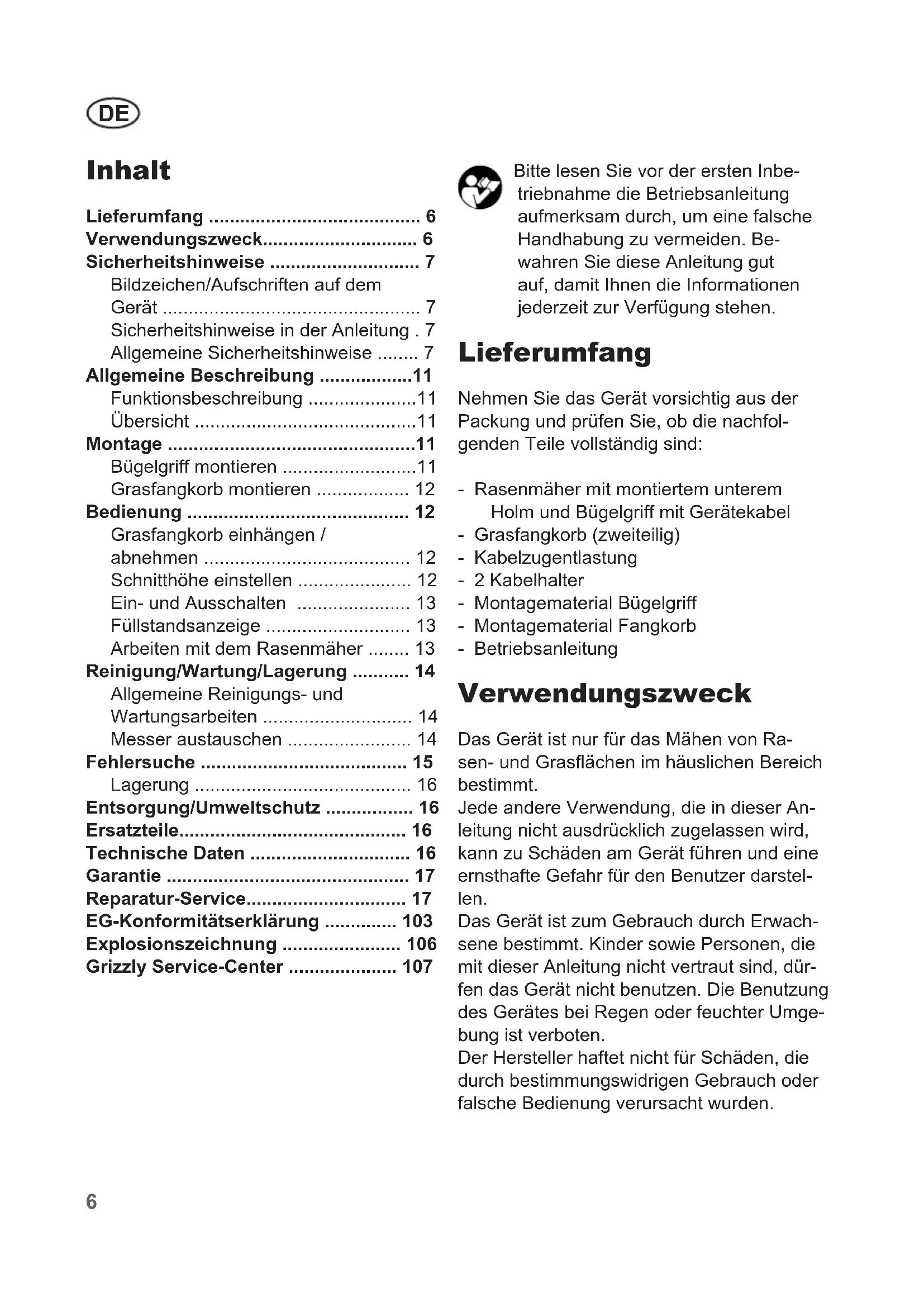 - Grizzly Service-Center Bitte lesen Sie vor der ersten Inbe- triebnahme die Betriebsanleitung aufmerksam durch, um eine falsche Handhabung zu vermeiden. Be- wahren Sie diese Anleitung gut auf, damit Ihnen die Informationen jederzeit zur Verfügung stehen. Lieferumfang Nehmen Sie das Gerät vorsichtig aus der Packung und prüfen Sie, ob die nachfol- genden Teile vollständig sind: - Rasenmäher mit montiertem unterem Holm und Bügelgriff mit Gerätekabel - Grasfangkorb (zweiteilig) - Kabelzugentlastung - 2 Kabelhalter - Montagematerial Bügelgriff - Montagematerial Fangkorb - Betriebsanleitung Verwendungszweck Das Gerät ist nur für das Mähen von Ra- sen- und Grasächen im häuslichen Bereich bestimmt. Jede andere Verwendung, die in dieser An- leitung nicht ausdrücklich zugelassen wird, kann zu Schäden am Gerät führen und eine ernsthafte Gefahr für den Benutzer darstel- len. Das Gerät ist zum Gebrauch durch Erwach- sene bestimmt. Kinder sowie Personen, die mit dieser Anleitung nicht vertraut sind, dür- fen das Gerät nicht benutzen. Die Benutzung des Gerätes bei Regen oder feuchter Umge- bung ist verboten. Der Hersteller haftet nicht für Schäden, die durch bestimmungswidrigen Gebrauch oder falsche Bedienung verursacht wurden.DE p. 107