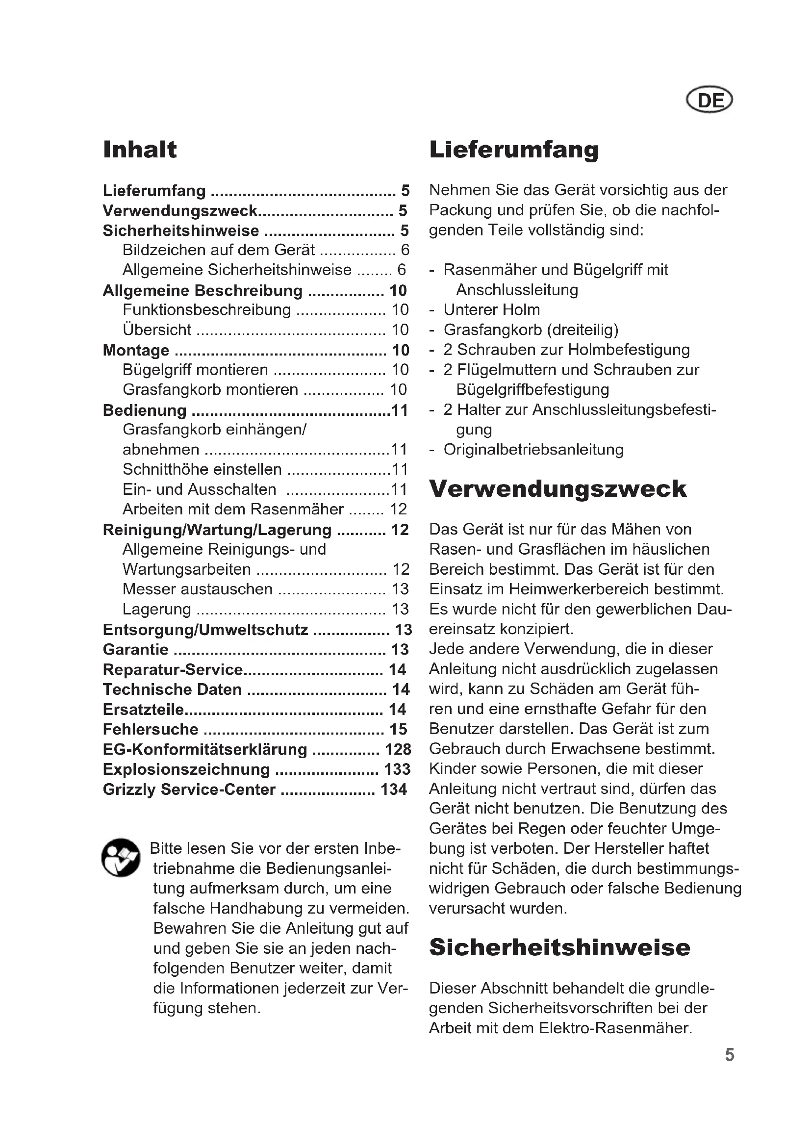 - Grizzly Service-Center Bitte lesen Sie vor der ersten Inbe- triebnahme die Bedienungsanlei- tung aufmerksam durch, um eine falsche Handhabung zu vermeiden. Bewahren Sie die Anleitung gut auf und geben Sie sie an jeden nach- folgenden Benutzer weiter, damit die Informationen jederzeit zur Ver- fügung stehen. Lieferumfang Nehmen Sie das Gerät vorsichtig aus der Packung und prüfen Sie, ob die nachfol- genden Teile vollständig sind: - Rasenmäher und Bügelgriff mit Anschlussleitung - Unterer Holm - Grasfangkorb (dreiteilig) - 2 Schrauben zur Holmbefestigung - 2 Flügelmuttern und Schrauben zur Bügelgriffbefestigung - 2 Halter zur Anschlussleitungsbefesti- gung - Originalbetriebsanleitung Verwendungszweck Das Gerät ist nur für das Mähen von Rasen- und Grasächen im häuslichen Bereich bestimmt. Das Gerät ist für den Einsatz im Heimwerkerbereich bestimmt. Es wurde nicht für den gewerblichen Dau- ereinsatz konzipiert. Jede andere Verwendung, die in dieser Anleitung nicht ausdrücklich zugelassen wird, kann zu Schäden am Gerät füh- ren und eine ernsthafte Gefahr für den Benutzer darstellen. Das Gerät ist zum Gebrauch durch Erwachsene bestimmt. Kinder sowie Personen, die mit dieser Anleitung nicht vertraut sind, dürfen das Gerät nicht benutzen. Die Benutzung des Gerätes bei Regen oder feuchter Umge- bung ist verboten. Der Hersteller haftet nicht für Schäden, die durch bestimmungs- widrigen Gebrauch oder falsche Bedienung verursacht wurden. Sicherheitshinweise Dieser Abschnitt behandelt die grundle- genden Sicherheitsvorschriften bei der Arbeit mit dem Elektro-Rasenmäher.DE p. 134