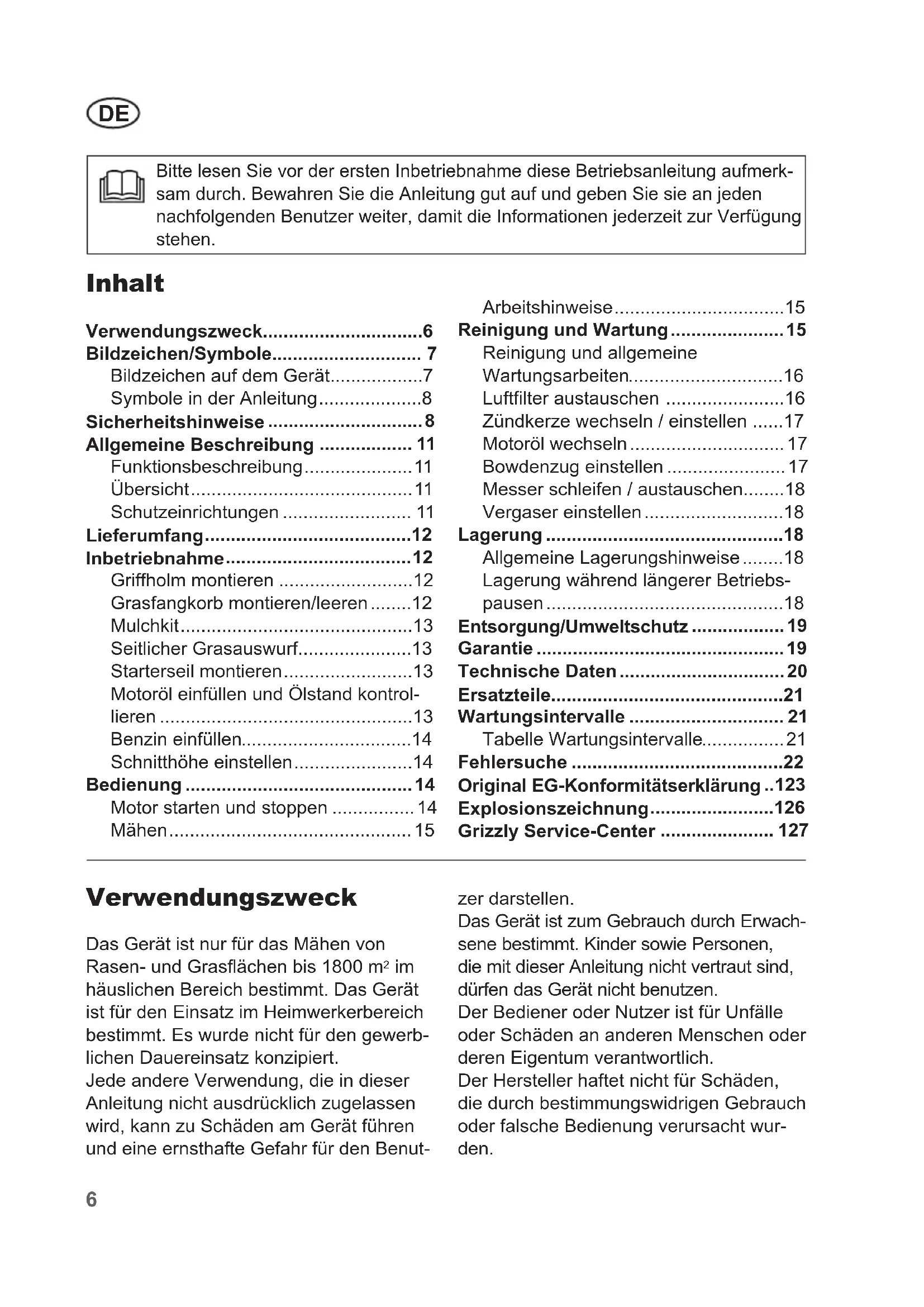 - Führen Sie Gerät, Zubehör und Verpa- ckung einer umweltgerechten Wieder- verwertung zu. - Entleeren Sie den Benzin- und Öl- tank sorgfältig und geben Sie Ihr Gerät an einer Verwertungsstelle ab. Die verwendeten Kunststoff- und Metallteile können sortenrein ge- trennt werden und so einer Wieder- verwertung zugeführt werden. - Geben Sie Altöl und Benzinreste an einer Entsorgungsstelle ab und schütten diese nicht in die Kanalisati- on oder in den Abuss. - Fragen Sie hierzu Ihren Grizzly- Händler.