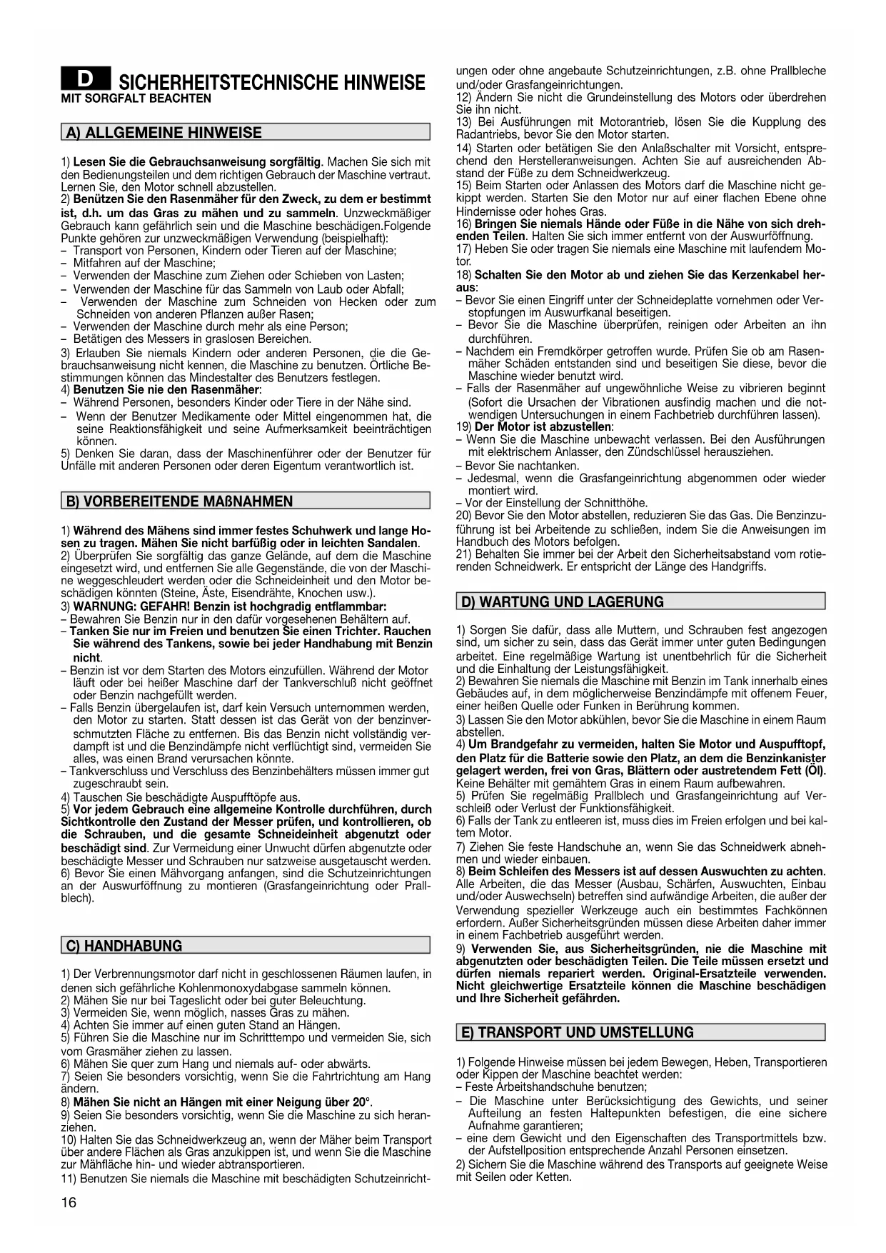 15) Beim Starten oder Anlassen des Motors darf die Maschine nicht ge-