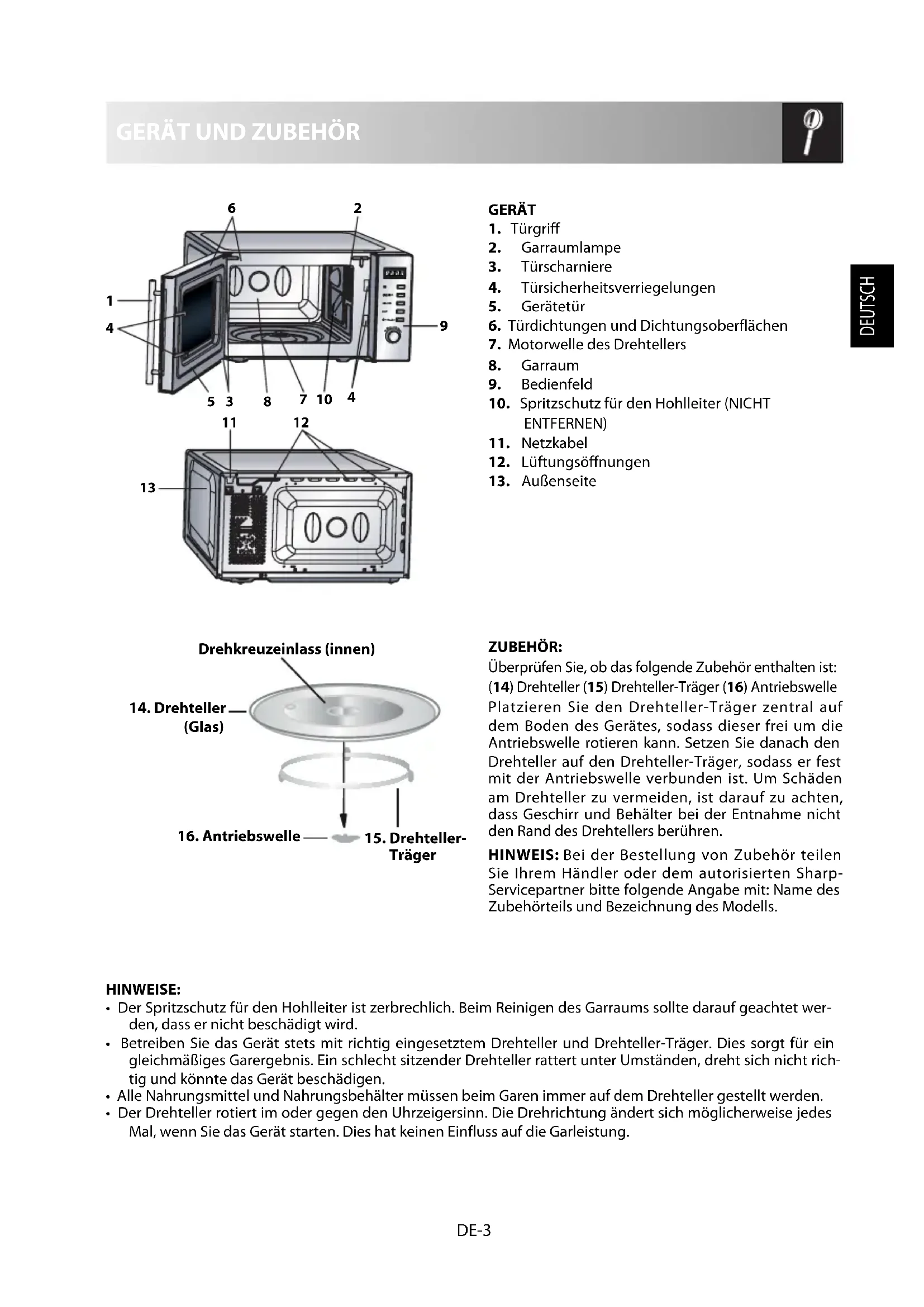 ZUBEHÖR: Überprüfen Sie, ob das folgende Zubehör enthalten ist: (14) Drehteller (15) Drehteller-Träger (16) Antriebswelle Platzieren Sie den Drehteller-Träger zentral auf dem Boden des Gerätes, sodass dieser frei um die Antriebswelle rotieren kann. Setzen Sie danach den Drehteller auf den Drehteller-Träger, sodass er fest mit der Antriebswelle verbunden ist. Um Schäden am Drehteller zu vermeiden, ist darauf zu achten, dass Geschirr und Behälter bei der Entnahme nicht den Rand des Drehtellers berühren. HINWEIS: Bei der Bestellung von Zubehör teilen Sie Ihrem Händler oder dem autorisierten Sharp- Servicepartner bitte folgende Angabe mit: Name des Zubehörteils und Bezeichnung des Modells. HINWEISE: